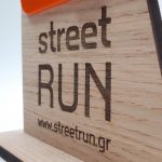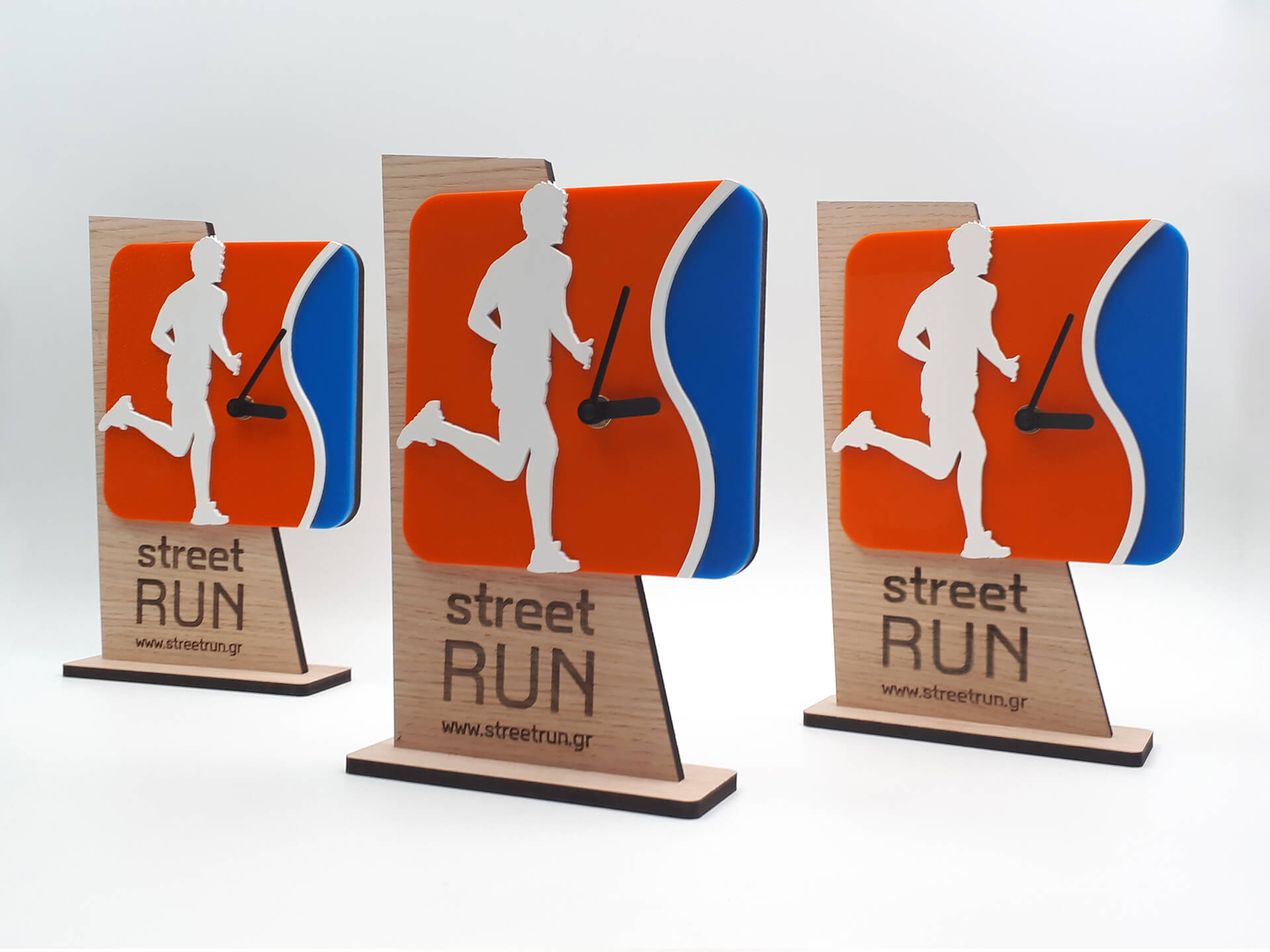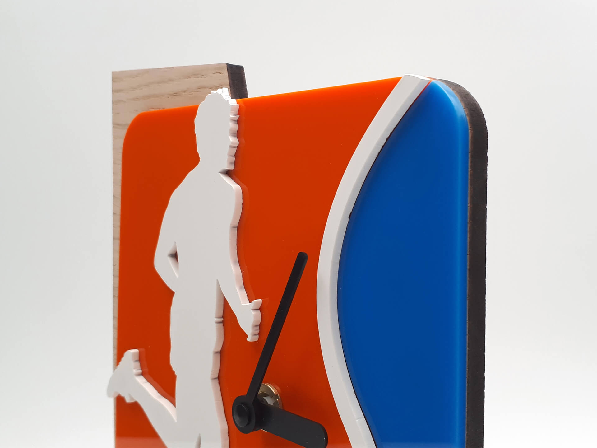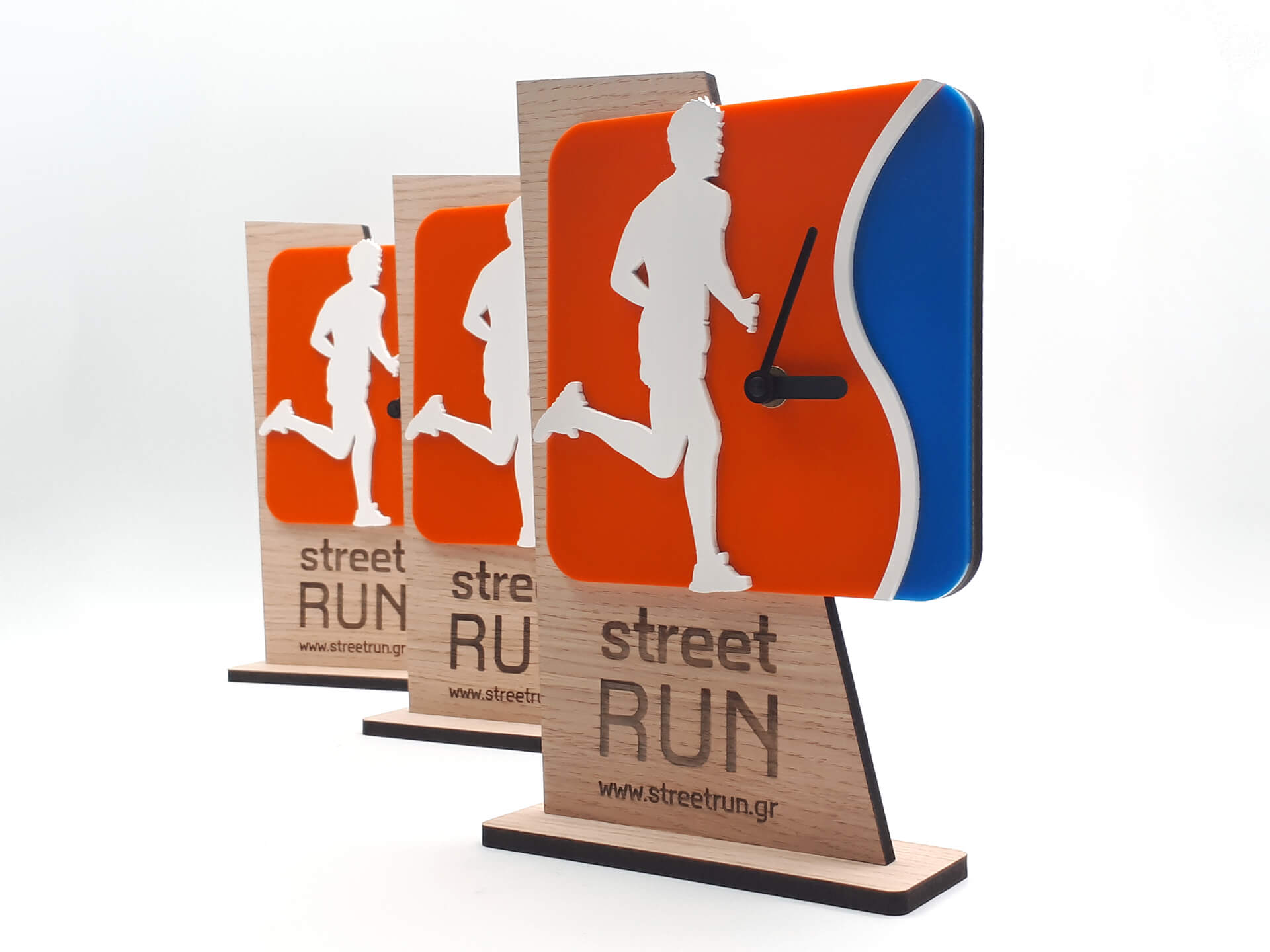 Επιτραπέζιο ρολόι για την Street Run • Υλικά: MDF Δρυς πάχους 9mm, χρωματιστό ακρυλικό πάχους 3mm