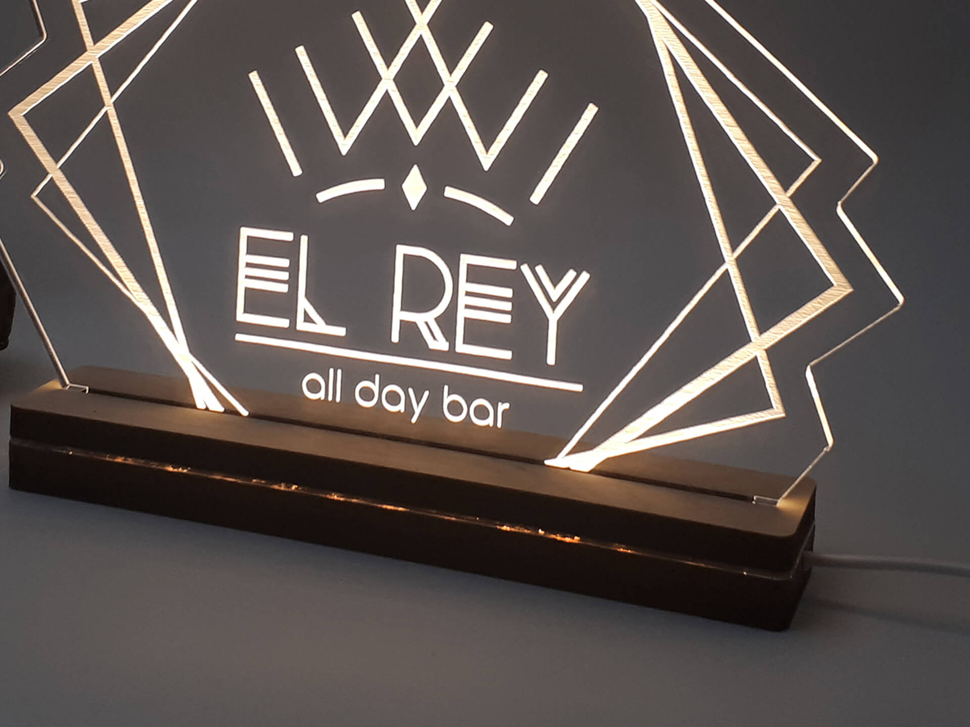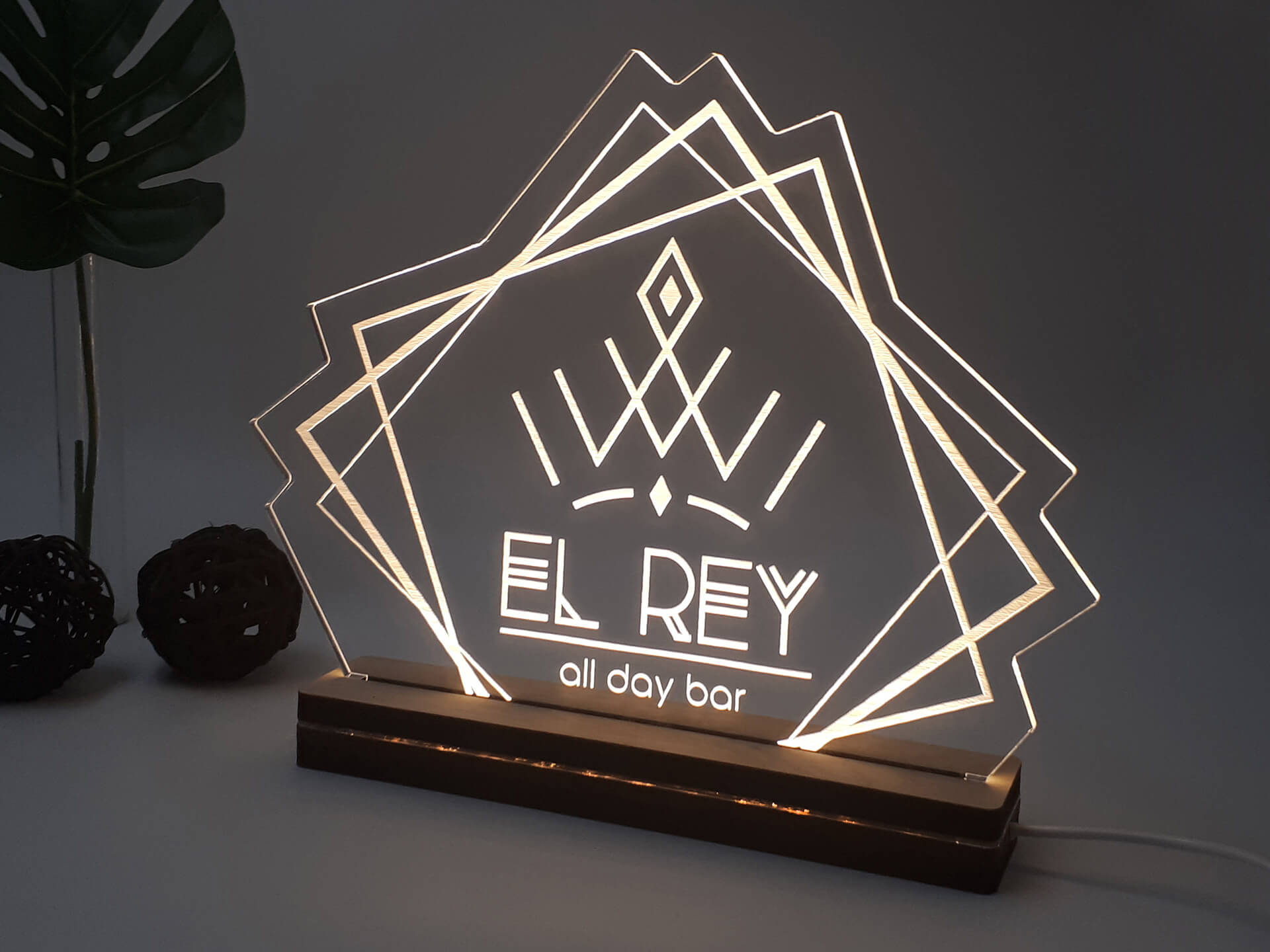 Φωτιστικό Led βασισμένο στο δικό σας λογότυπο! • Υλικά: Led λευκού χρώματος, Ακρυλικό διάφανο πάχους 6mm, Ξύλινη custom βάση • Περιέχει καλώδιο USB με φισάκι πρίζας • Το προϊόν διατίθεται σε συσκευασία δώρου