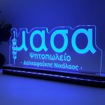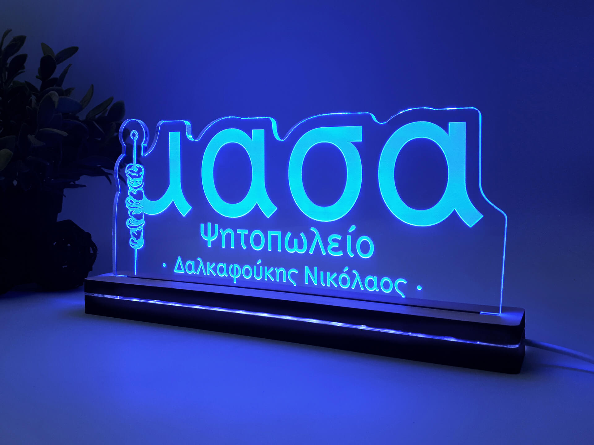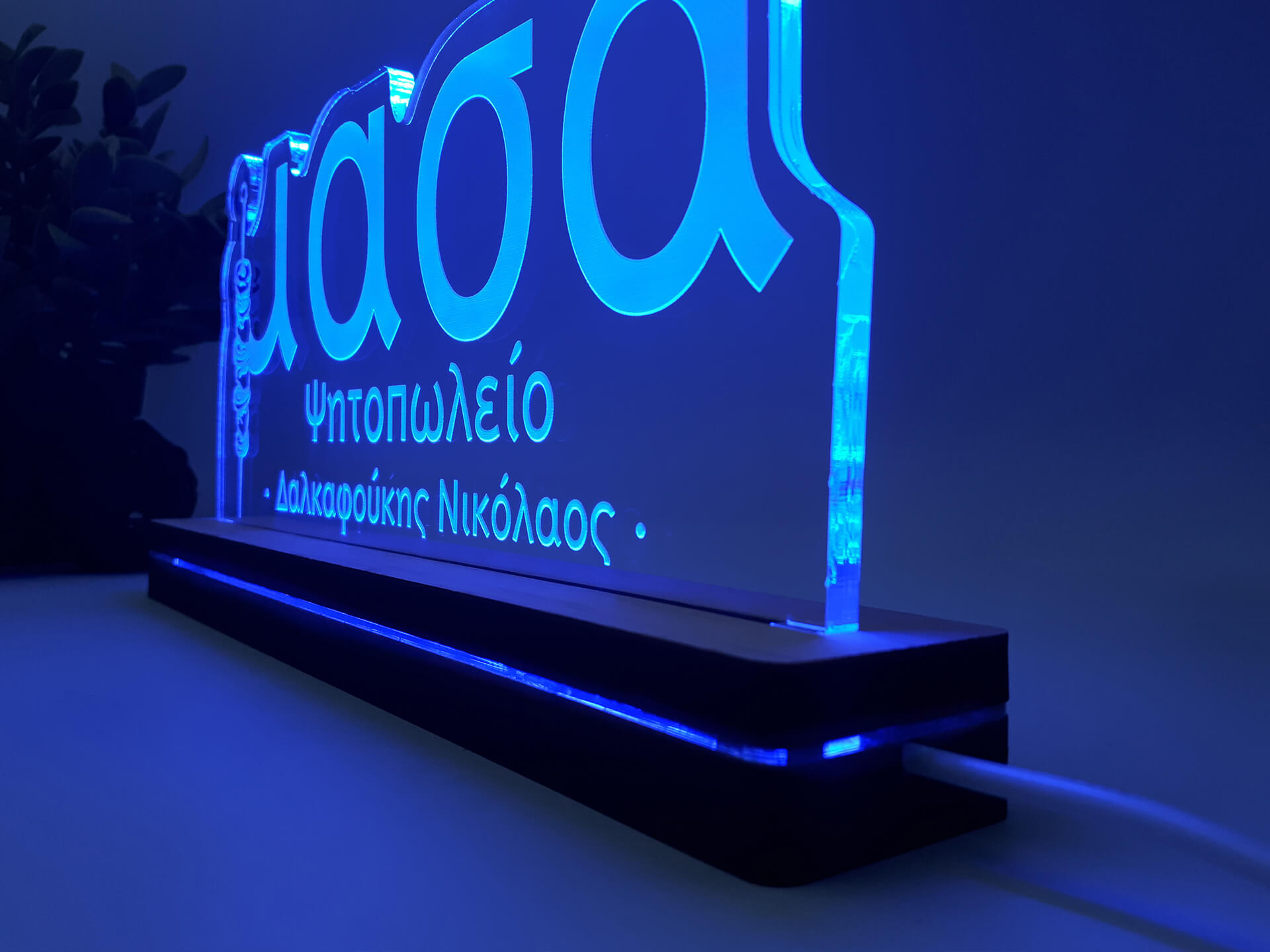 Φωτιστικό Led βασισμένο στο δικό σας λογότυπο! • Υλικά: Led μπλέ χρώματος, Ακρυλικό διάφανο πάχους 6mm, Ξύλινη custom βάση • Περιέχει καλώδιο USB με φισάκι πρίζας • Το προϊόν διατίθεται σε συσκευασία δώρου