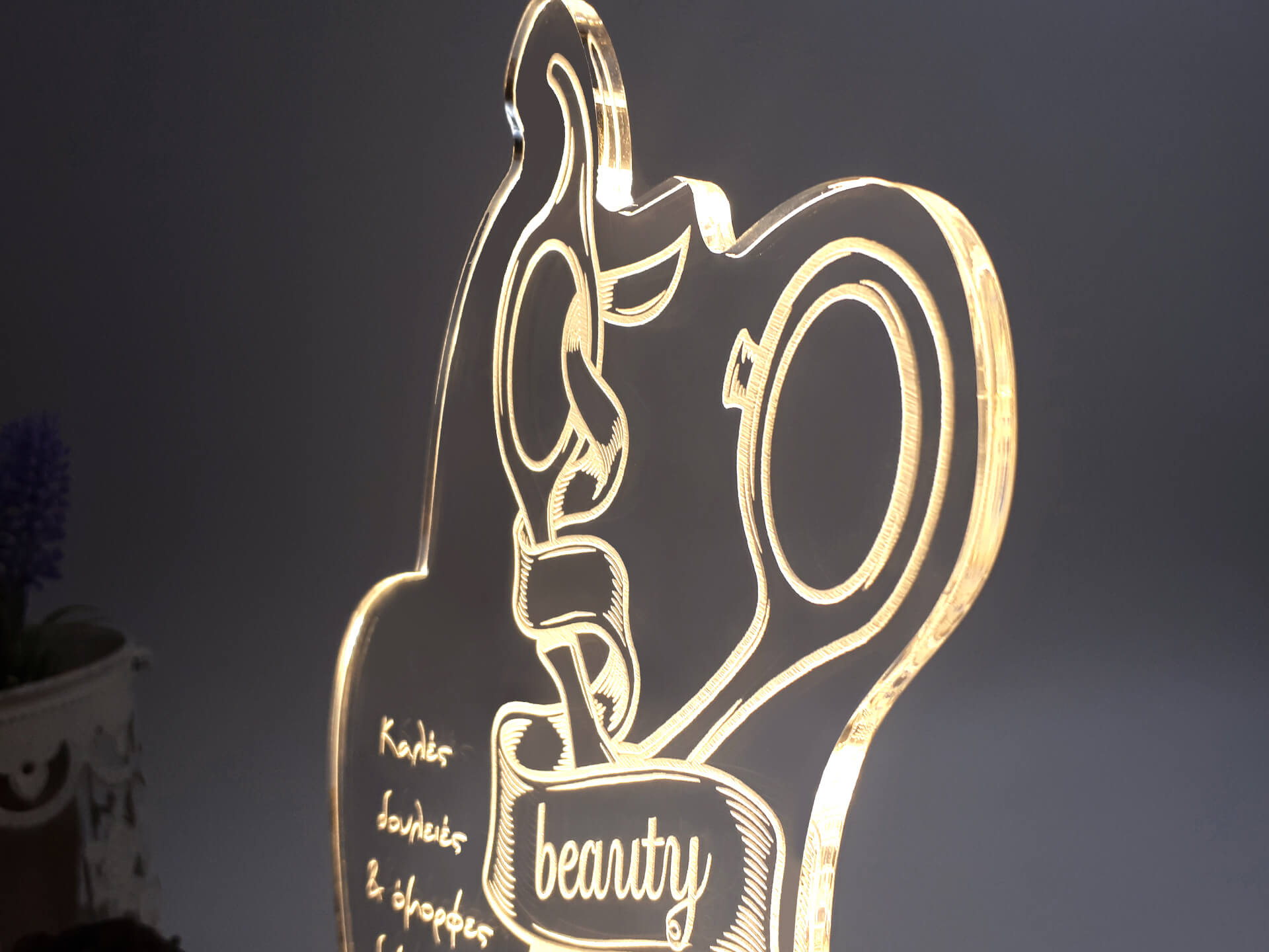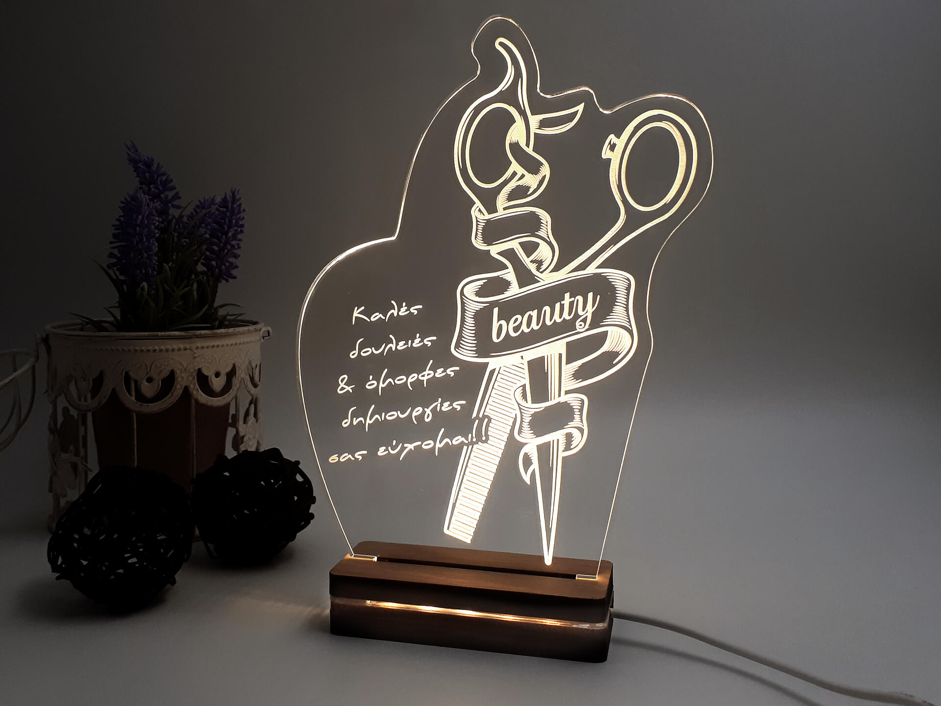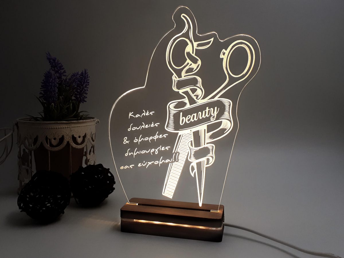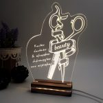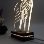 Φωτιστικό Led με δικό σας σχέδιο και αφιέρωση! • Υλικά: Led λευκού χρώματος, Ακρυλικό διάφανο πάχους 6mm, Ξύλινη custom βάση • Περιέχει καλώδιο USB με φισάκι πρίζας • Το προϊόν διατίθεται σε συσκευασία δώρου