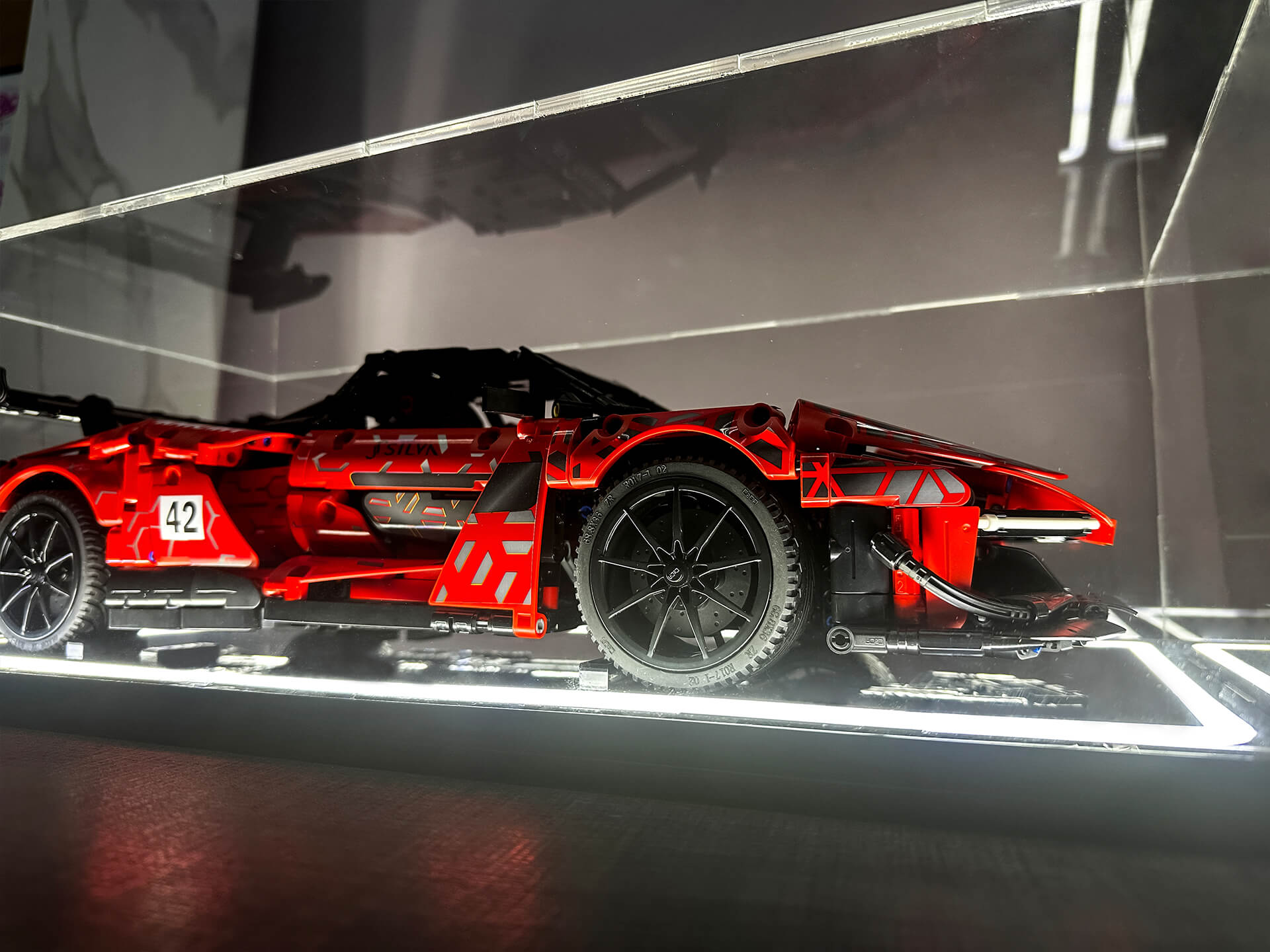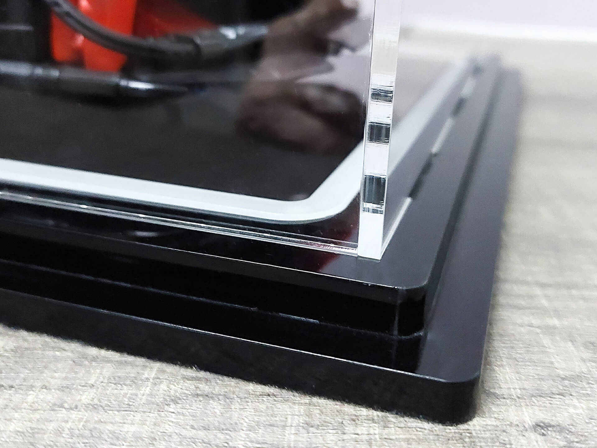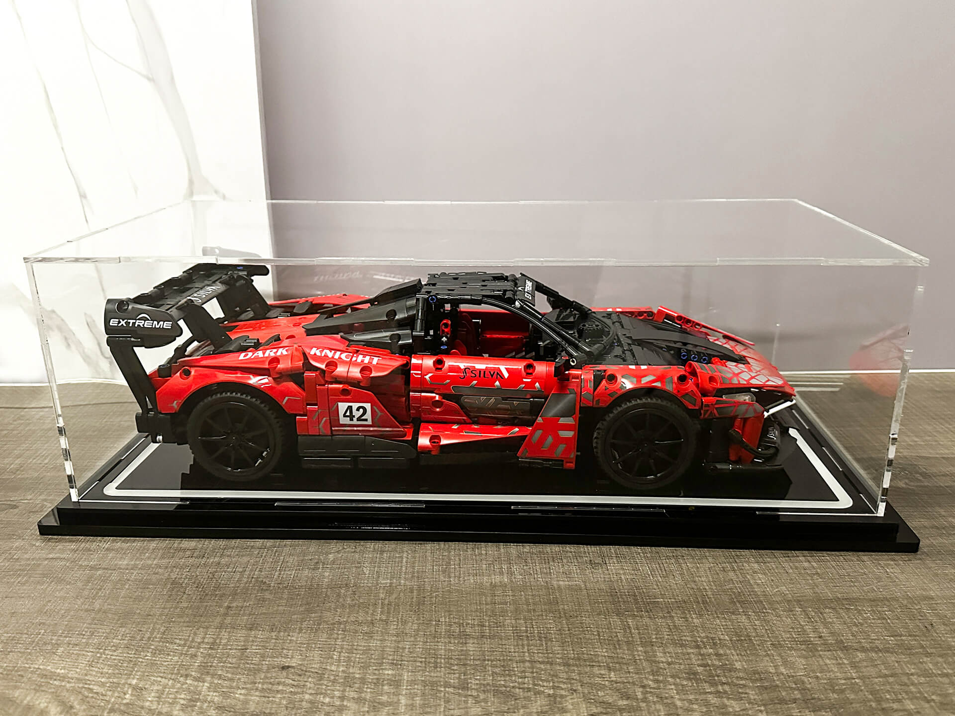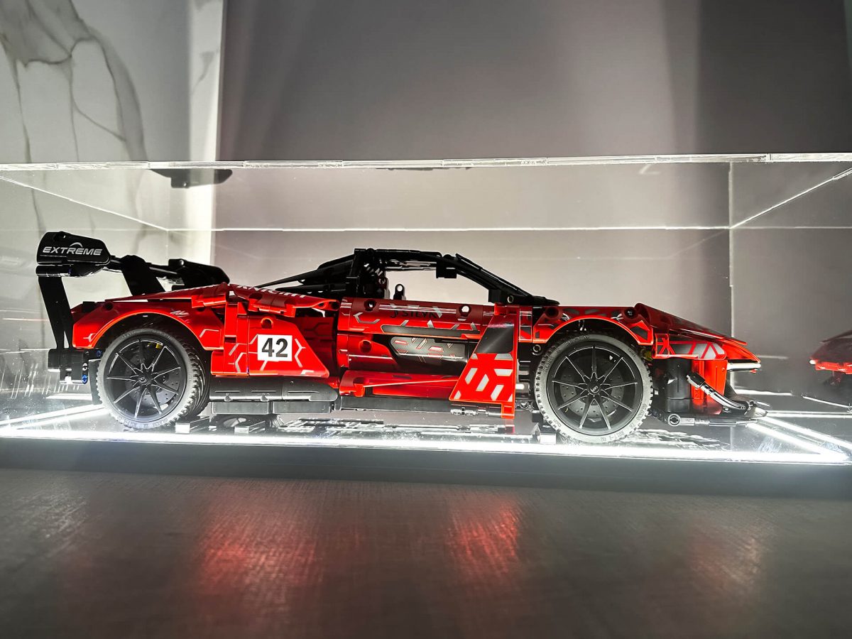 Κατασκευή custom βιτρίνας με συνδυασμό υλικών και φωτισμό για την προστασία συλλεκτικής μινιατούρας.