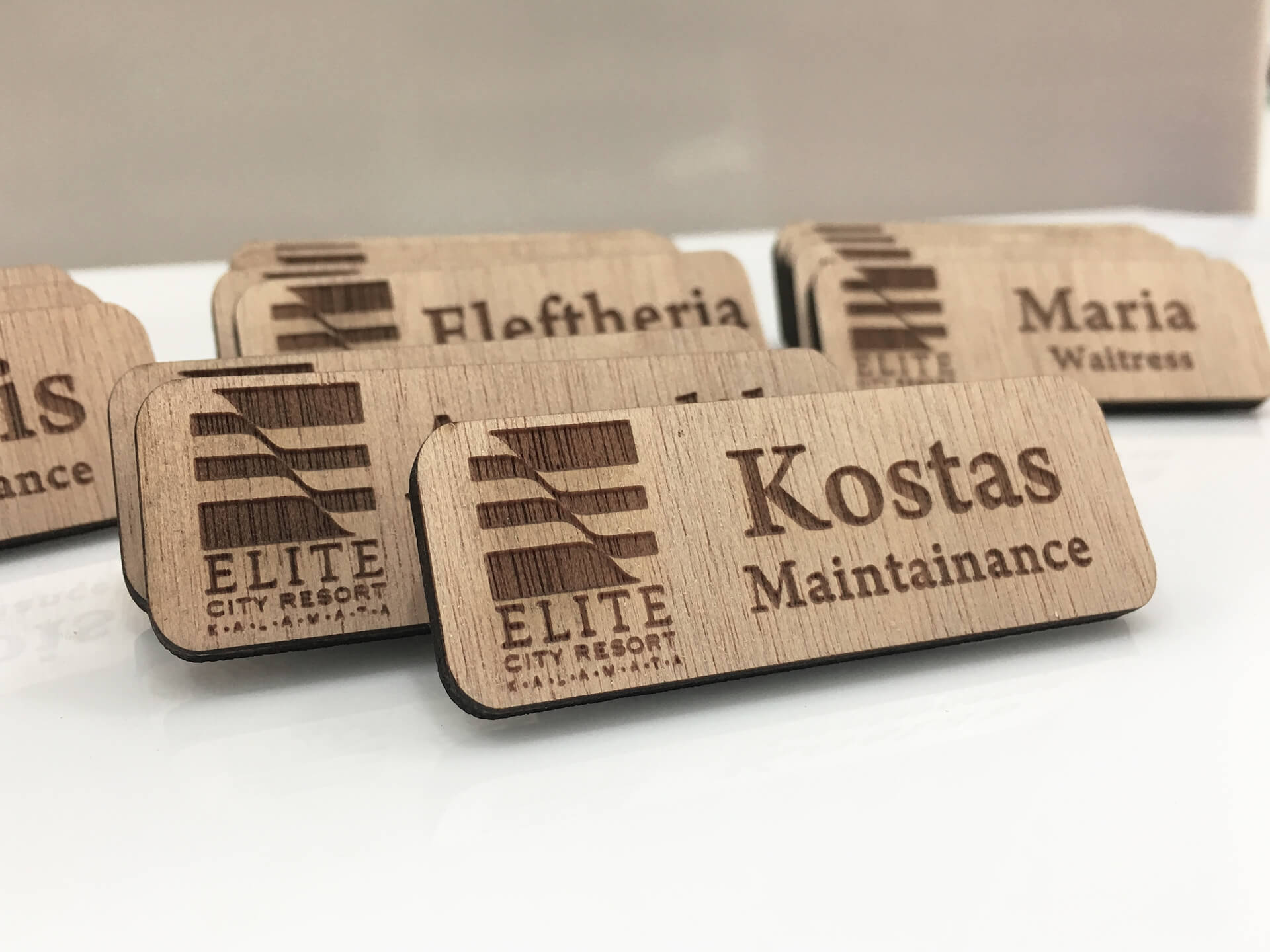 Ξύλινα μαγνητάκια Name tags για ονόματα προσωπικού σε ξενοδοχείο • Υλικά: Ξύλο κόντρα πλακέ οκουμέ πάχους 4mm και μαγνήτης