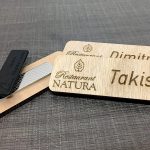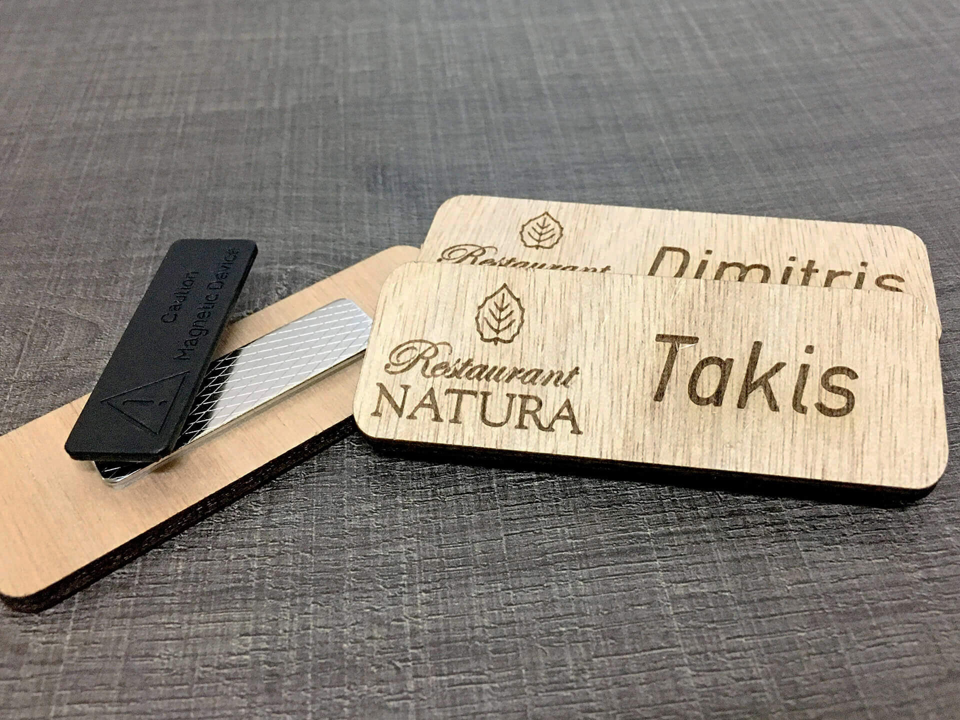 Ξύλινα μαγνητάκια Name tags για ονόματα προσωπικού σε εστιατόριο • Υλικά: Ξύλο κόντρα πλακέ οκουμέ πάχους 4mm και μαγνήτης