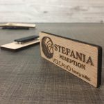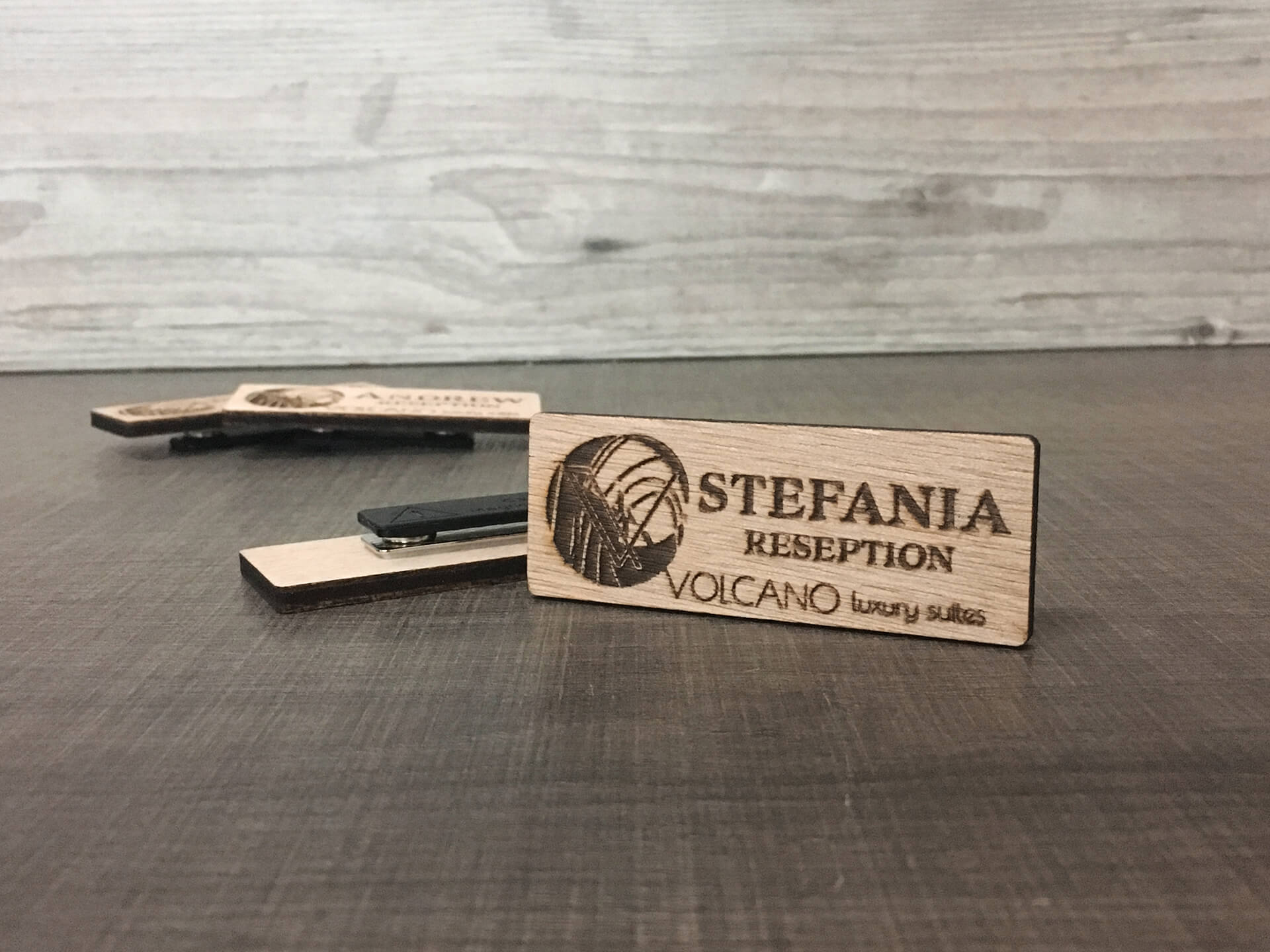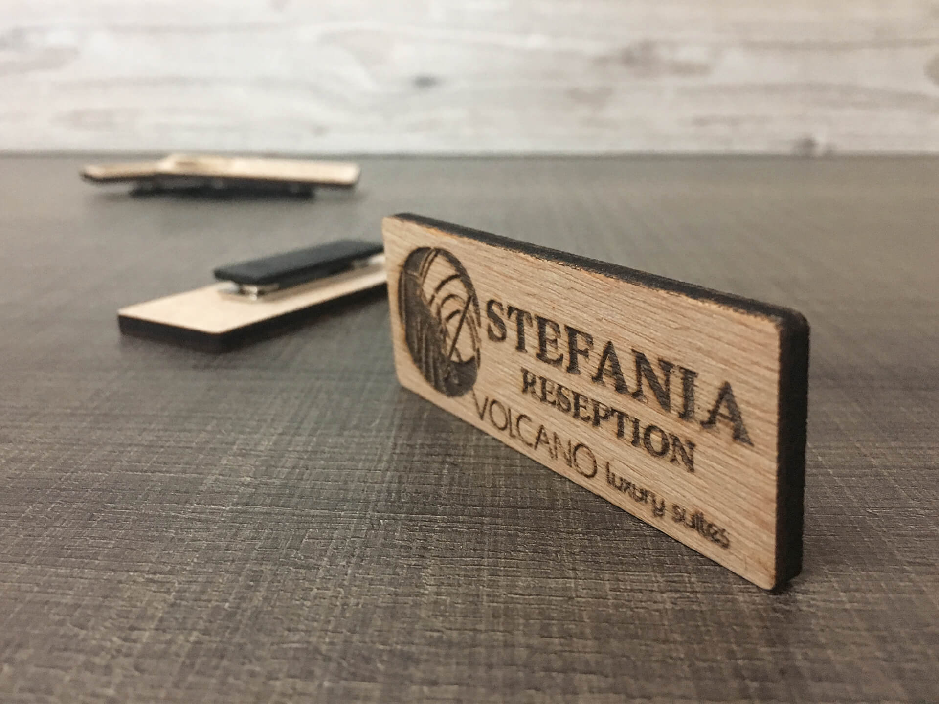Ξύλινα μαγνητάκια Name tags για ονόματα προσωπικού σε ξενοδοχειακή μονάδα • Υλικά: Ξύλο κόντρα πλακέ οκουμέ πάχους 4mm και μαγνήτης
