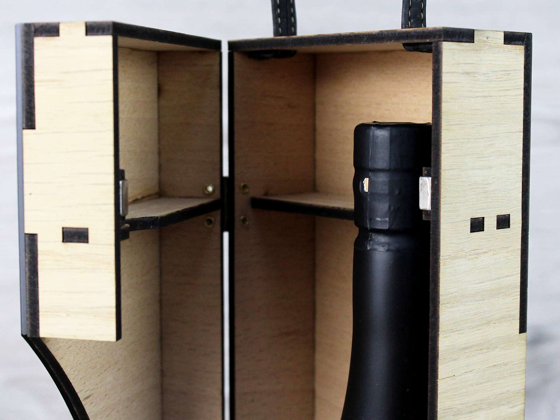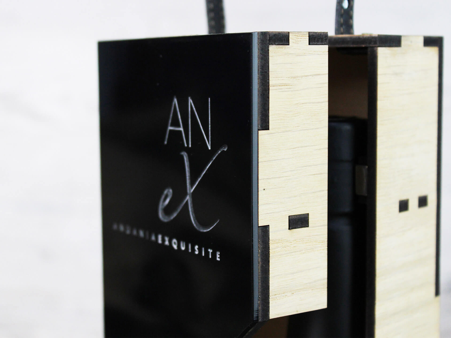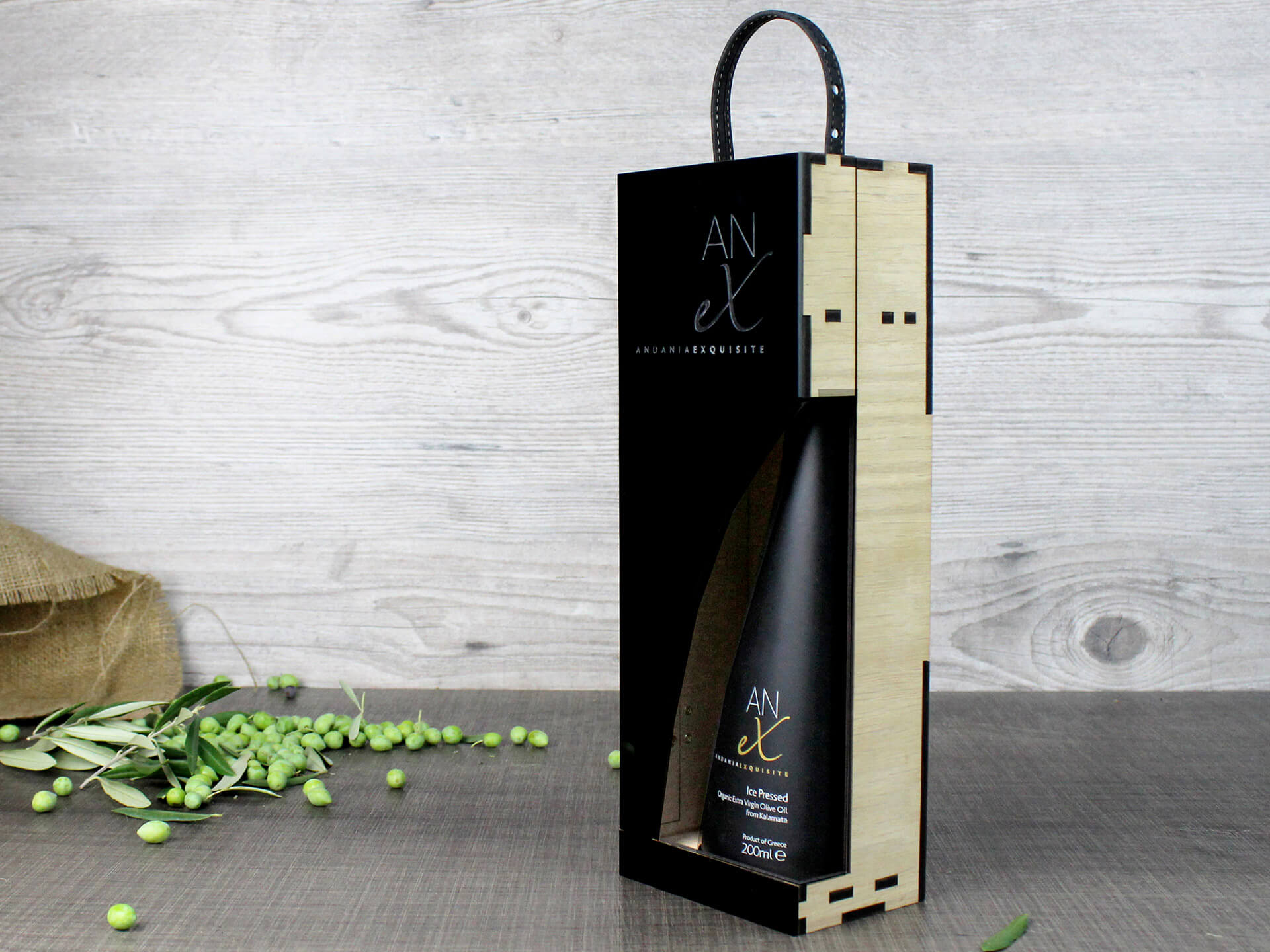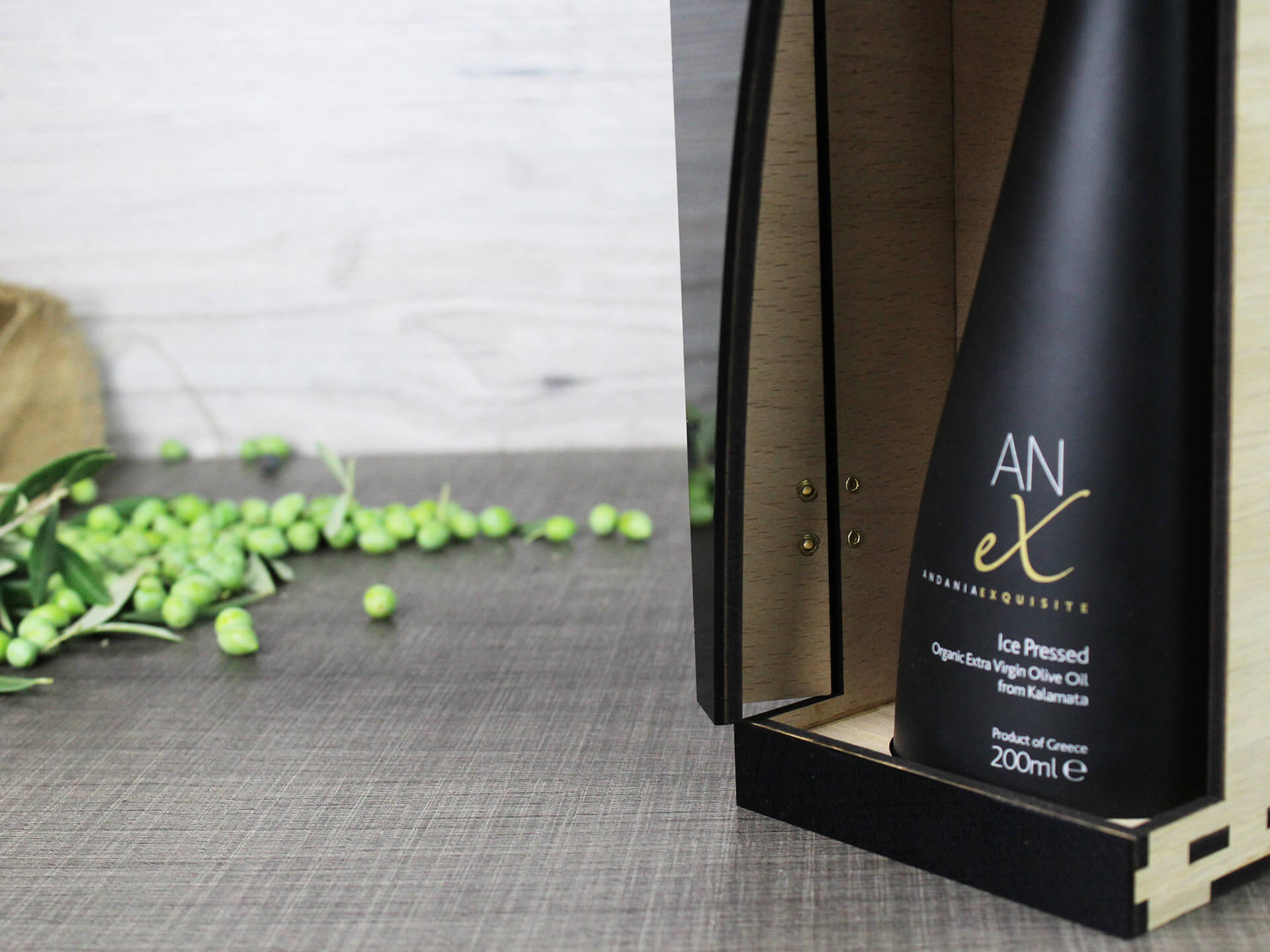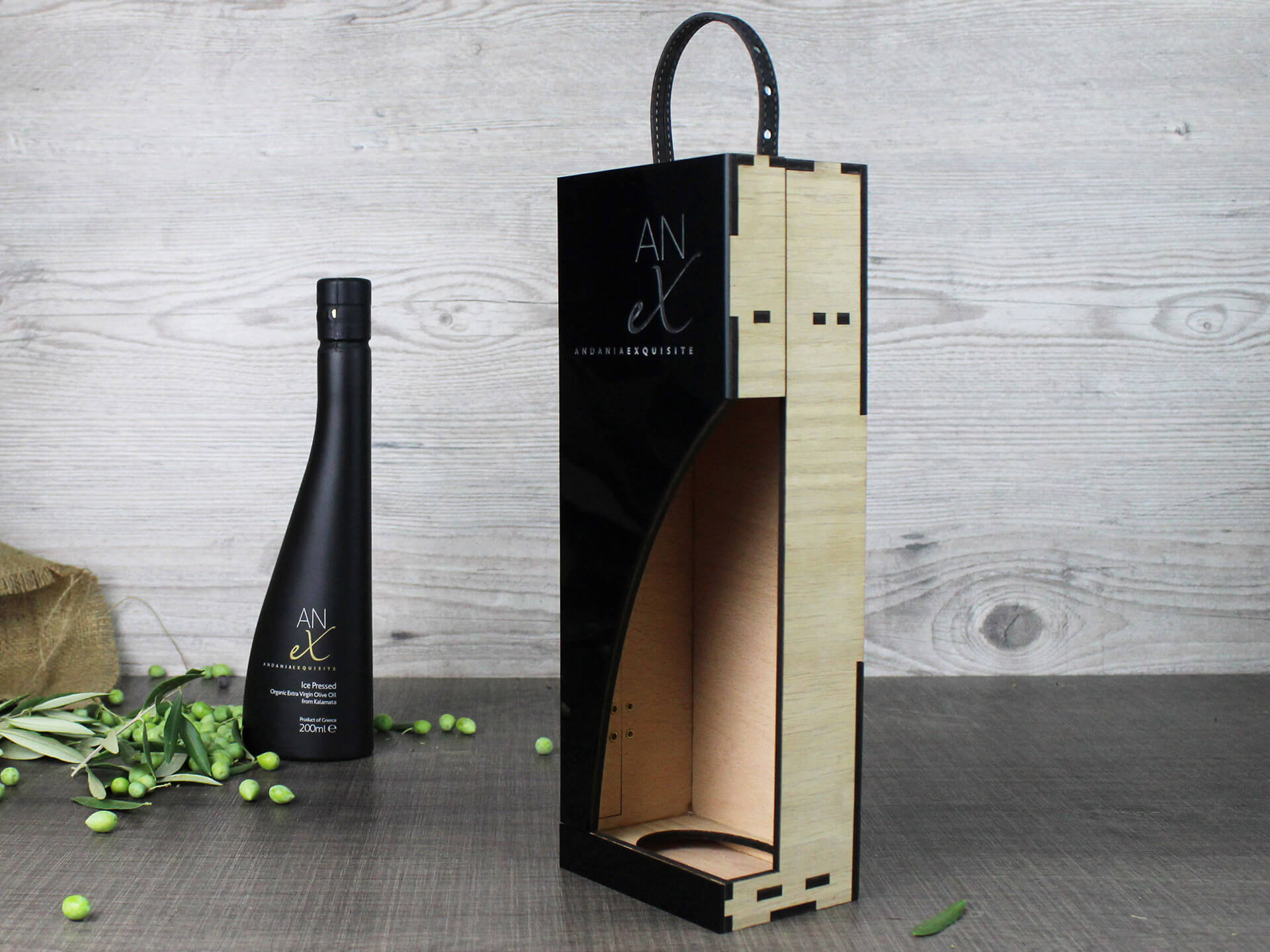 Premium συσκευασία λαδιού με ανοιγόμενο καπάκι με μαγνήτη και χάραξη το λογότυπο. • Υλικά: Ξύλο δρύς πάχους 4mm και μαύρο ακρυλικό πάχους 3mm