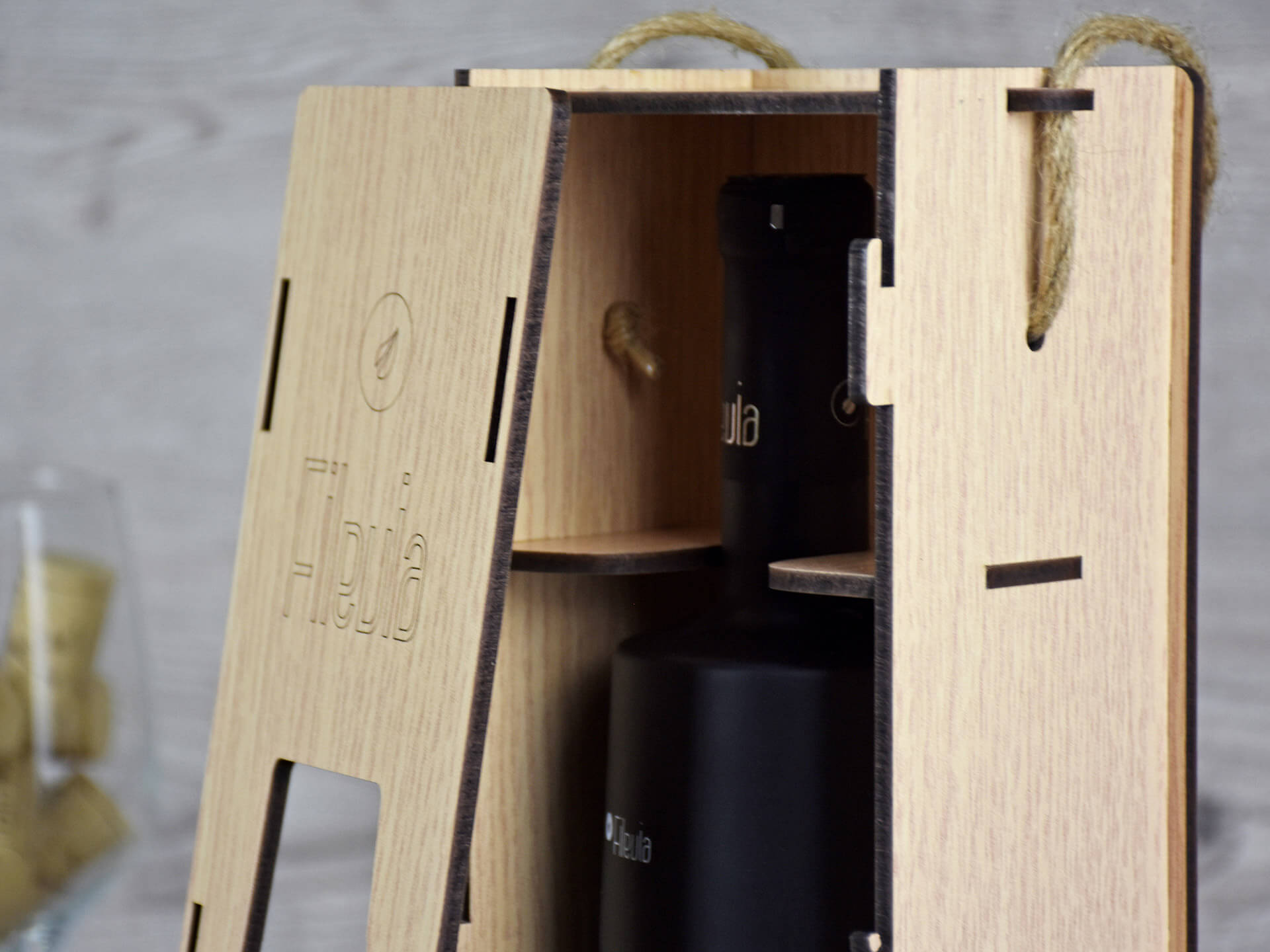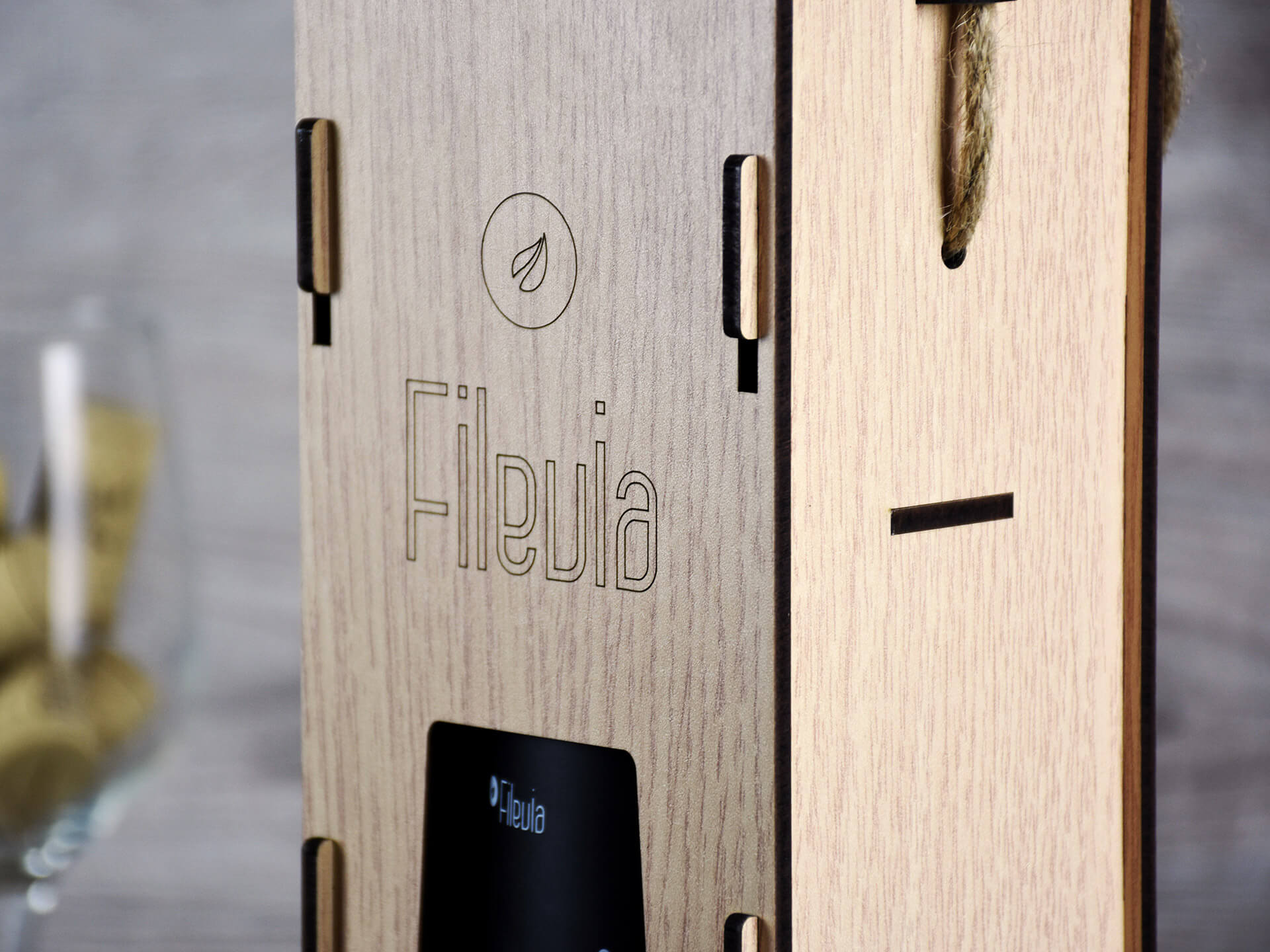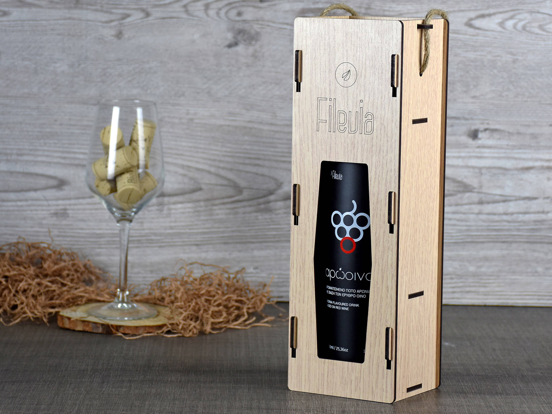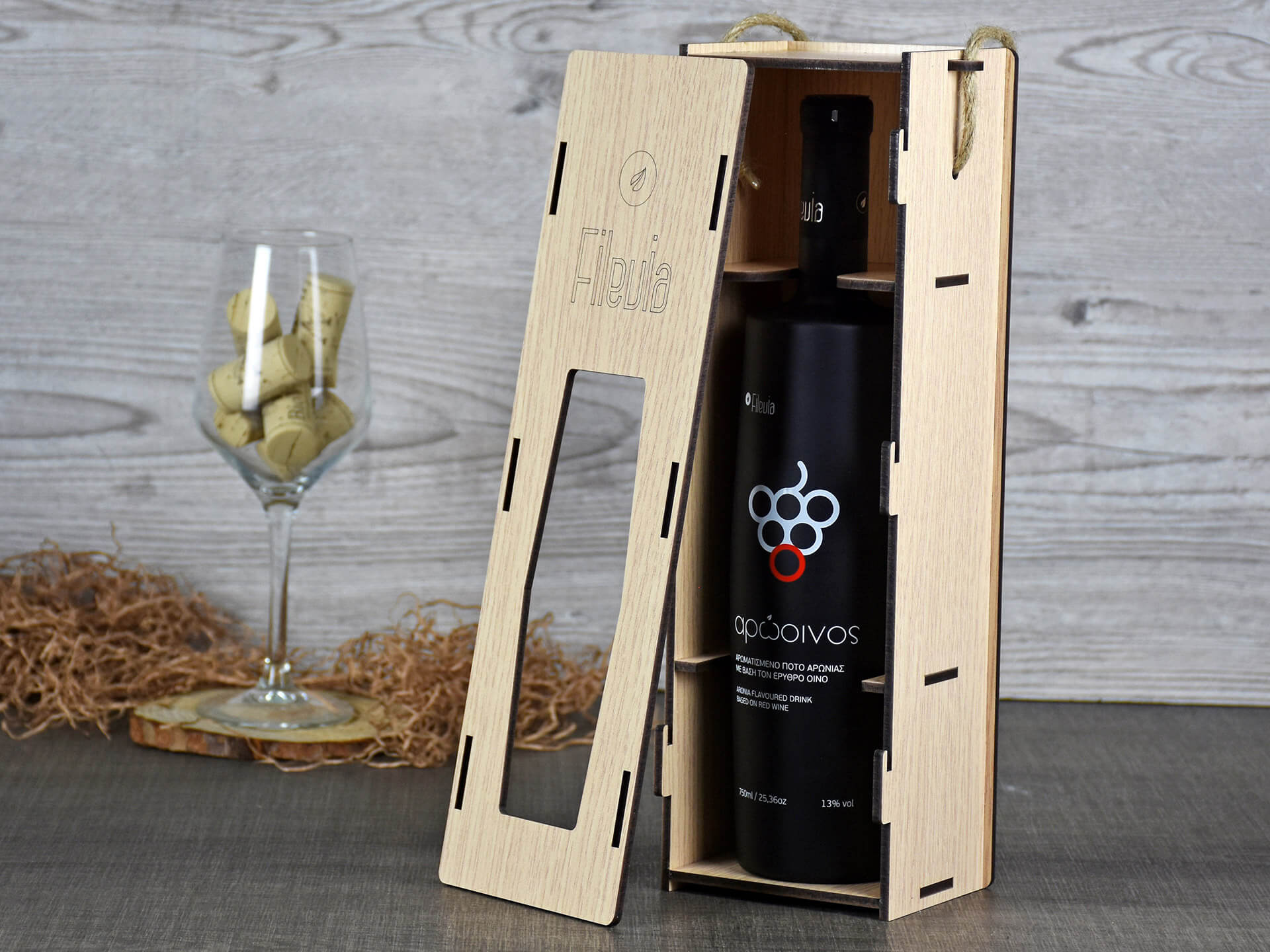 Premium Ξύλινη Συσκευασία κρασίου με κουμπωτό καπάκι • Υλικά: Ξύλο MDF δρυς λακαριστό