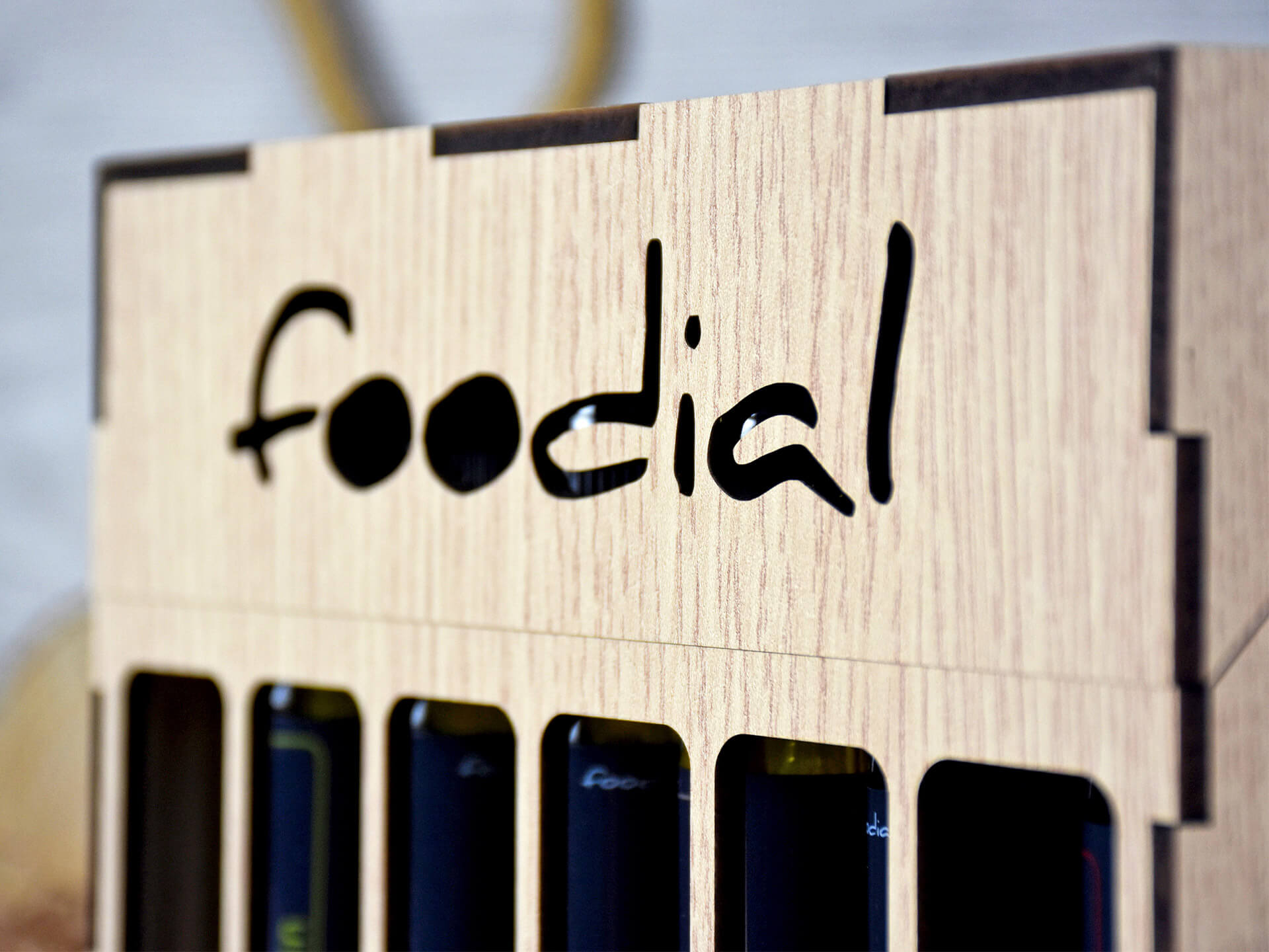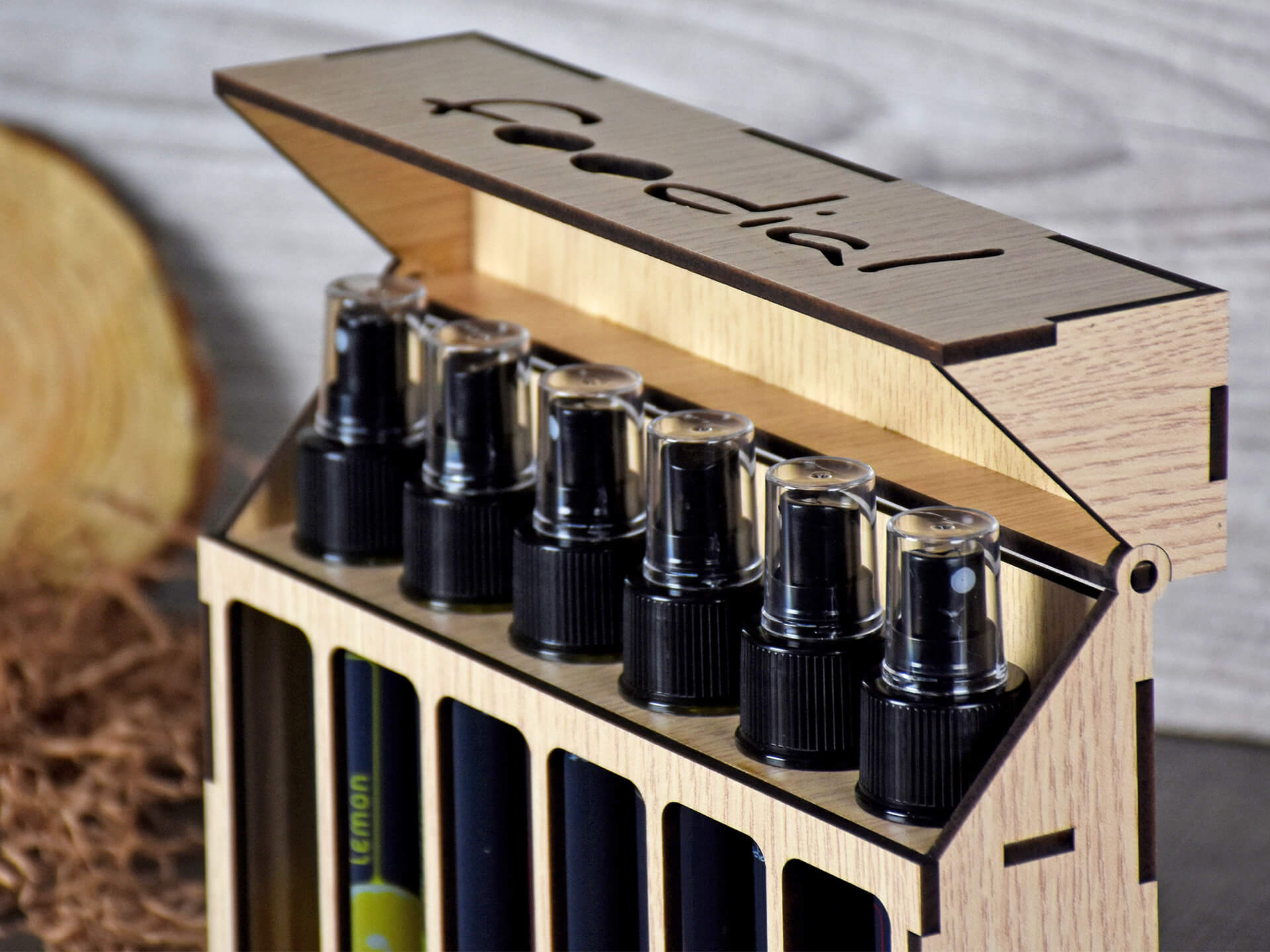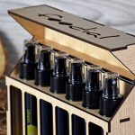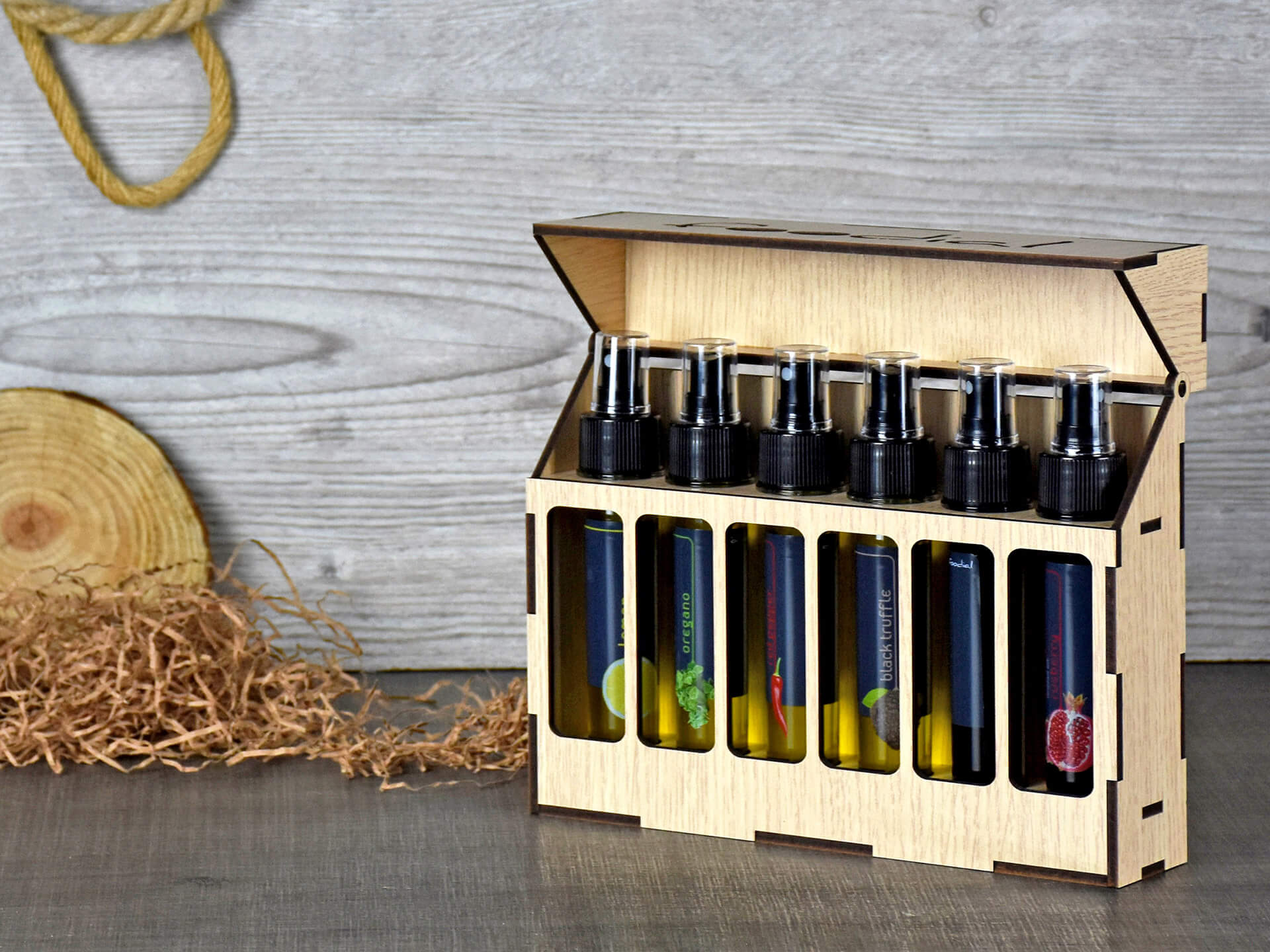 Ξύλινη Premium συσκευασία για φιαλίδια με λάδι, ξίδι, βαλσάμικο, με ανοιγόμενο καπάκι • Υλικά: Ξύλο MDF δρυς λακαριστό