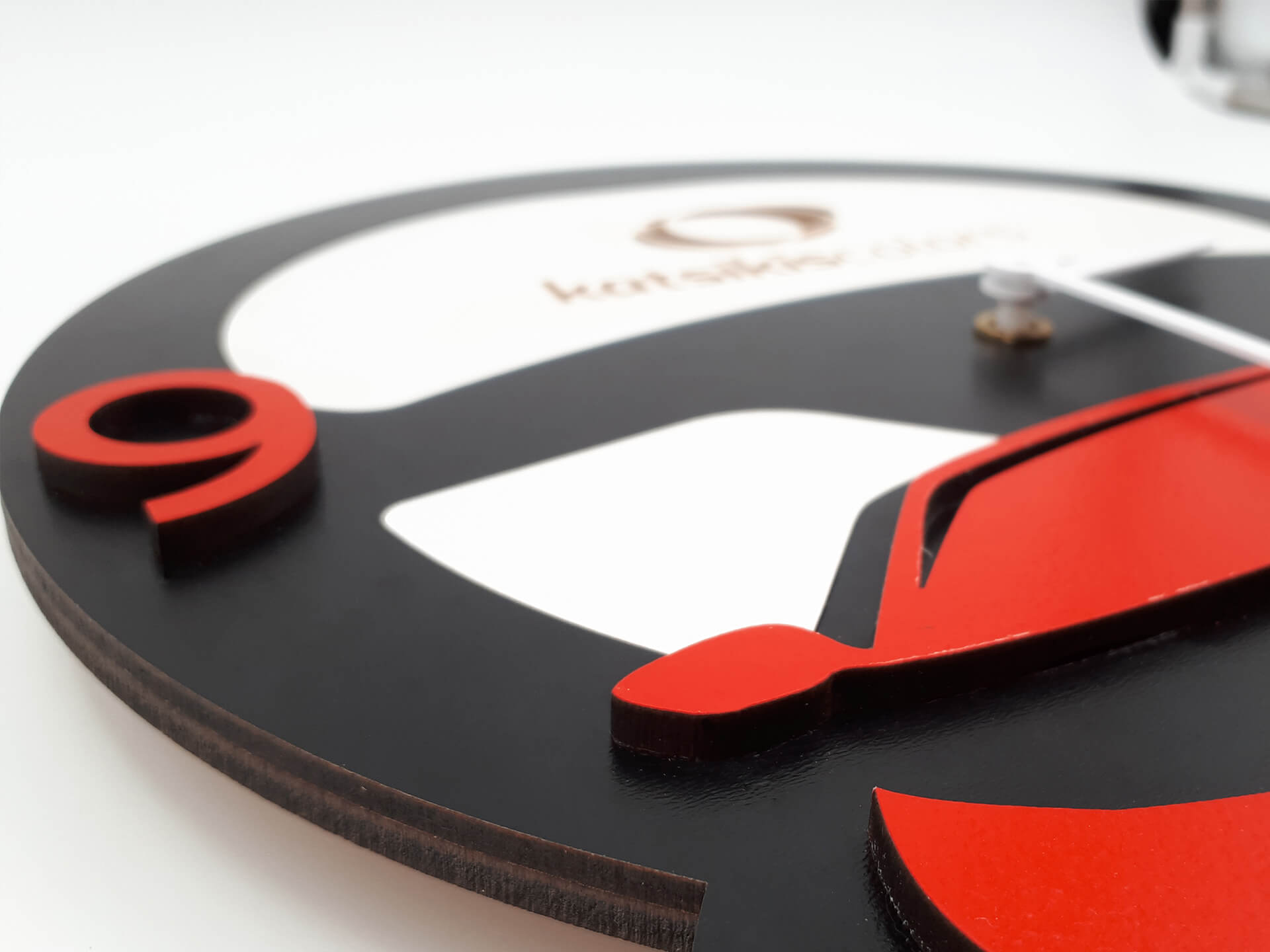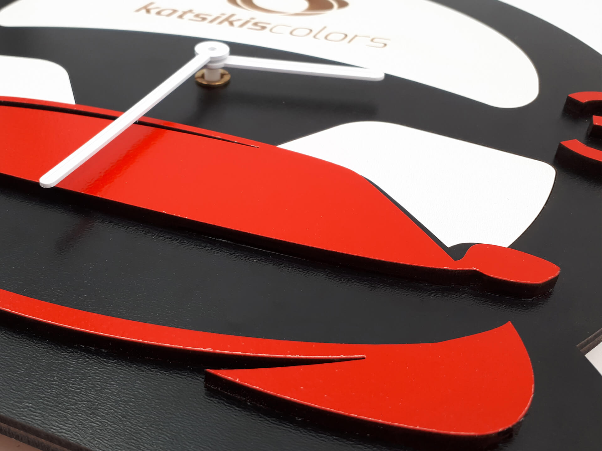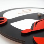 • Υλικά: Ξύλο Mdf Δρυς πάχους 4mm, Mαύρο Mdf λακαριστό πάχους 3mm, Λευκό Mdf λακαριστό πάχους 3mm με χάραξη λογοτύπου και χρωματισμένο ξύλο πάχους 4mm