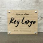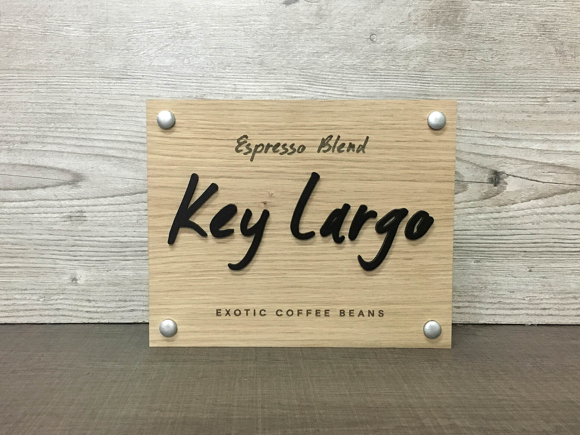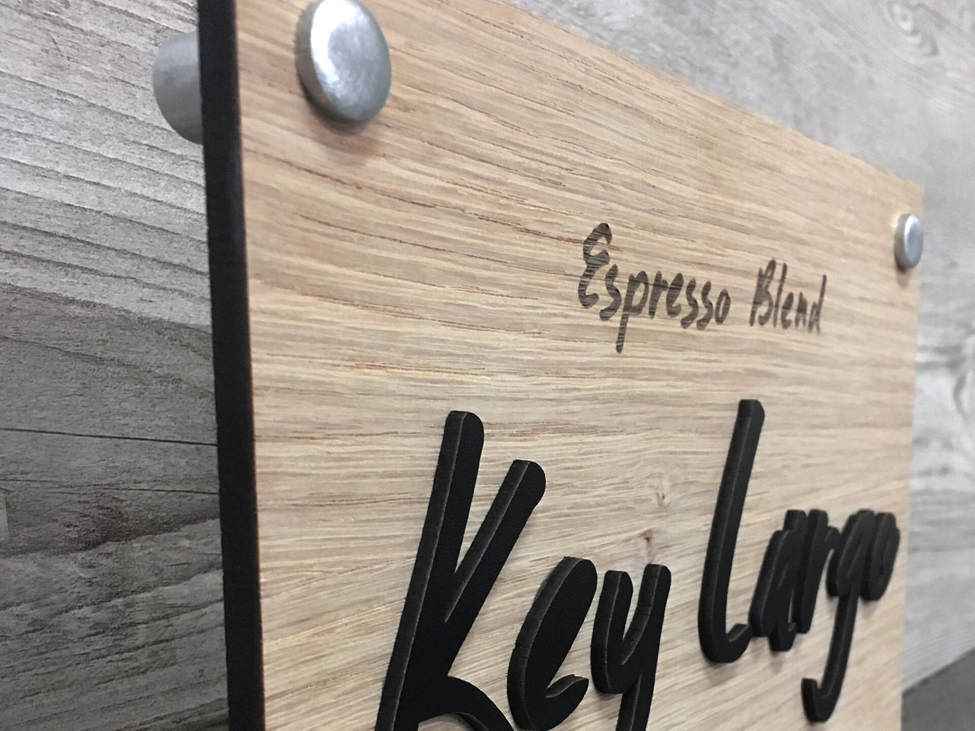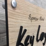 Ξύλινη ταμπέλα με χάραξη και κοπτικά γράμματα για το σχηματισμό του λογοτύπου, με μεταλλικούς αποστάτες για στήριξη στο τοίχο. • Υλικά: Ξύλο MDF δρυς πάχους 7mm και MDF μαύρο λακαριστό πάχους 3mm.