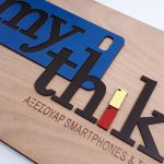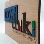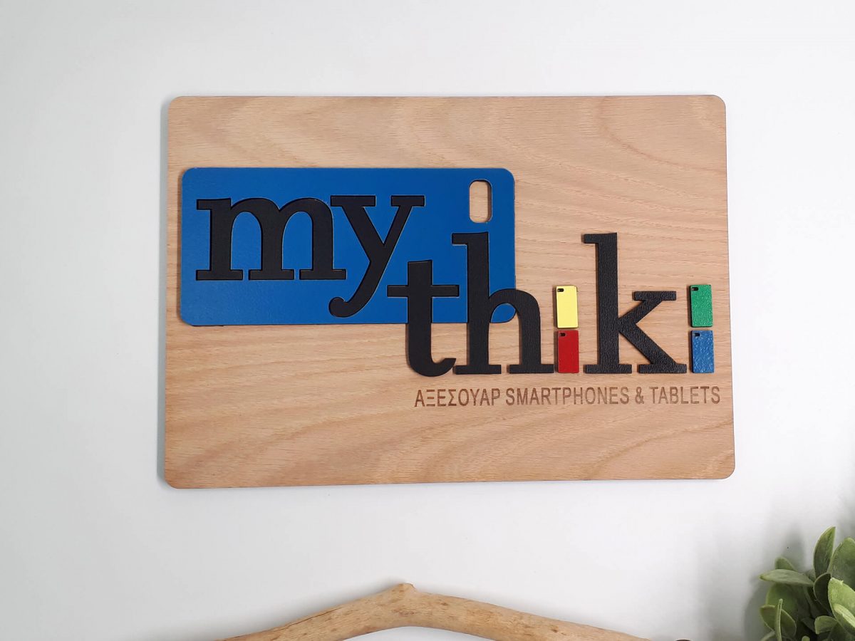 Ξύλινη ταμπέλα με χάραξη και συνδυασμό υλικών.