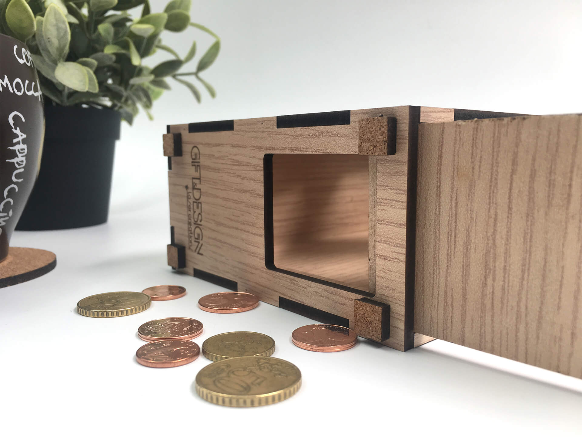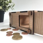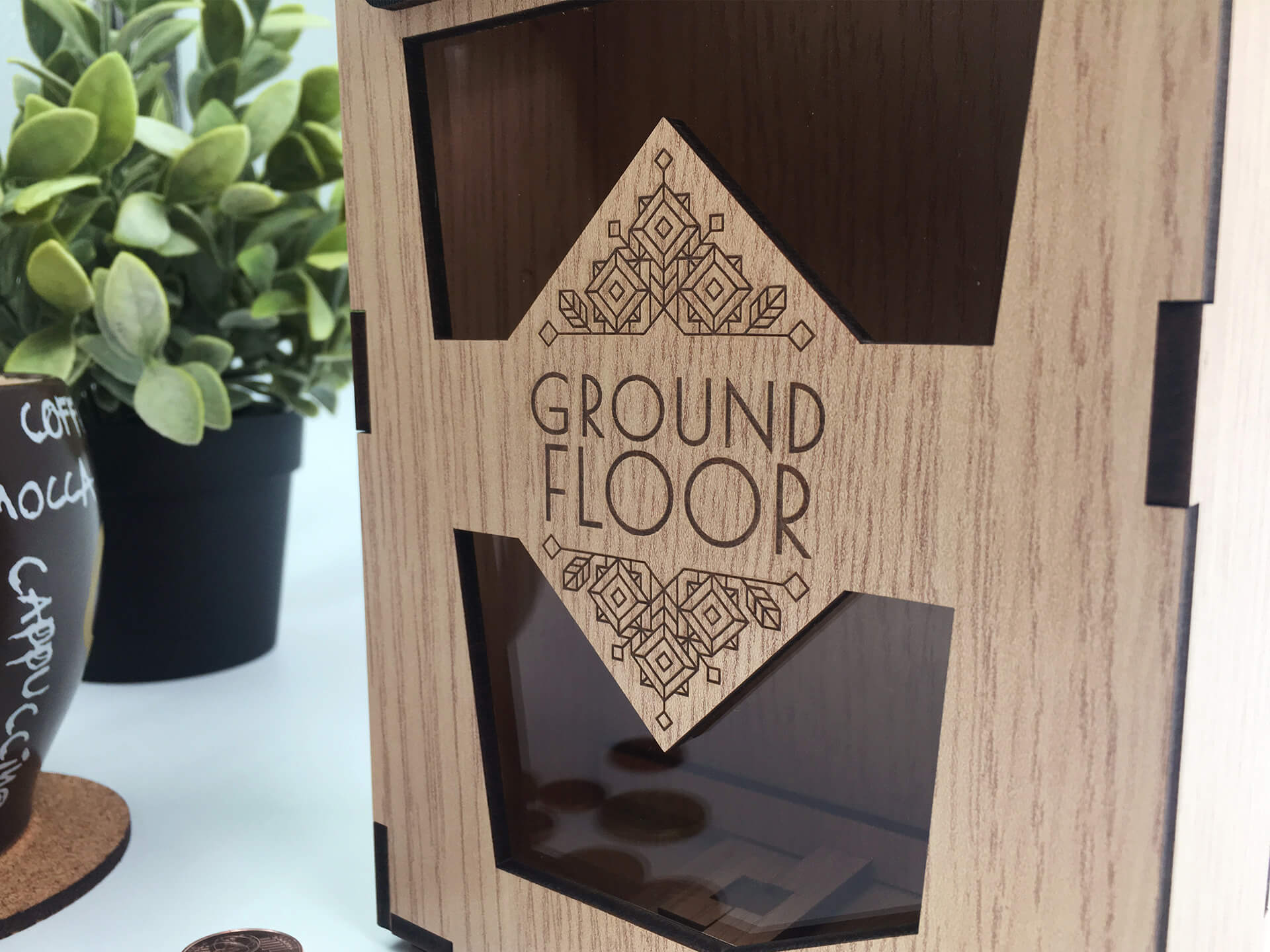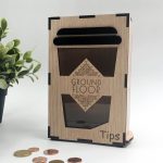 Κατασκευή από ξύλο και ακρυλικό για τα tips με το λογότυπο της επιχείρησης. Διαθέτει έξυπνο άνοιγμα για την αφαίρεση των χρημάτων. • Υλικά: Λακαριστό Δρυς πάχους 4mm, διάφανο ακρυλικό πάχους 4mm