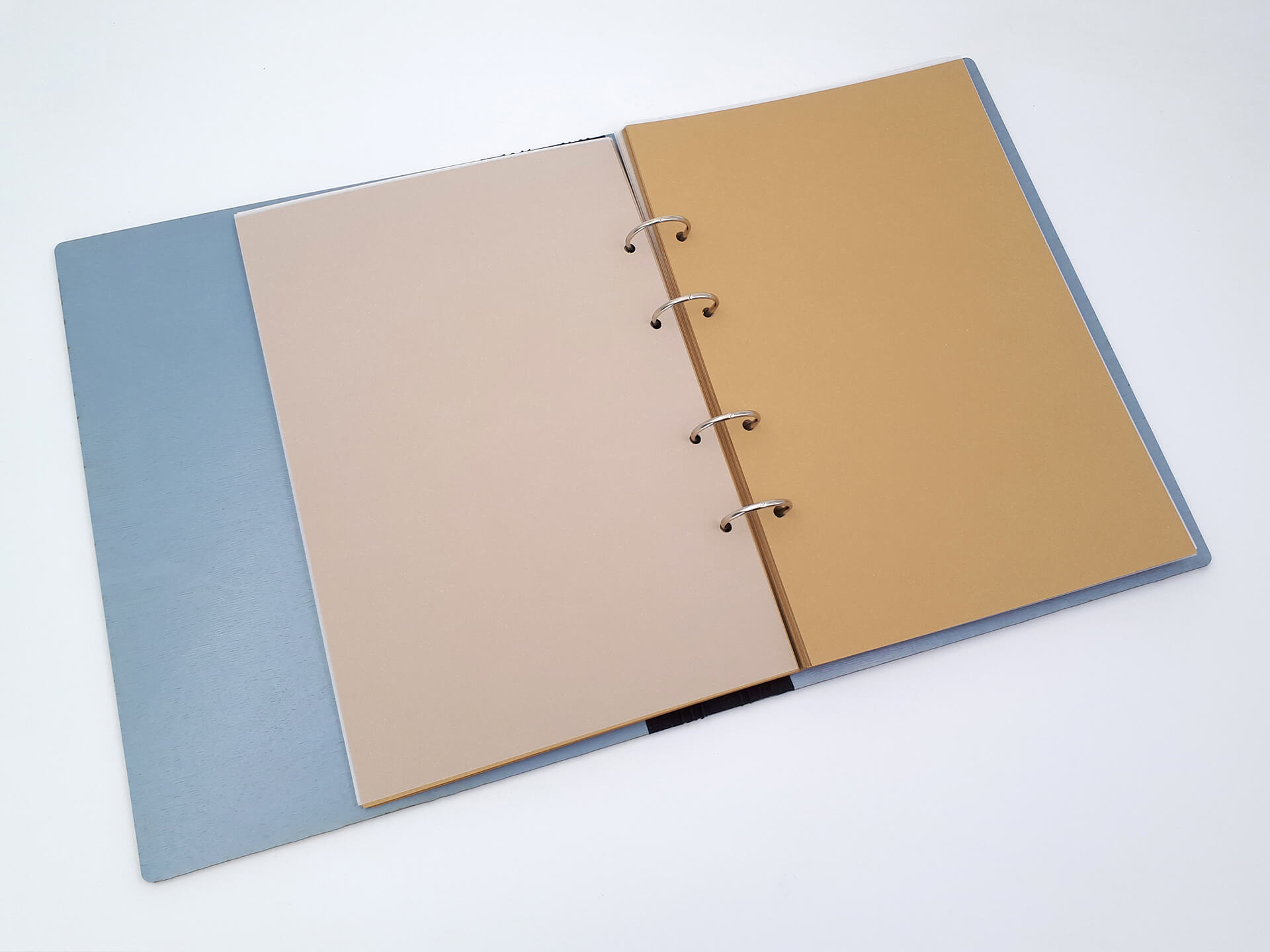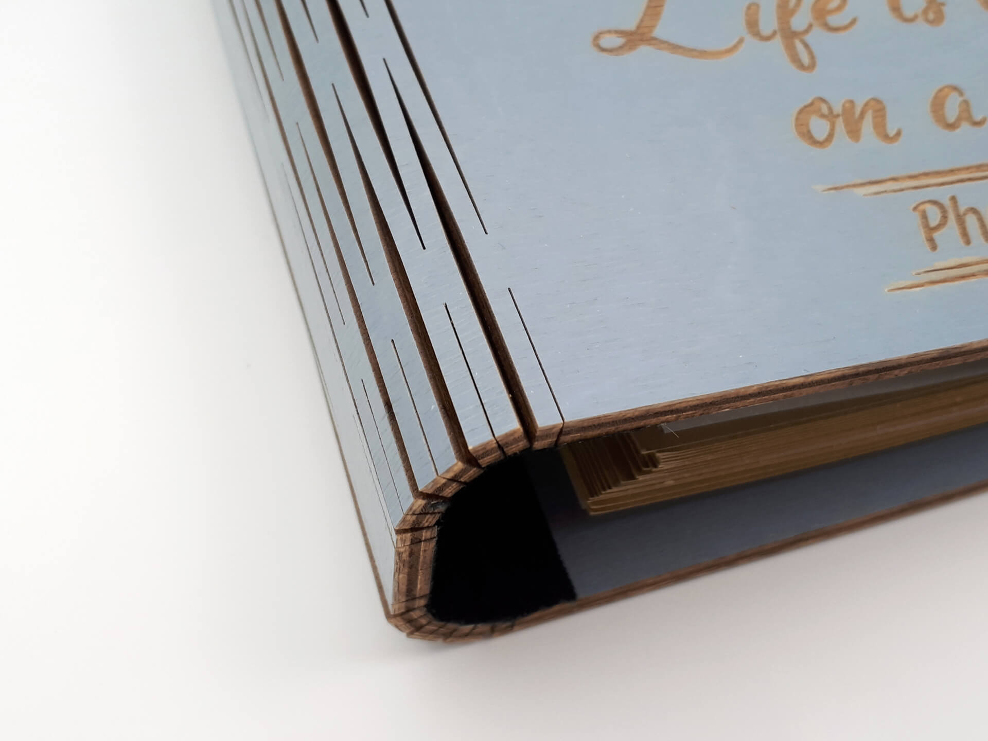 • Υλικά: Εξωτερική κατασκευή από ξύλο κόντρα πλακέ θαλάσσης σημύδα 4mm βαμμένο και με επικάλυψη βερνικιού. Εσωτερικά, μεταλλικοί κρίκοι για τη συγκράτηση των σελίδων, φύλλα από χοντρό χαρτόνι για την τοποθέτηση των φωτογραφιών, ριζόχαρτο ανάμεσα στα φύλλα για την προστασία των φωτογραφιών και υφασμάτινη ταινία στο σημείο που ανοιγοκλείνει το άλμπουμ για συγκράτηση και μεγαλύτερη ανθεκτικότητα του ξύλου κατά τη χρήση. Δίνονται χάρτινες αυτοκόλλητες γωνίες για την τοποθέτηση των φωτογραφιών.