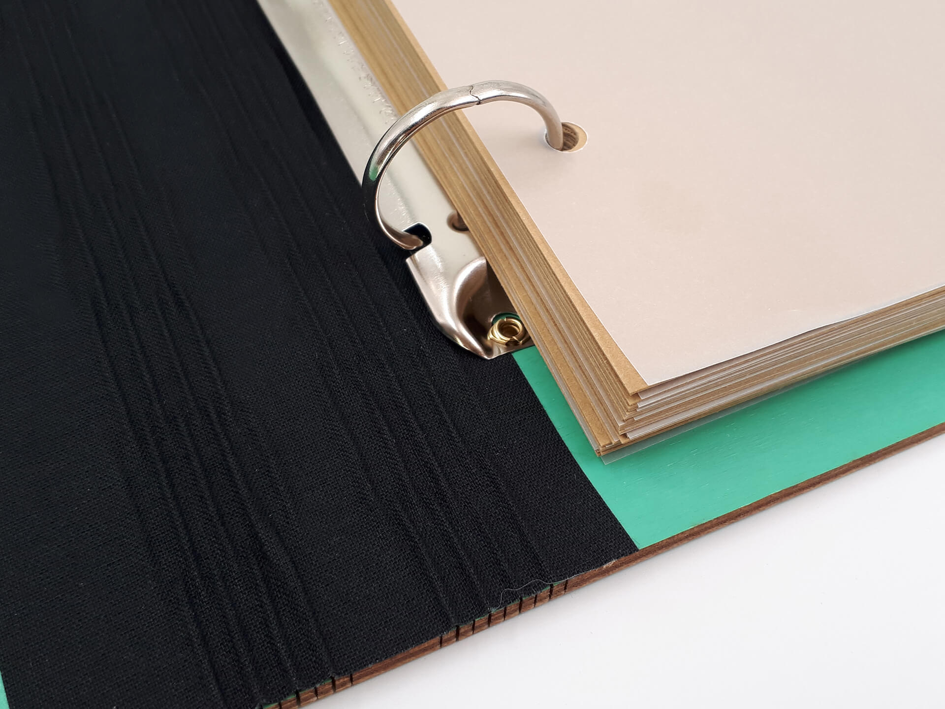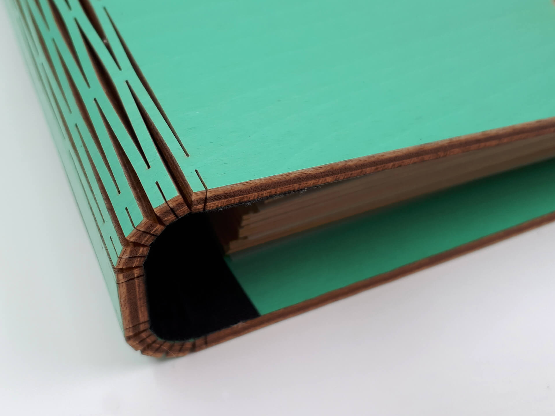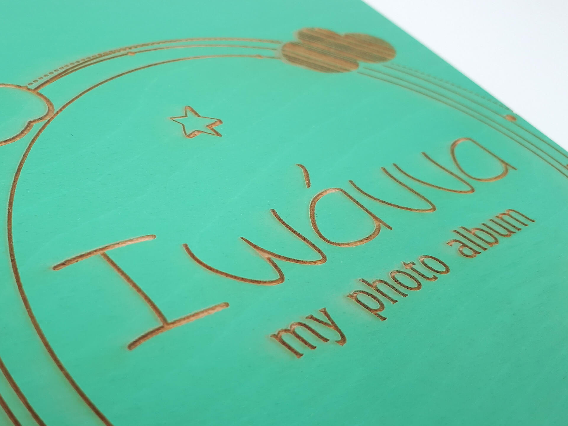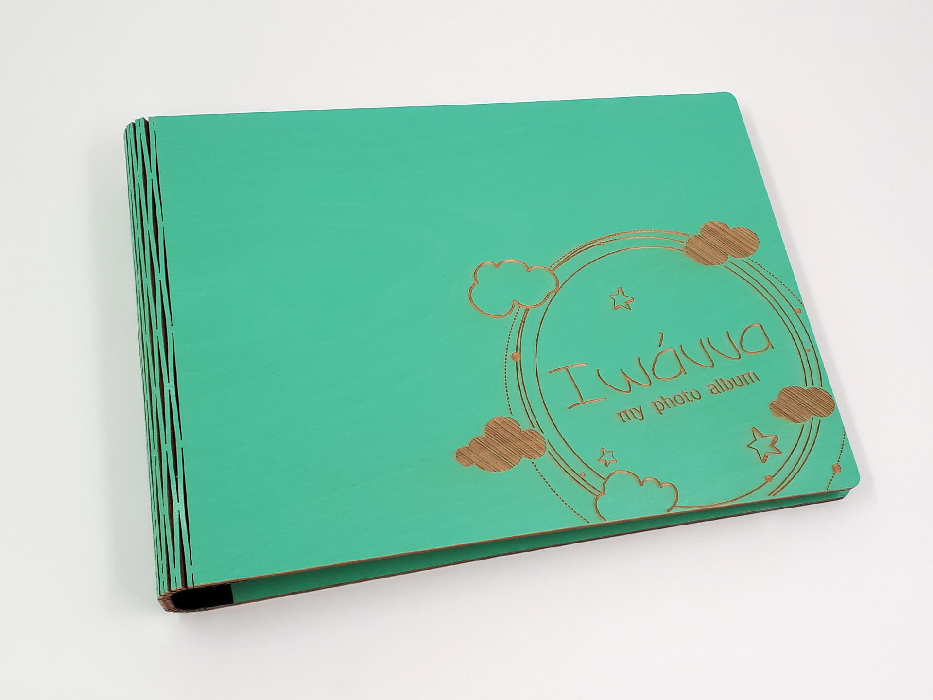 • Υλικά: Εξωτερική κατασκευή από ξύλο κόντρα πλακέ θαλάσσης σημύδα 4mm βαμμένο και με επικάλυψη βερνικιού. Εσωτερικά, μεταλλικοί κρίκοι για τη συγκράτηση των σελίδων, φύλλα από χοντρό χαρτόνι για την τοποθέτηση των φωτογραφιών, ριζόχαρτο ανάμεσα στα φύλλα για την προστασία των φωτογραφιών και υφασμάτινη ταινία στο σημείο που ανοιγοκλείνει το άλμπουμ για συγκράτηση και μεγαλύτερη ανθεκτικότητα του ξύλου κατά τη χρήση. Δίνονται χάρτινες αυτοκόλλητες γωνίες για την τοποθέτηση των φωτογραφιών.