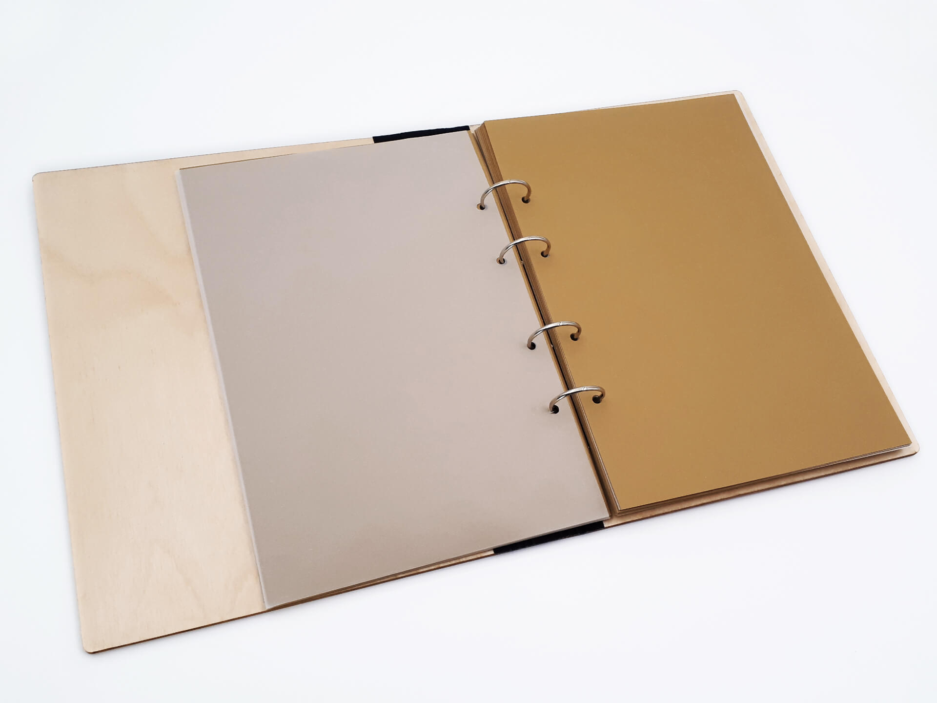 • Υλικά: Εξωτερική κατασκευή από ξύλο κόντρα πλακέ θαλάσσης σημύδα 4mm με επικάλυψη βερνικιού. Εσωτερικά, μεταλλικοί κρίκοι για τη συγκράτηση των σελίδων, φύλλα από χοντρό χαρτόνι για την τοποθέτηση των φωτογραφιών, ριζόχαρτο ανάμεσα στα φύλλα για την προστασία των φωτογραφιών και υφασμάτινη ταινία στο σημείο που ανοιγοκλείνει το άλμπουμ για συγκράτηση και μεγαλύτερη ανθεκτικότητα του ξύλου κατά τη χρήση. Δίνονται χάρτινες αυτοκόλλητες γωνίες για την τοποθέτηση των φωτογραφιών.