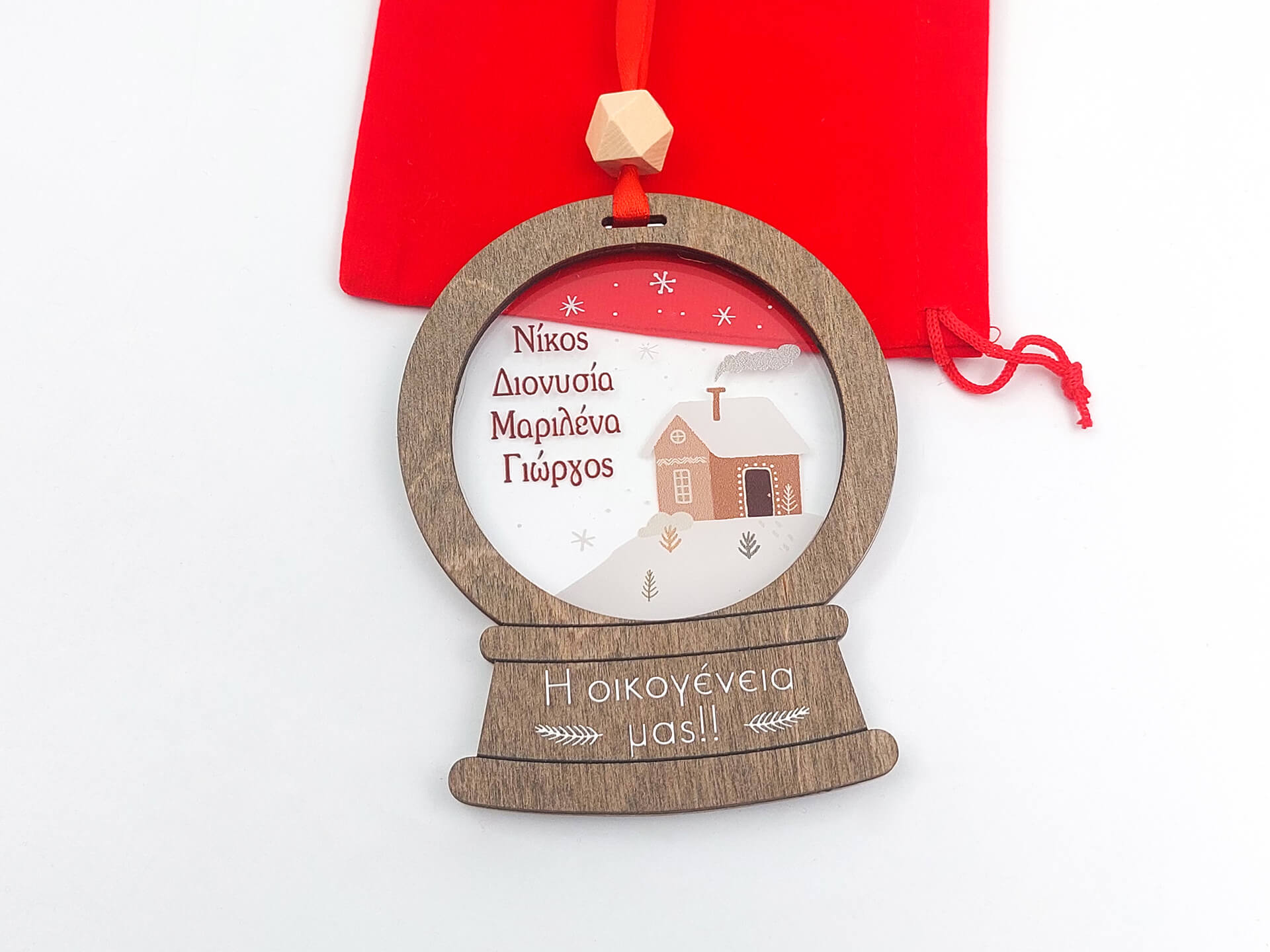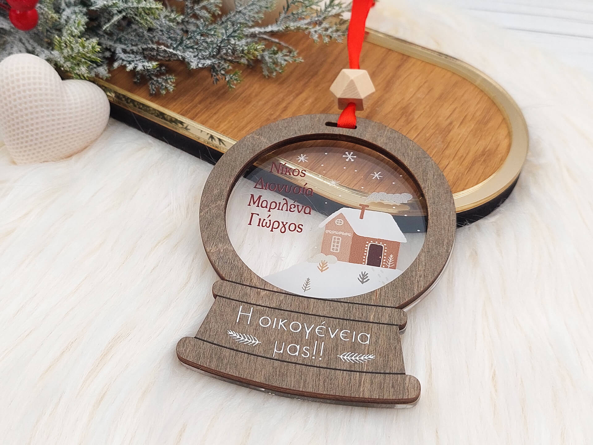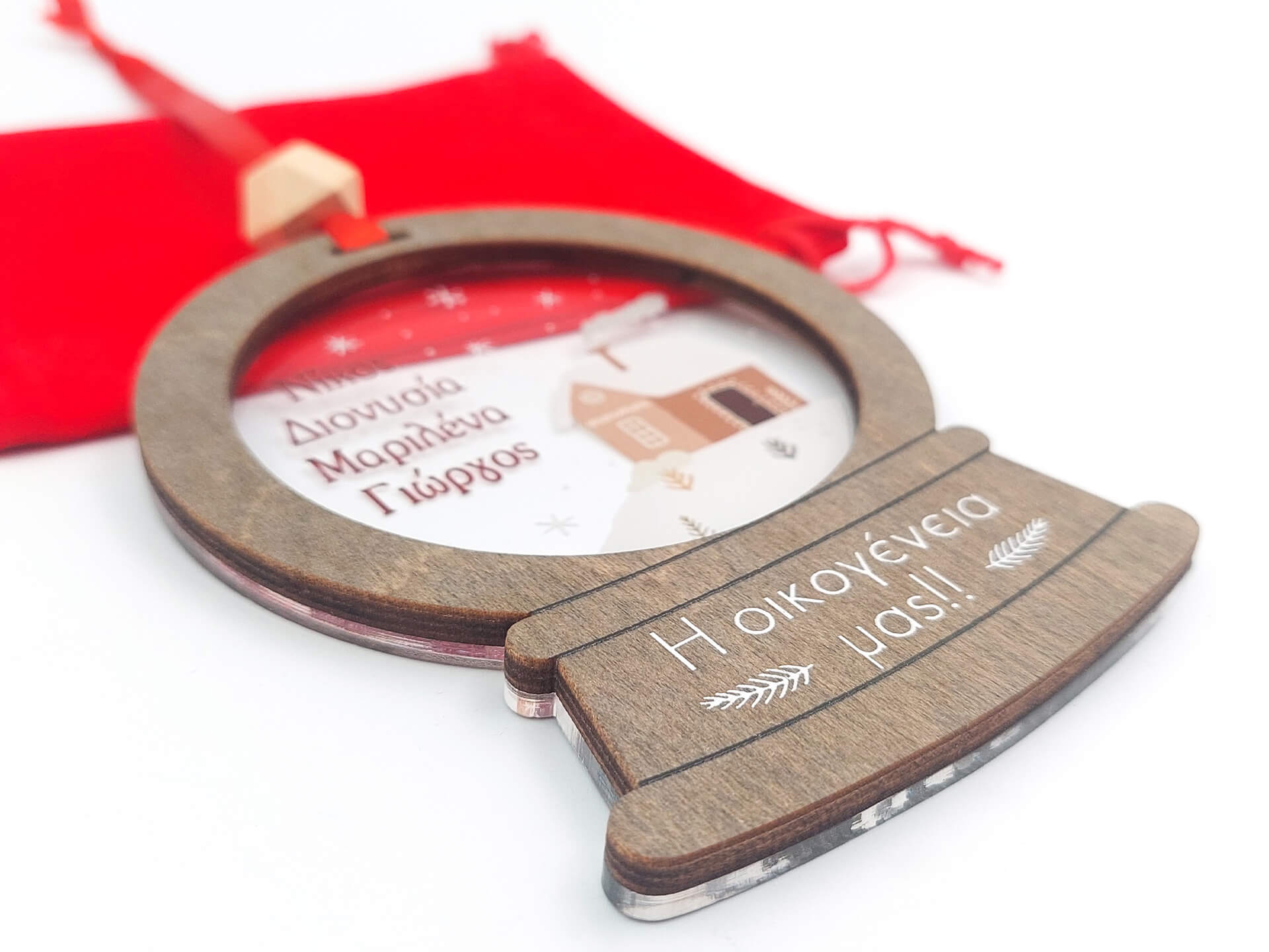 • Υλικά: Χρωματισμένο ξύλο πάχους 4mm, διάφανο ακρυλικό πάχους 3mm, δεμένο με κόκκινη κορδέλα και ξύλινη χάντρα