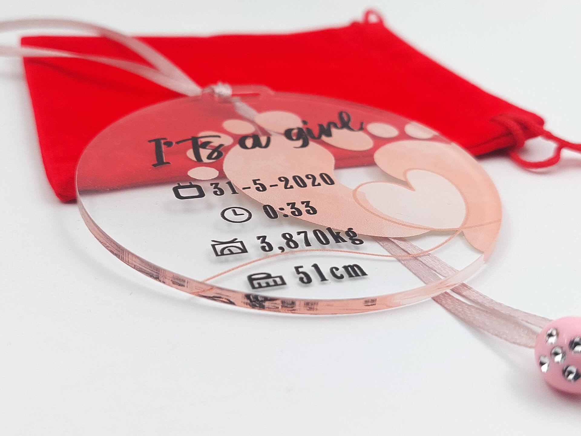 • Υλικά: Διάφανο Ακρυλικό πάχους 3mm, δεμένο με ροζ κορδέλα, χάντρες