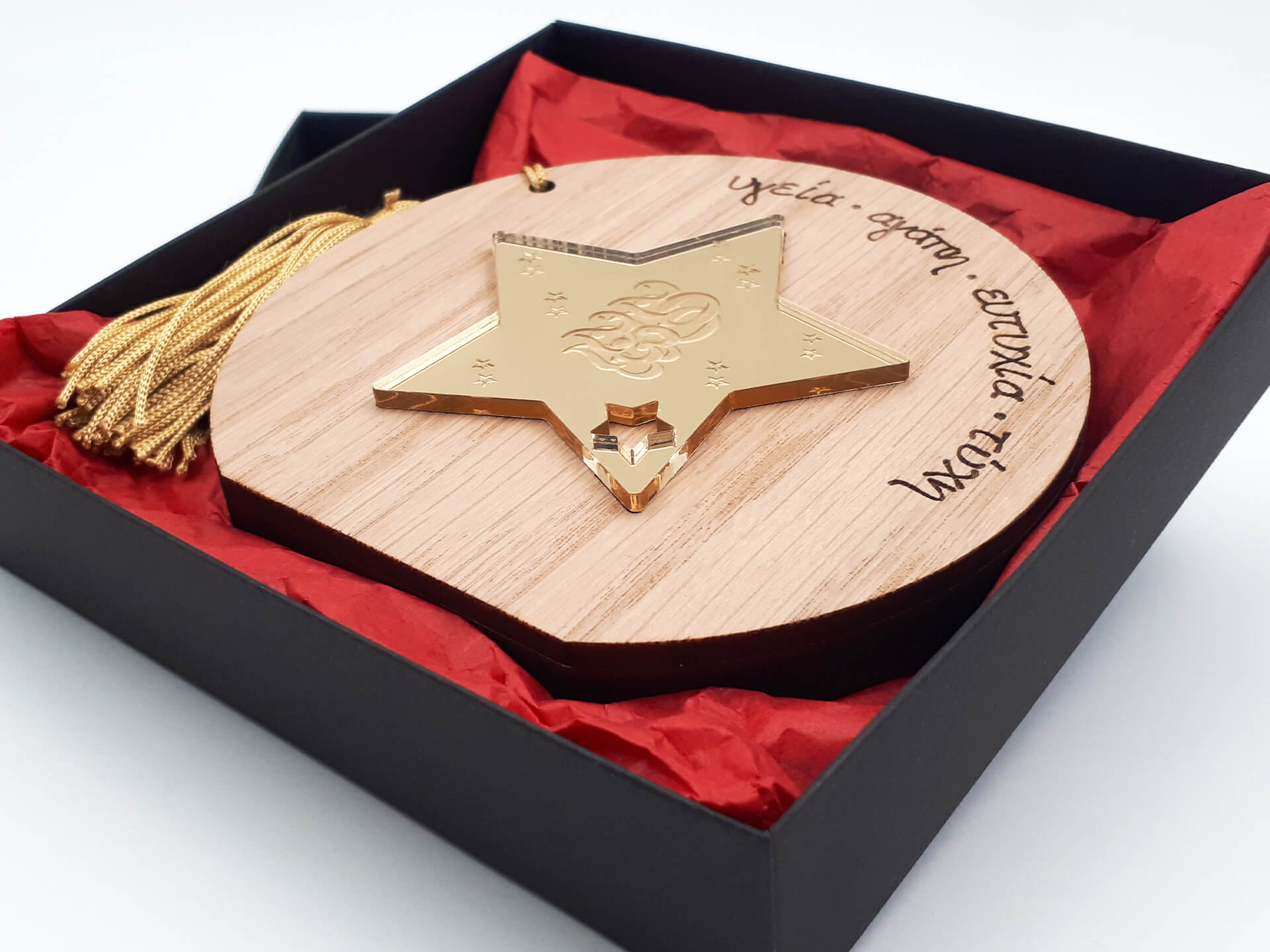 • Υλικά: Ξύλο δρυς πάχους 4mm, ξύλο πάχους 6mm, Ακρυλικό(plexiglass) καθρέπτης χρυσό 3mm, Χρυσή φούντα