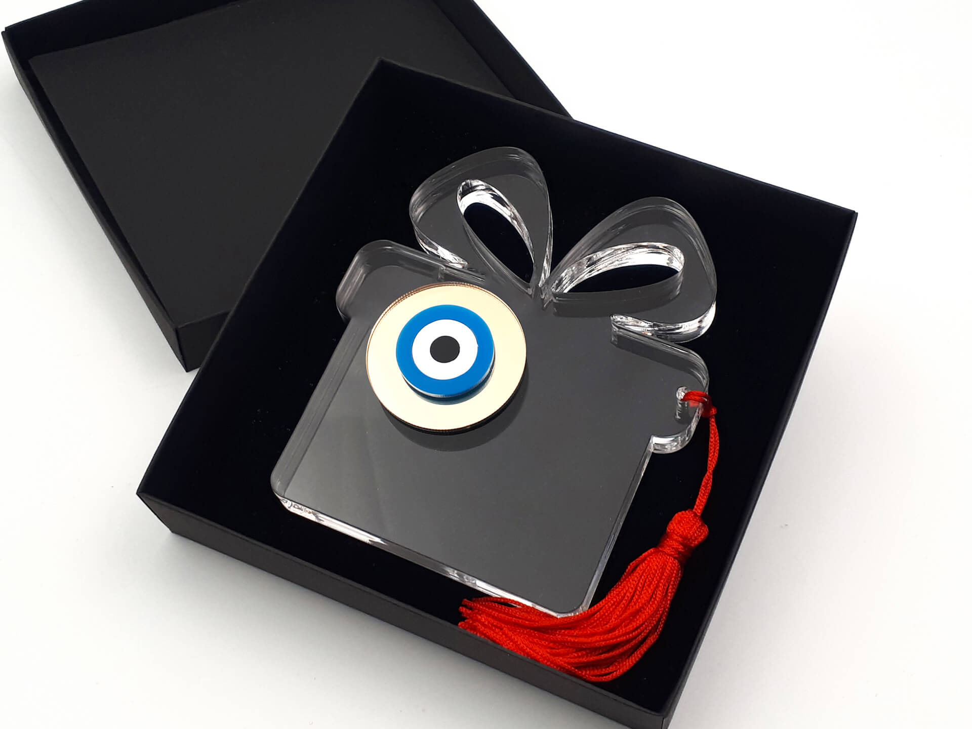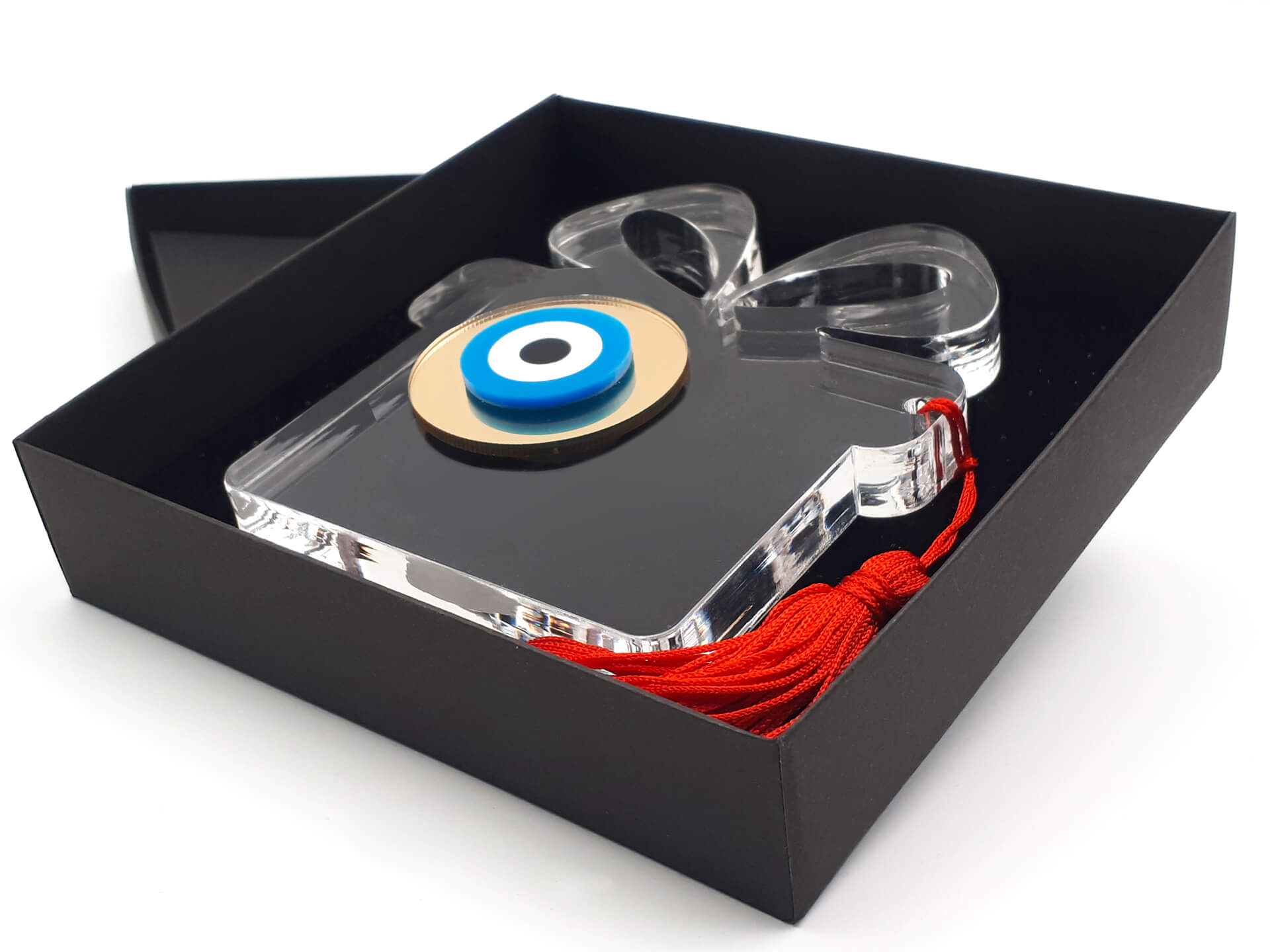 • Υλικά: Ακρυλικό διάφανο πάχους 10mm(στη μικρή διάσταση), 12mm(στη μεσαία διάσταση) και 15mm (στη μεγάλη διάσταση), Ακρυλικό μπλε, λευκό και μαύρο 3mm, Ακρυλικό(plexiglass) καθρέπτης χρυσό 3mm, Κόκκινη φούντα