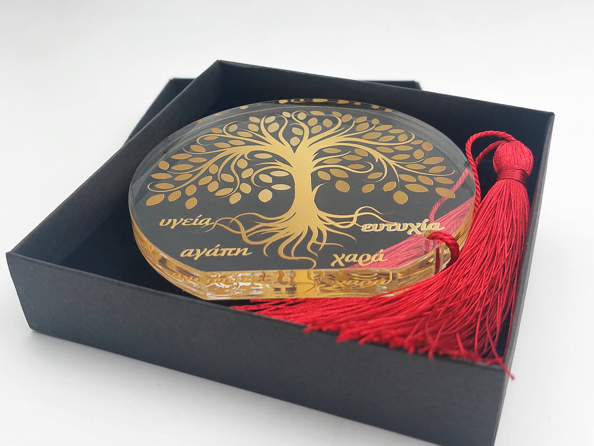 • Υλικά: Διάφανο Ακρυλικό πάχους 10mm με εκτύπωση, Μπορντώ φούντα