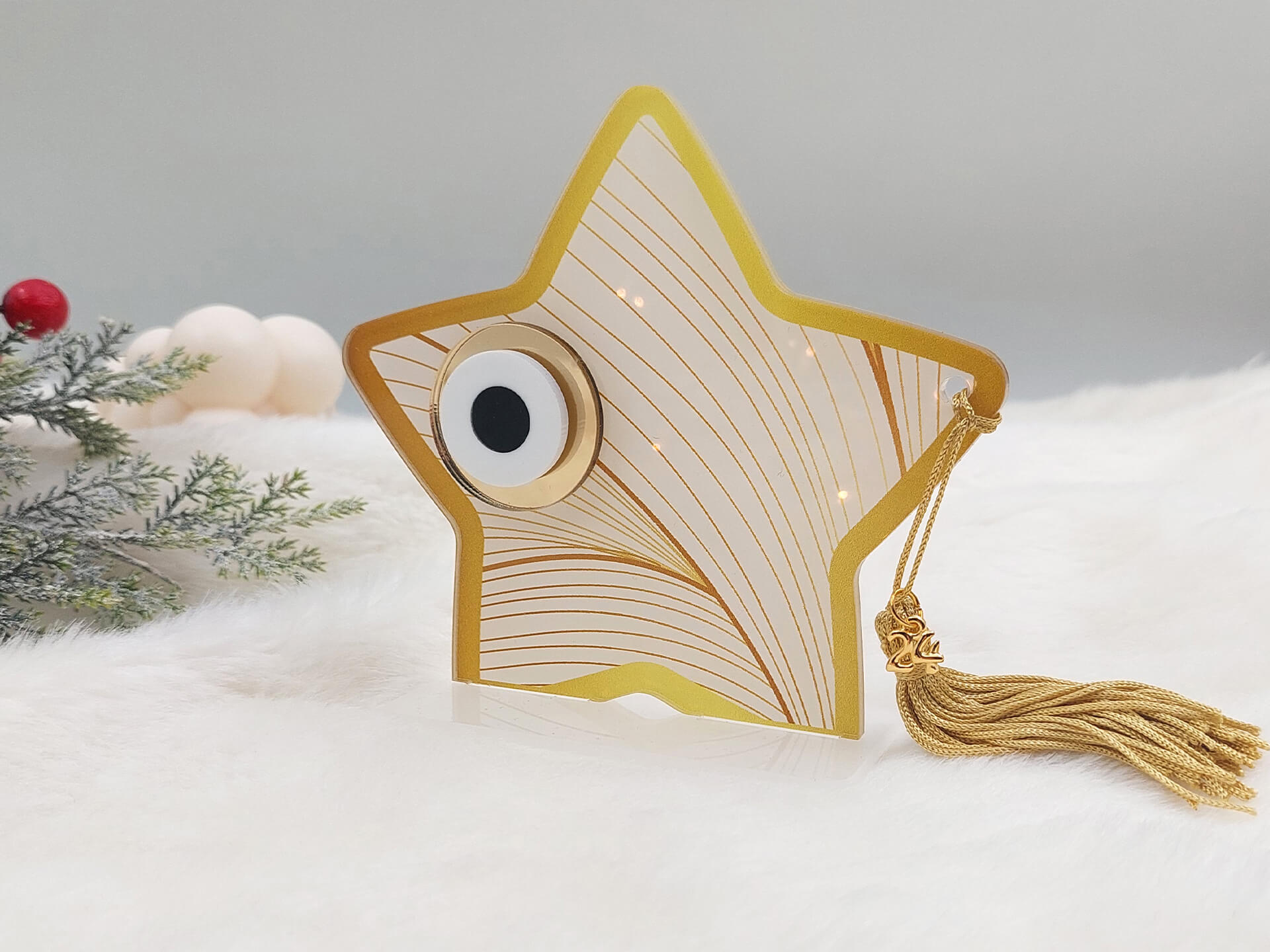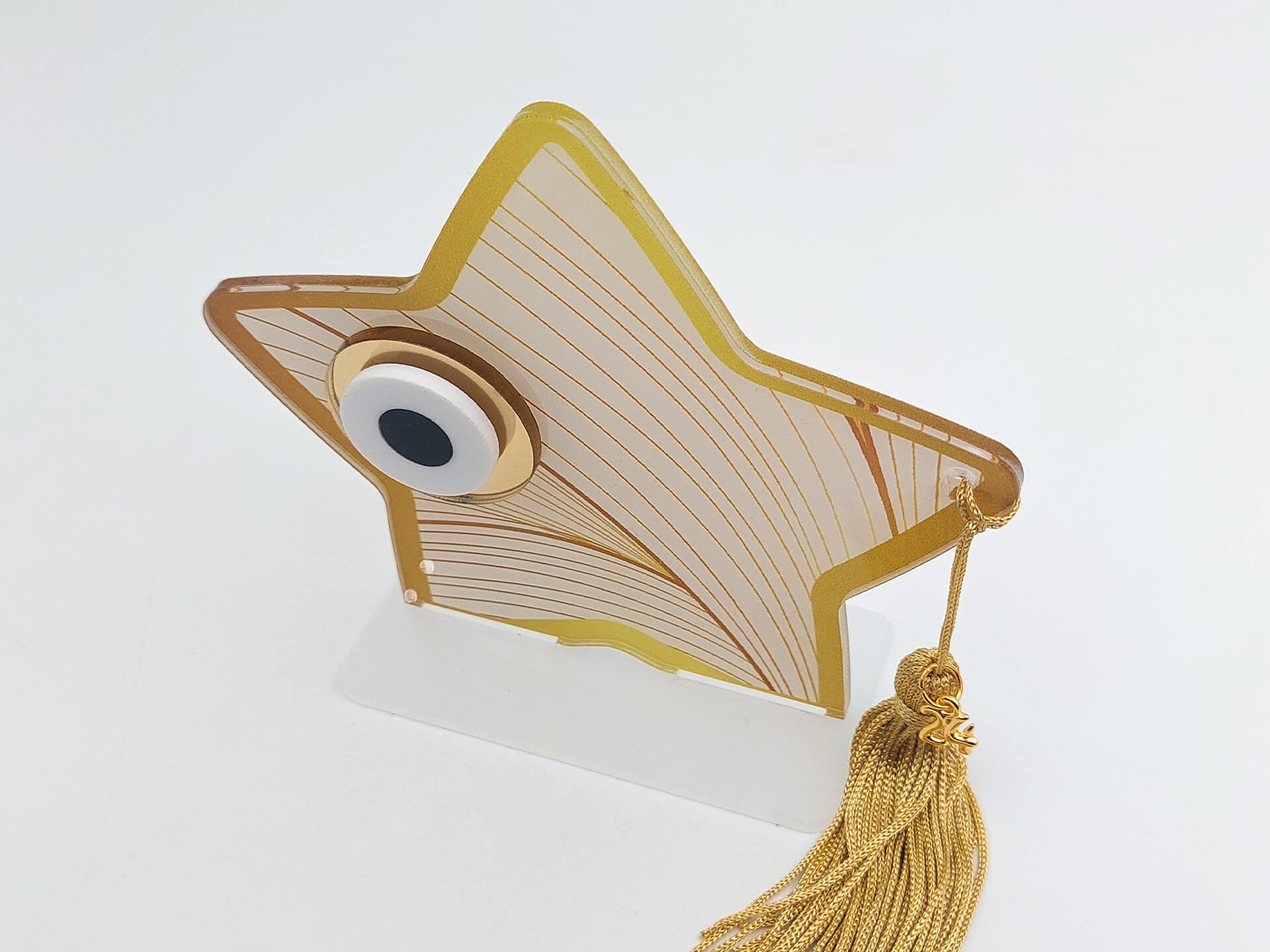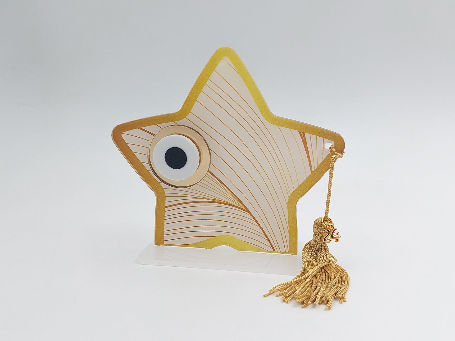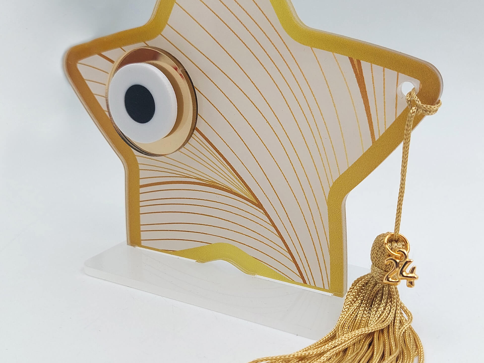 • Υλικά: Διάφανο Ακρυλικό πάχους 3mm με εκτύπωση, Χρυσή φούντα, μεταλλικό στοιχείο