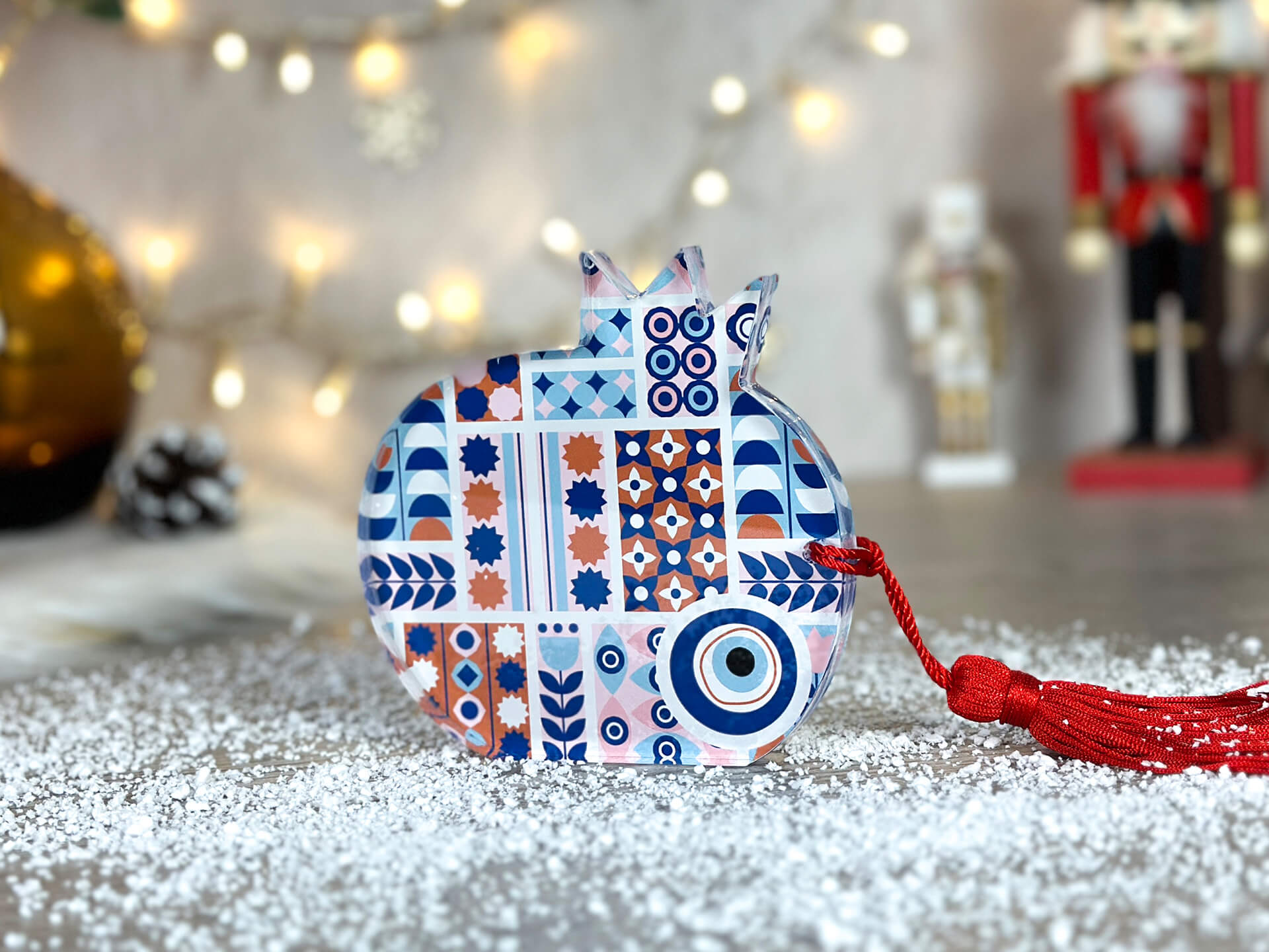 • Υλικά: Διάφανο ακρυλικό με έγχρωμη UV εκτύπωση πάχους 12mm, Κόκκινη φούντα