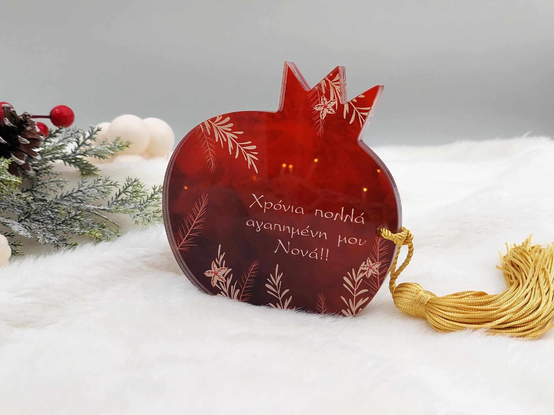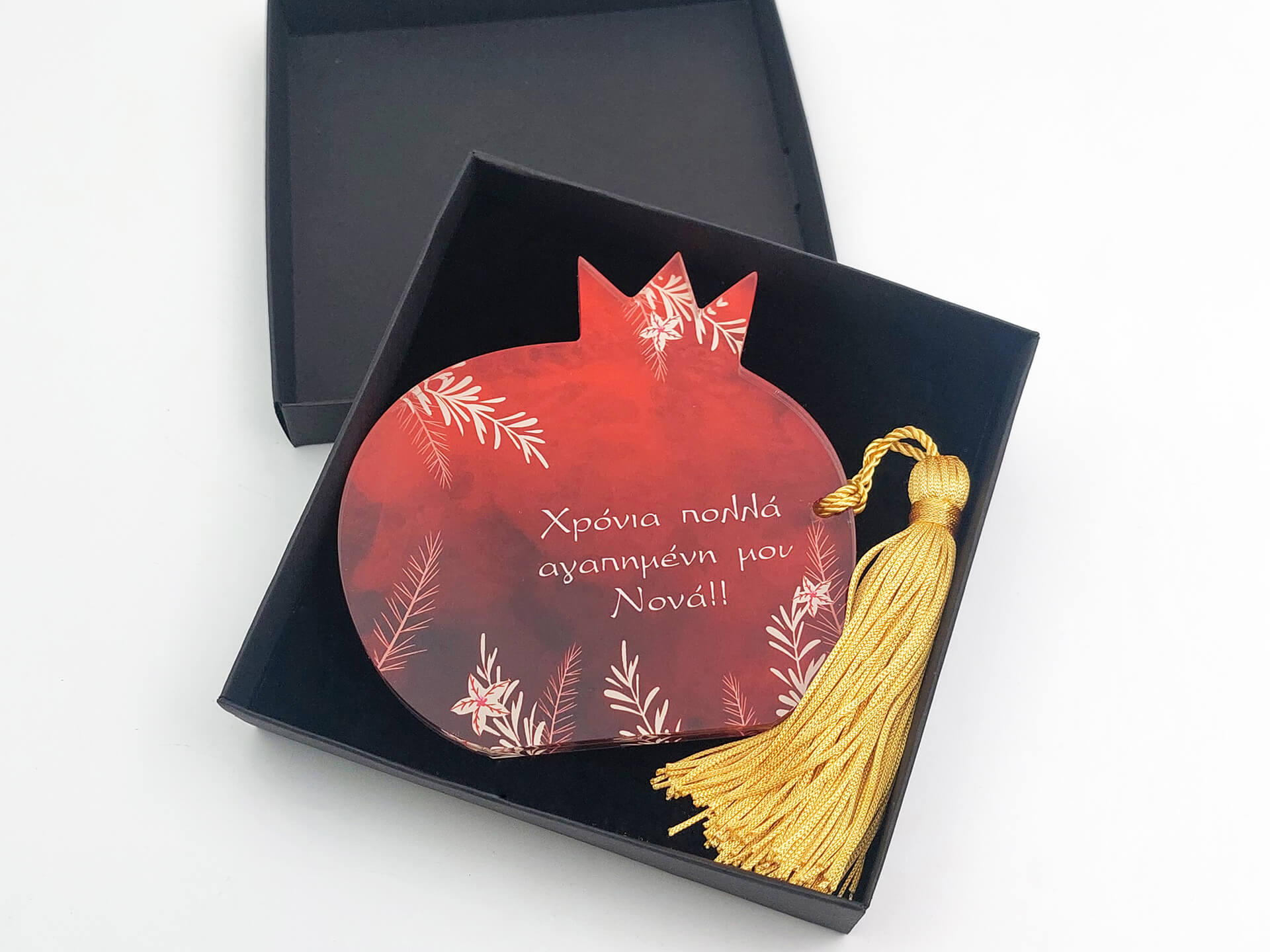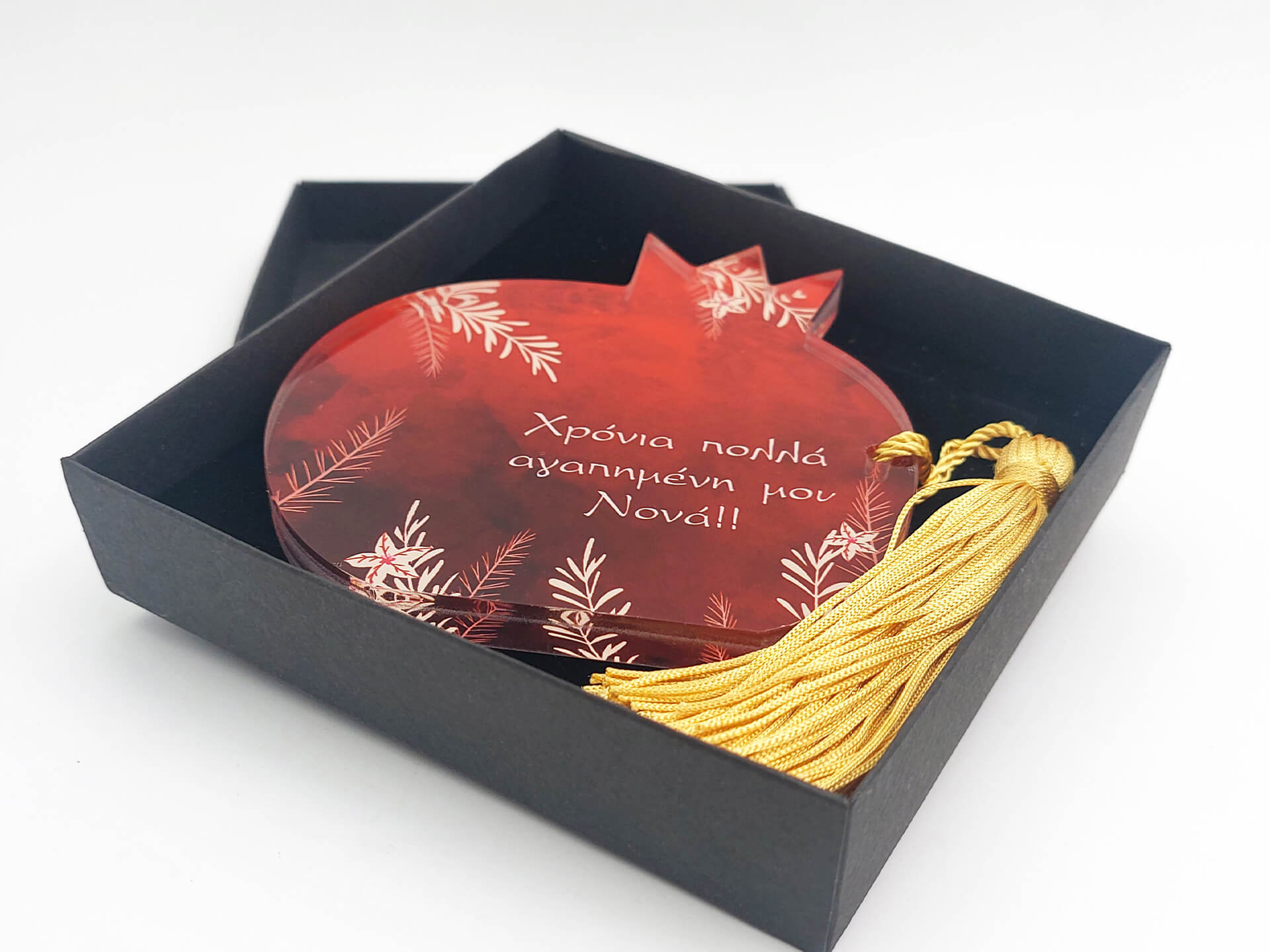 • Υλικά: Διάφανο Ακρυλικό πάχους 10mm με εκτύπωση, Χρυσή φούντα