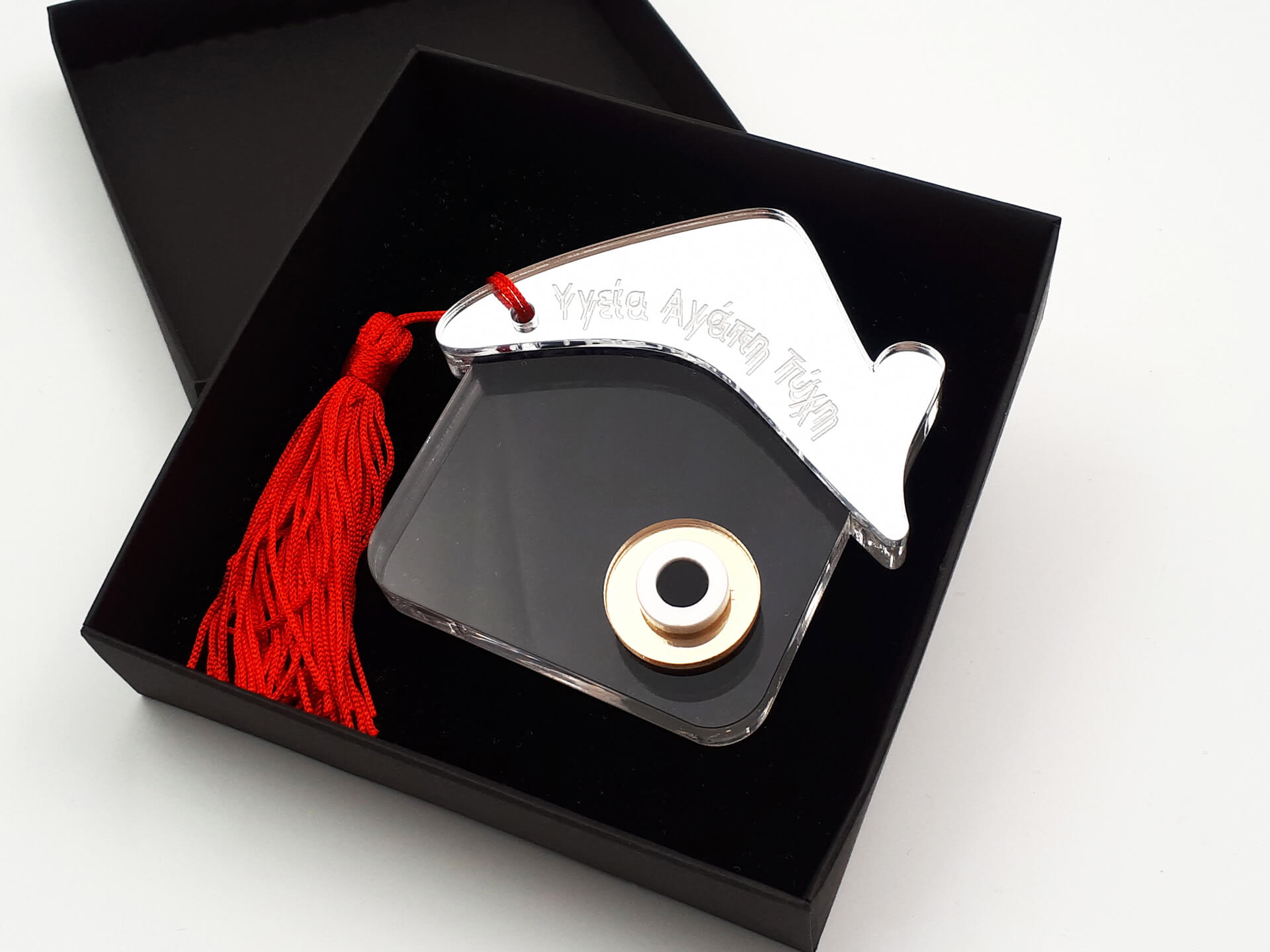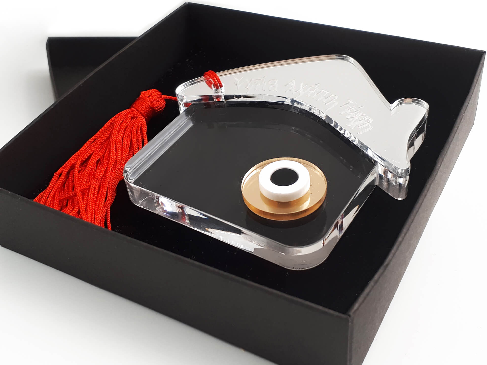 • Υλικά: Διάφανο ακρυλικό πάχους 10mm, Ακρυλικό(plexiglass) καθρέπτη ασημί 3mm, Κόκκινη φούντα
