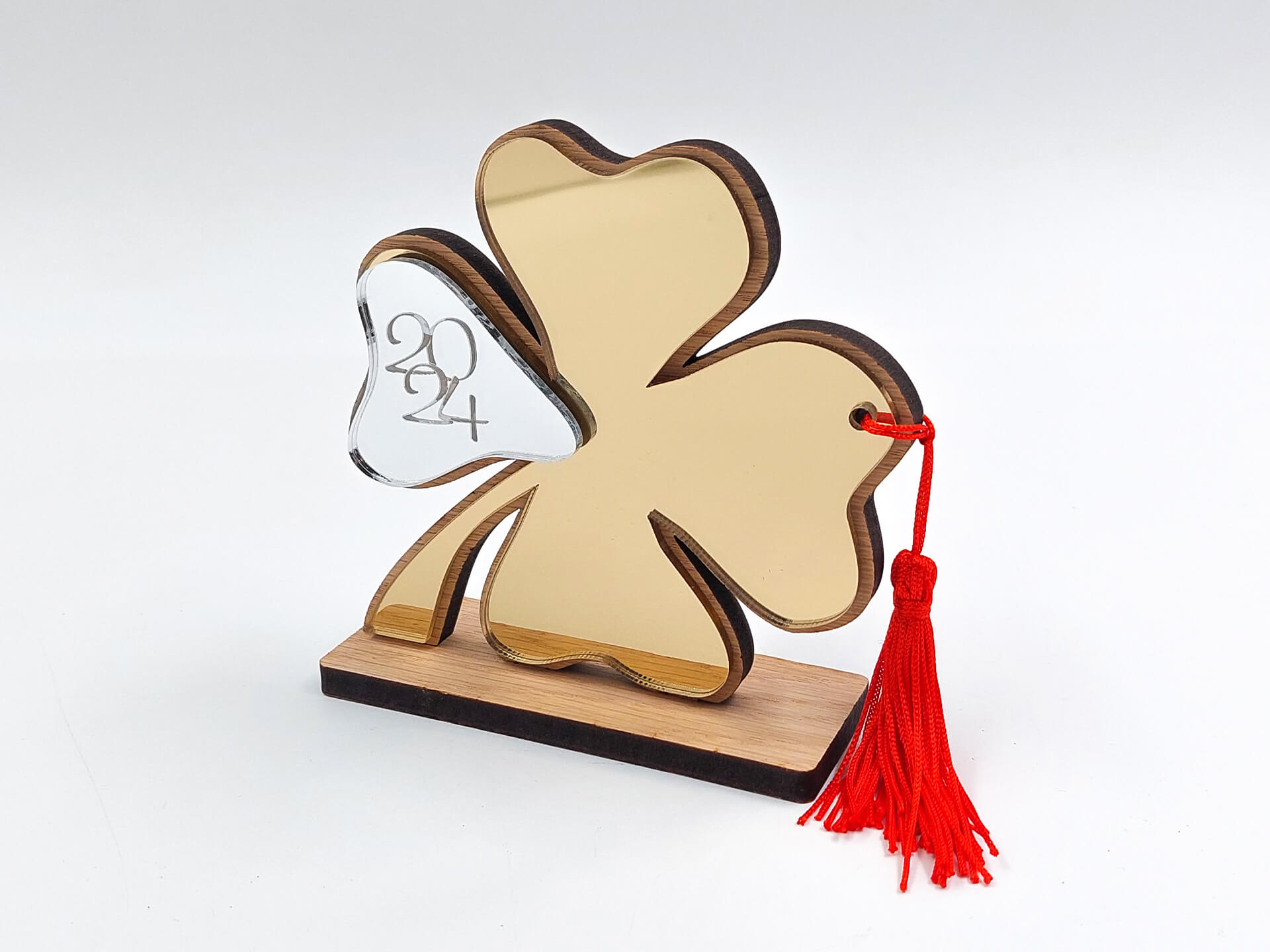 • Υλικά: Ξύλο δρυς πάχους 7mm, Ακρυλικό(plexiglass) καθρέπτης χρυσό και ασημί 3mm, Κόκκινη φούντα