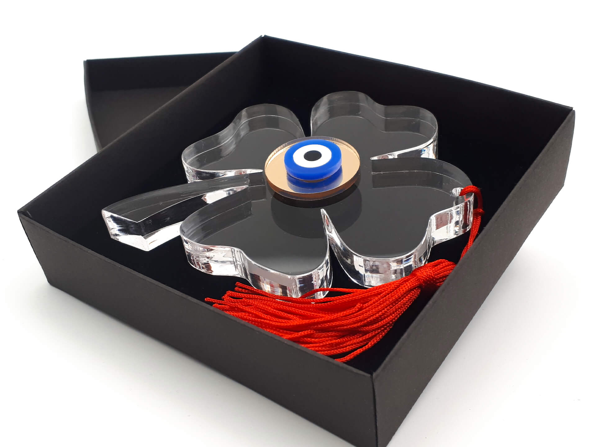 • Υλικά: Ακρυλικό διάφανο πάχους 10mm(στη μικρή διάσταση), 12mm(στη μεσαία και μεγάλη διάσταση), Ακρυλικό μπλε, λευκό και μαύρο 3mm, Ακρυλικό(plexiglass) καθρέπτης χρυσό 3mm, Κόκκινη φούντα