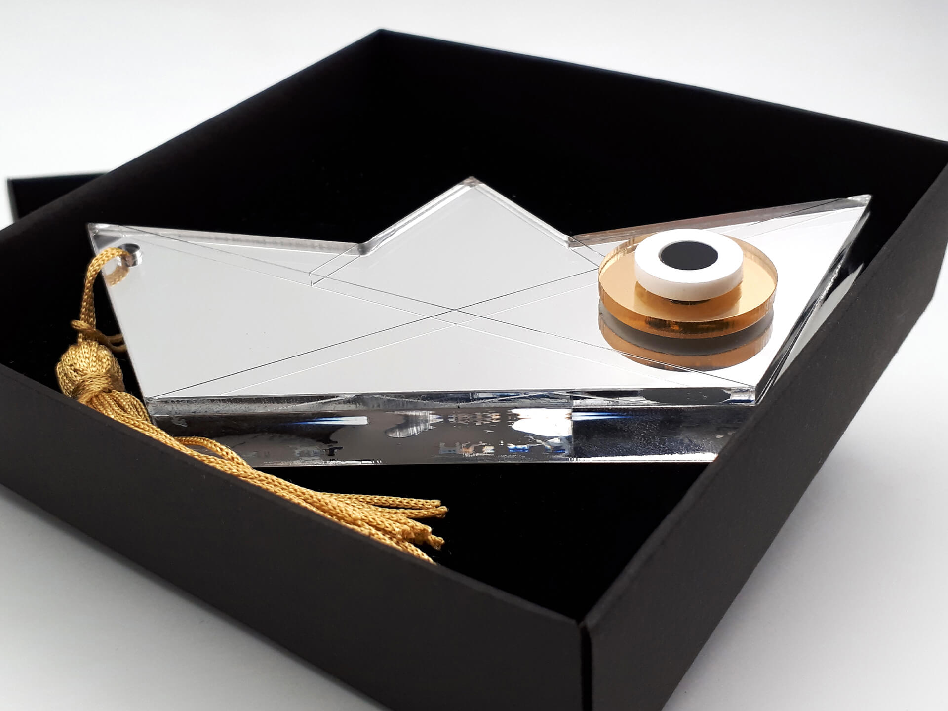 • Υλικά: Διάφανο ακρυλικό πάχους 10mm, Ακρυλικό(plexiglass) καθρέπτης ασημί και χρυσός 3mm, Χρυσή φούντα