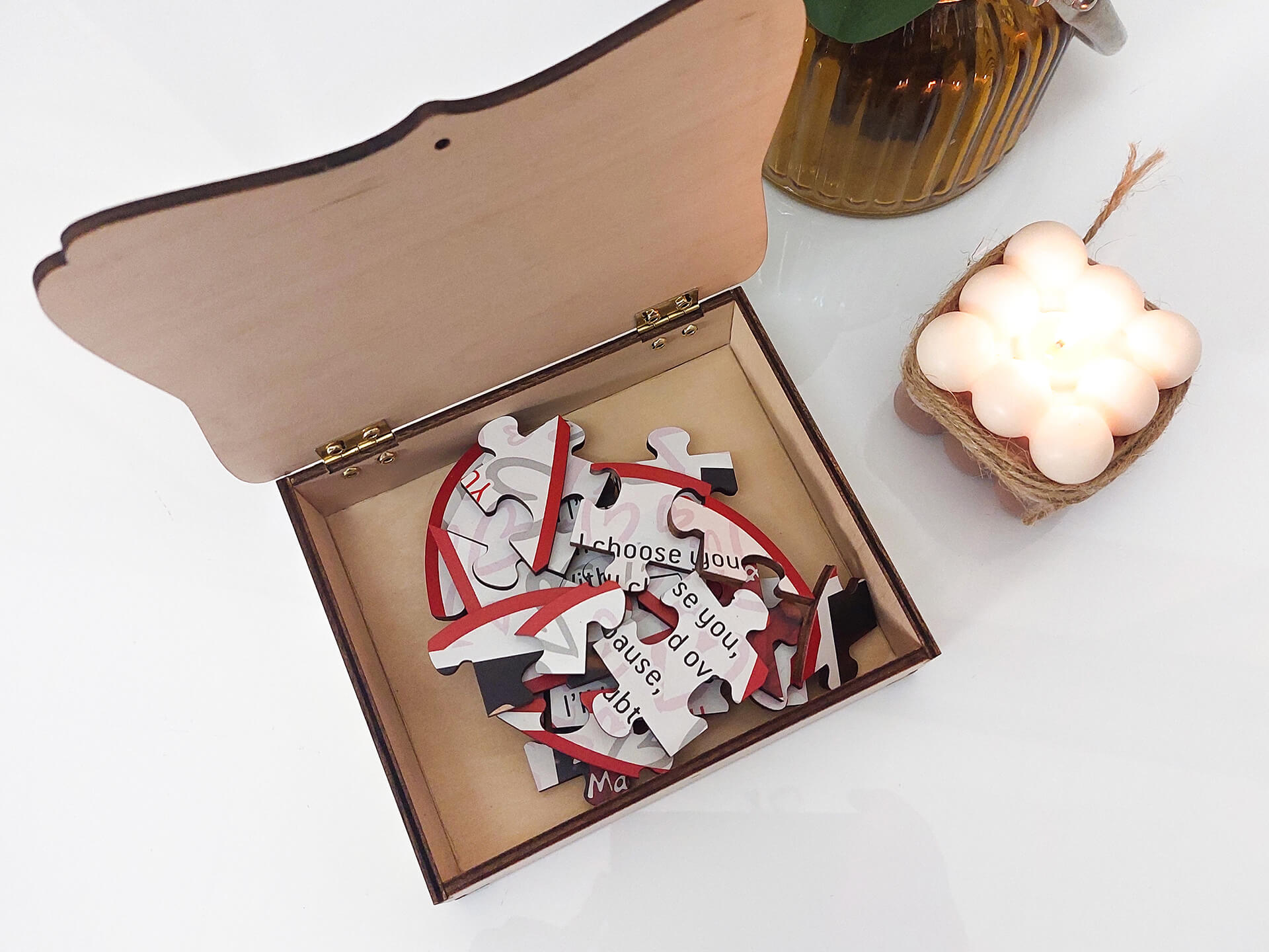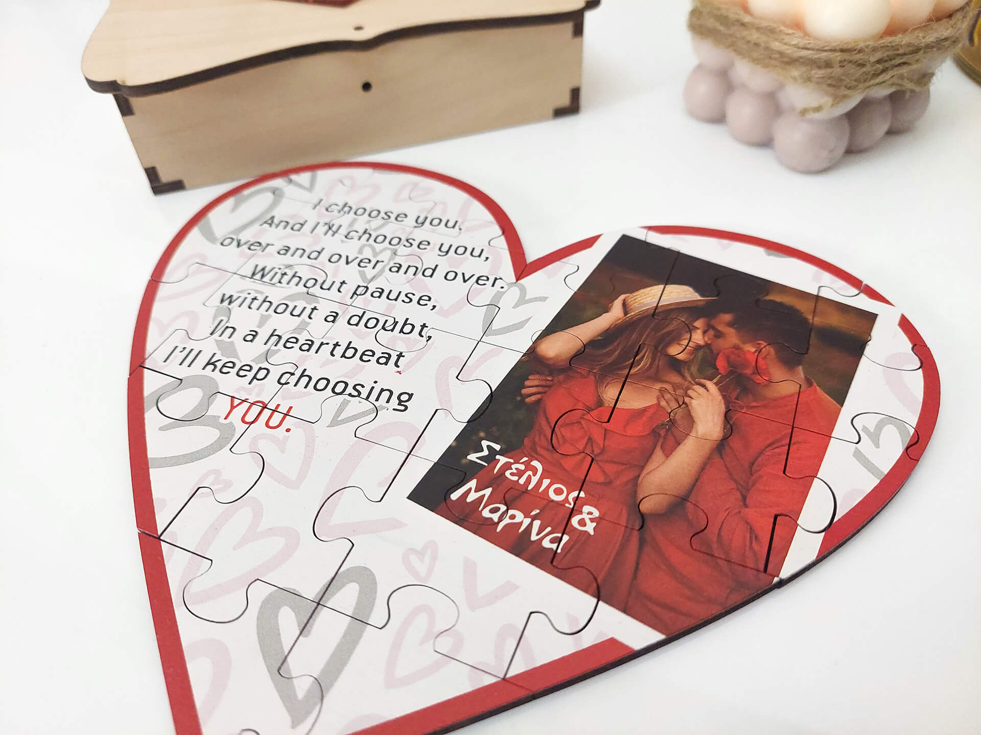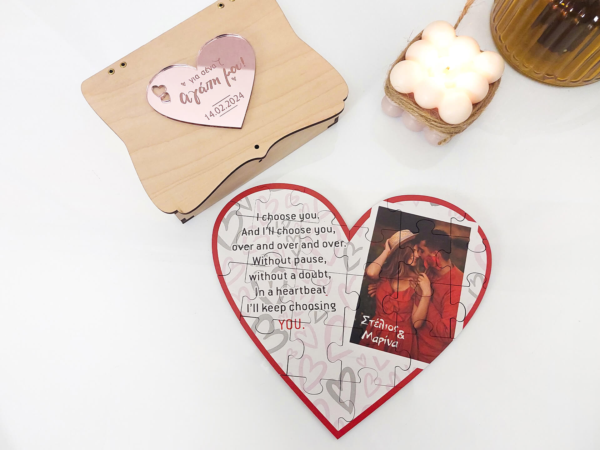 Επιλέξτε ένα ιδιαίτερο δώρο για το άλλο σας μισό και εντυπωσιάστε! Ξύλινο παζλ καρδιά με εκτύπωση της φωτογραφίας σας και κουτάκι με τη δική σας αφιέρωση.