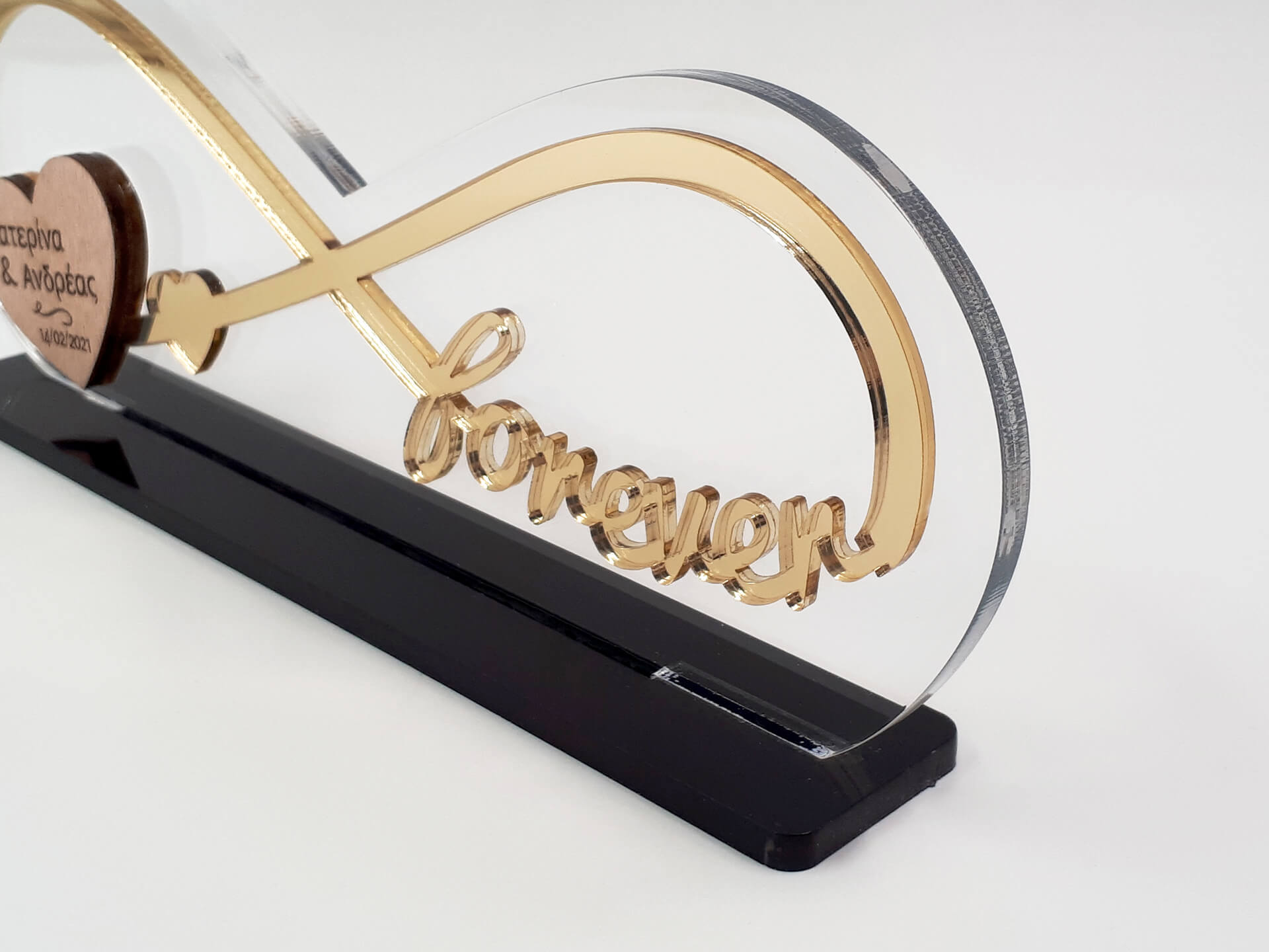 • Υλικά: Ακρυλικό διάφανο πάχους 6mm, Plexiglass καθρέπτης χρυσός πάχους 3mm, Μαύρο ακρυλικό πάχους 5mm, Ξύλο κόντρα πλακέ οκουμέ πάχους 4mm