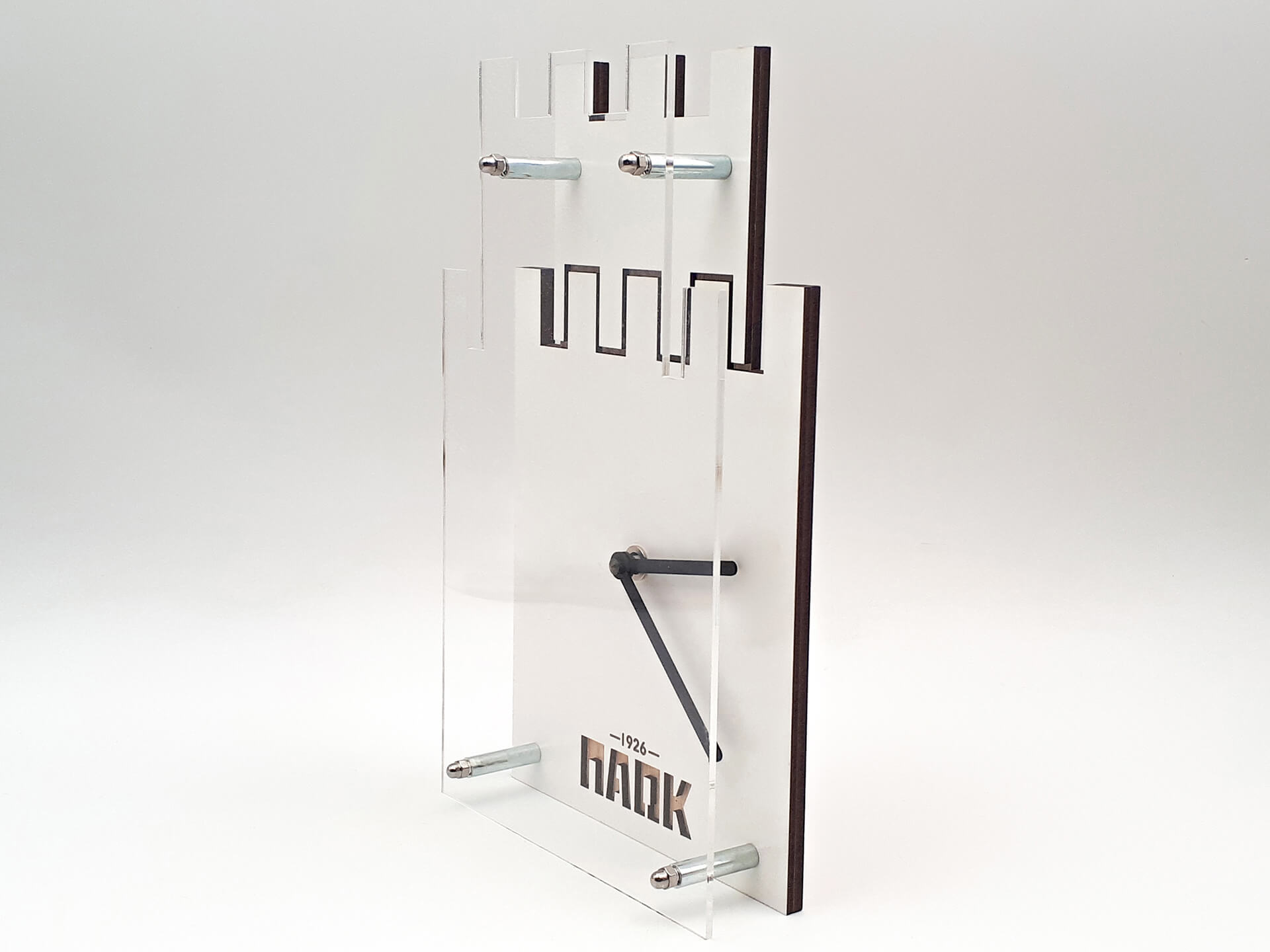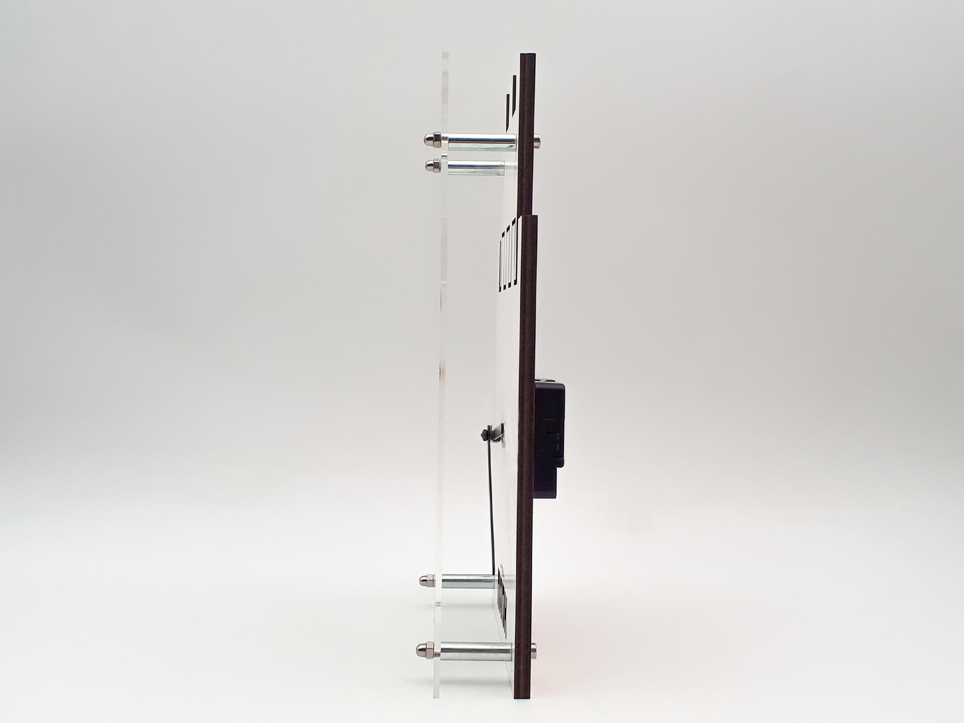 • Υλικά: Ξύλο mdf λακσριστό δρύς, ξύλο mdf λευκό και μαύρο λακαριστό, διάφανο ακρυλικό, μεταλλικοί αποστάτες