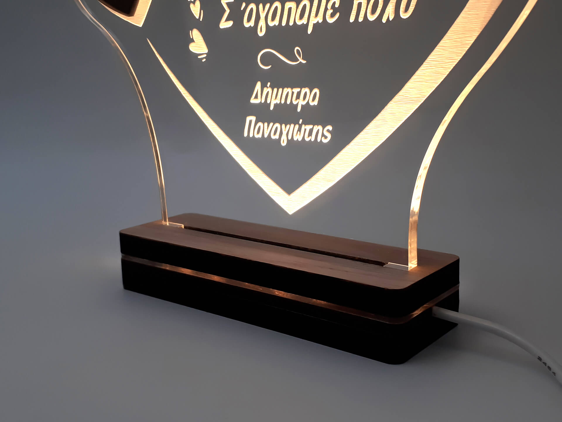 Φωτιστικό Led από ακρυλικό και ξύλινη χειροποίητη βάση δικής μας πρωτοποριακής σχεδίασης και κατασκευής.