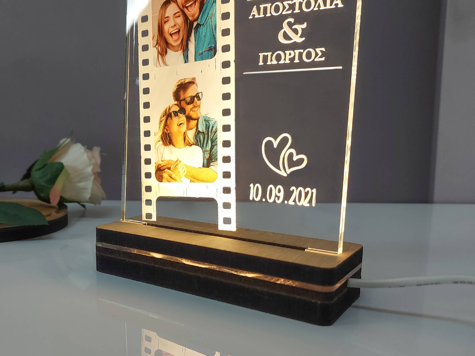 • Υλικά: Led λευκού χρώματος, Ακρυλικό διάφανο πάχους 6mm, Χειροποίητη βάση από ξύλο και ακρυλικό