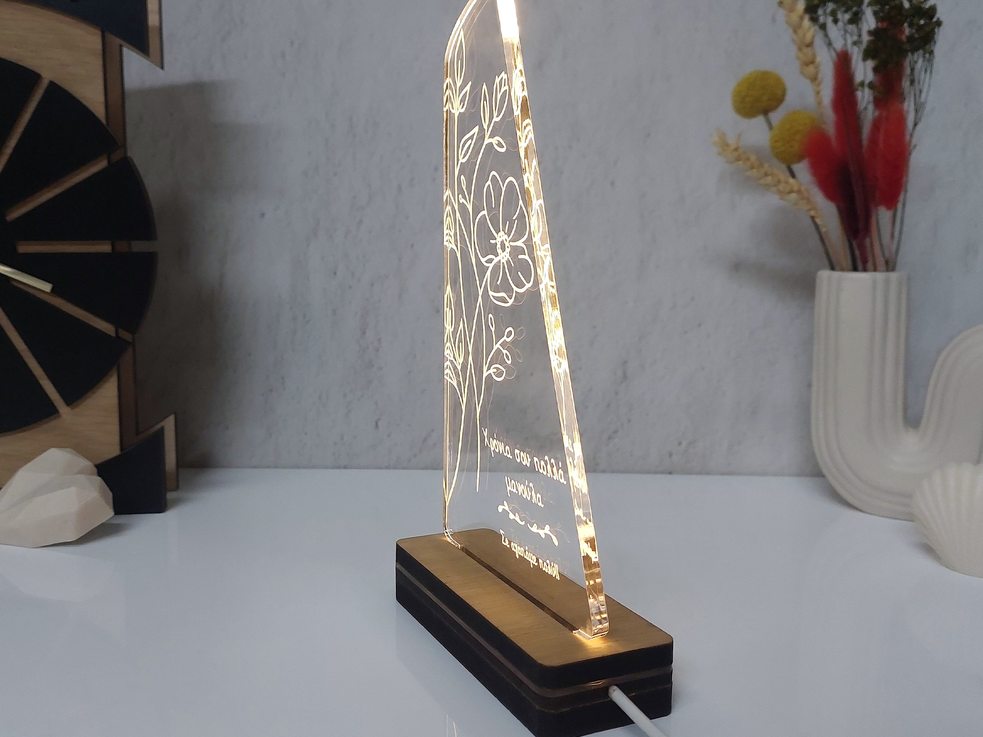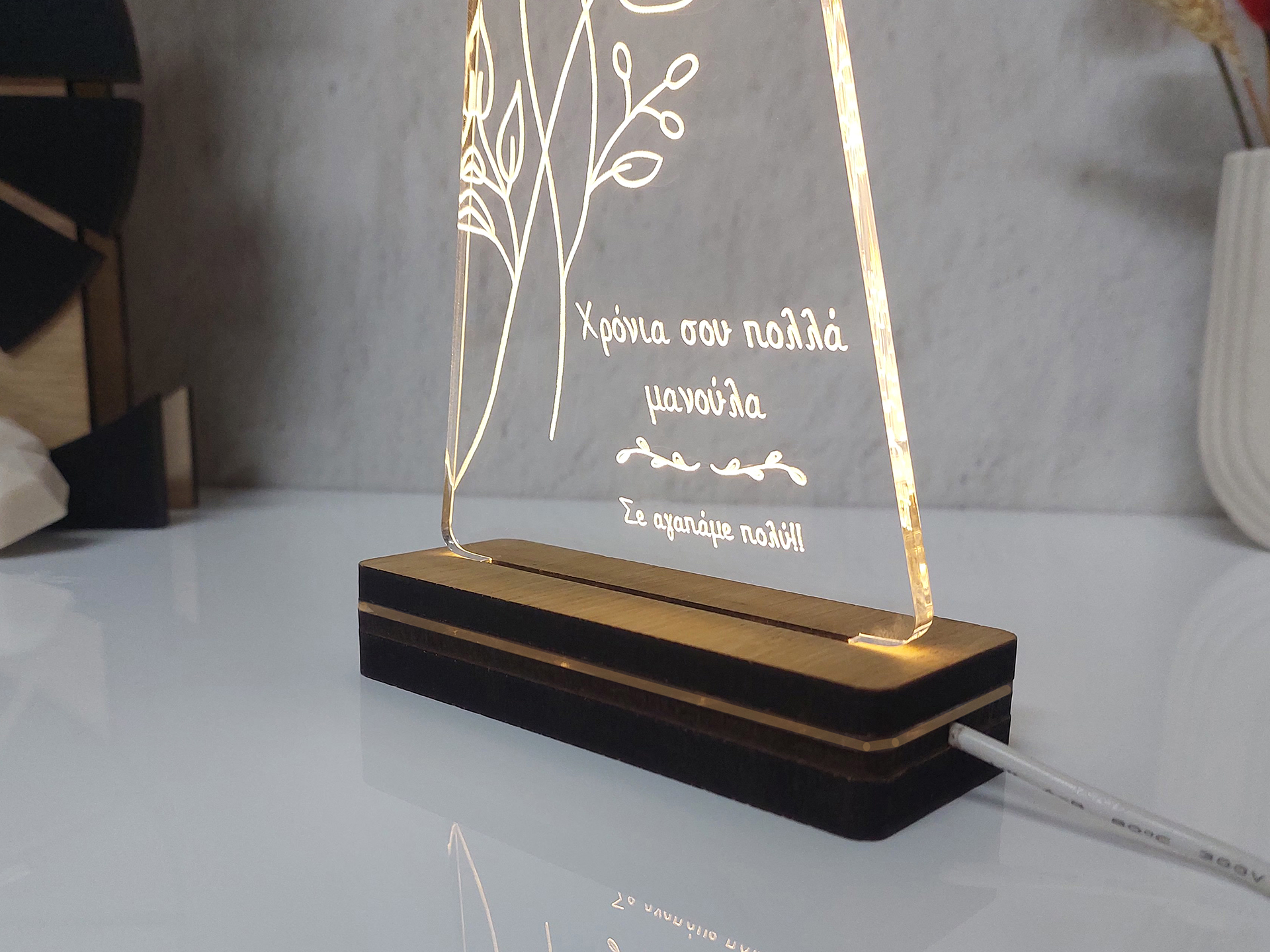 • Υλικά: Led λευκού χρώματος, Ακρυλικό διάφανο πάχους 6mm, Χειροποίητη βάση από ξύλο και ακρυλικό