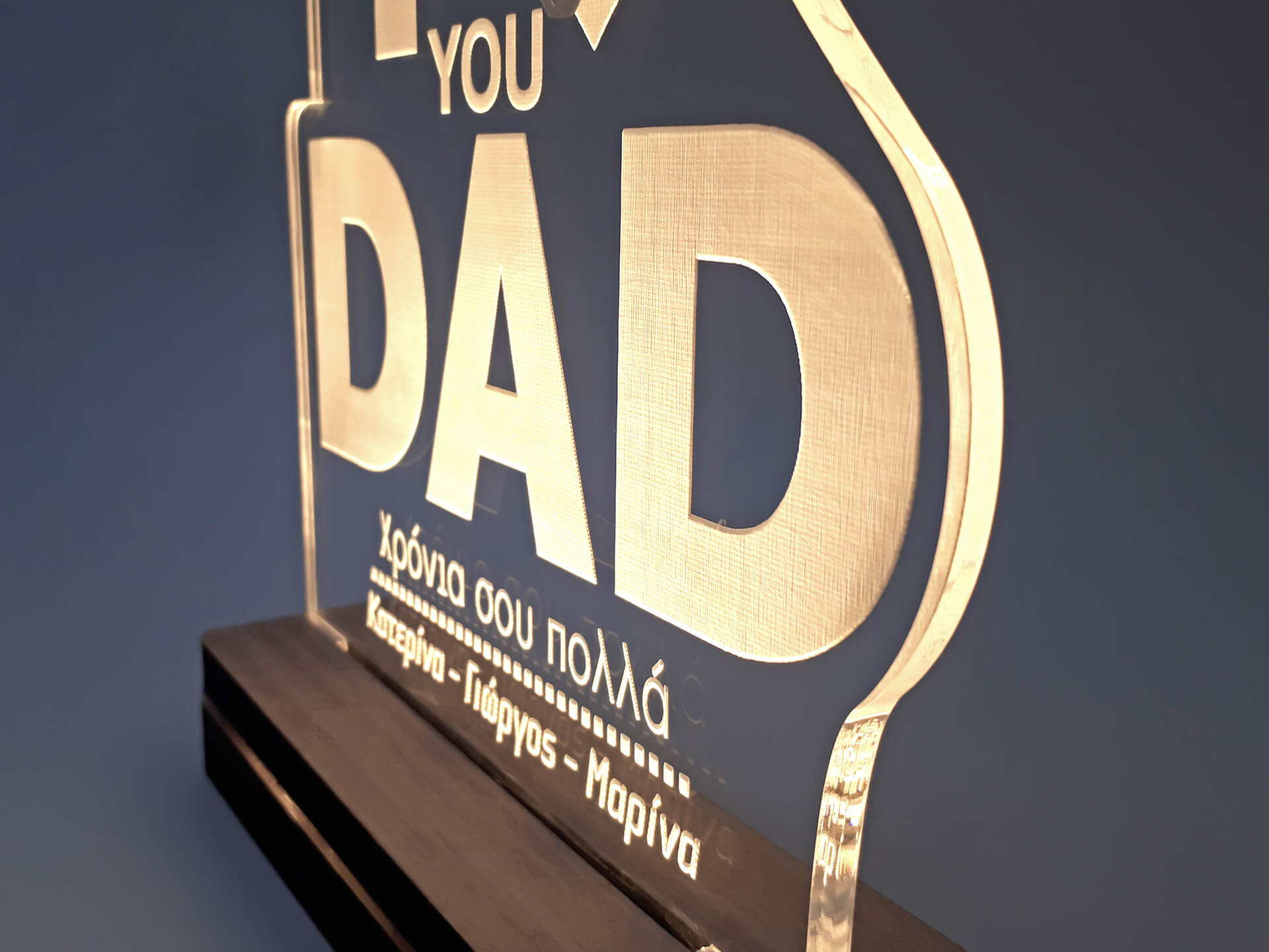 • Υλικά: Led λευκού χρώματος, Ακρυλικό διάφανο πάχους 6mm, Χειροποίητη βάση από ξύλο και ακρυλικό, Λεπτομέρεια από Ακρυλικό(plexiglass) καθρέπτης ασημί πάχους 3mm