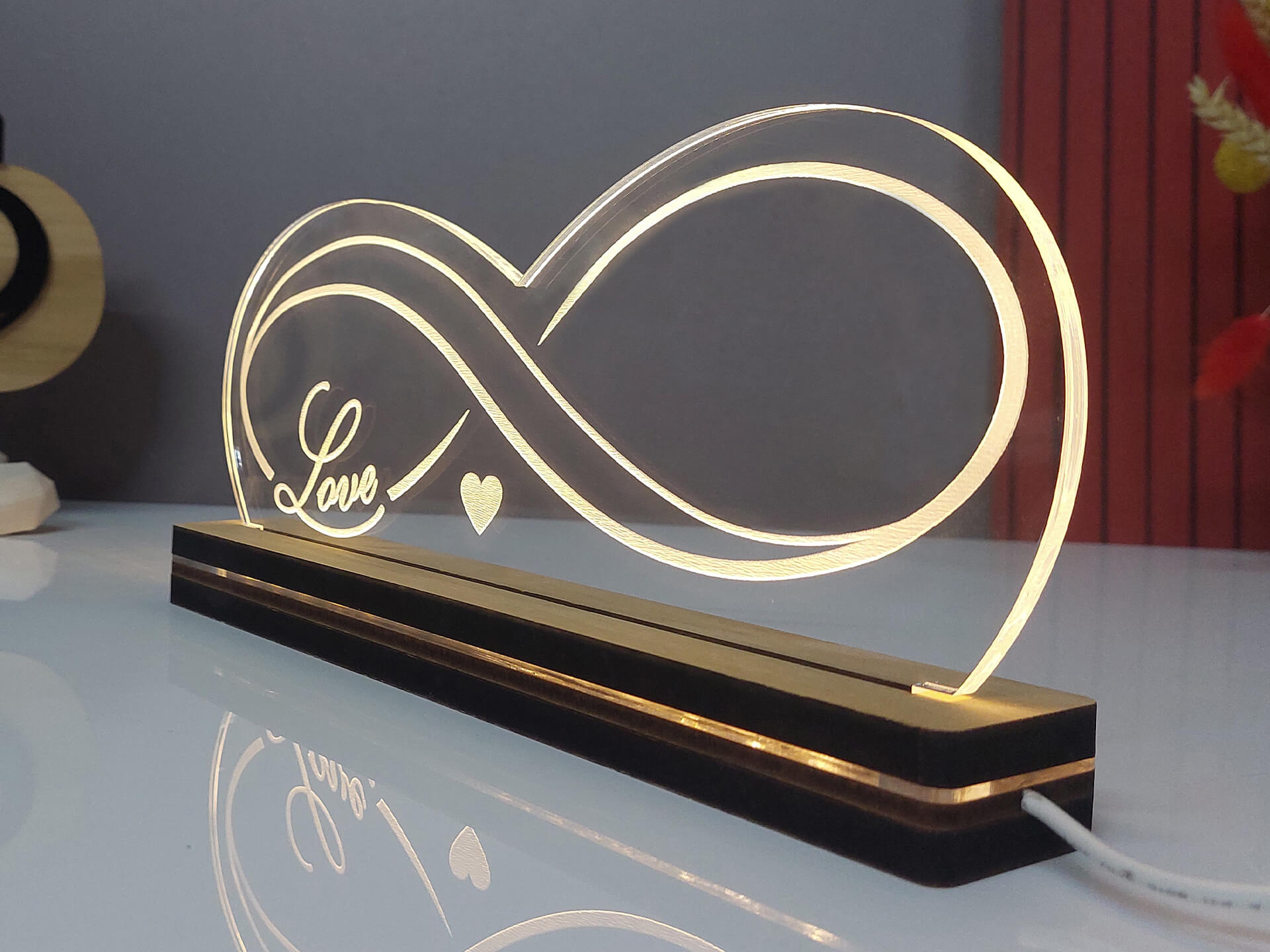 • Υλικά: Led λευκού χρώματος, Ακρυλικό διάφανο πάχους 6mm, Χειροποίητη βάση από ξύλο και ακρυλικό