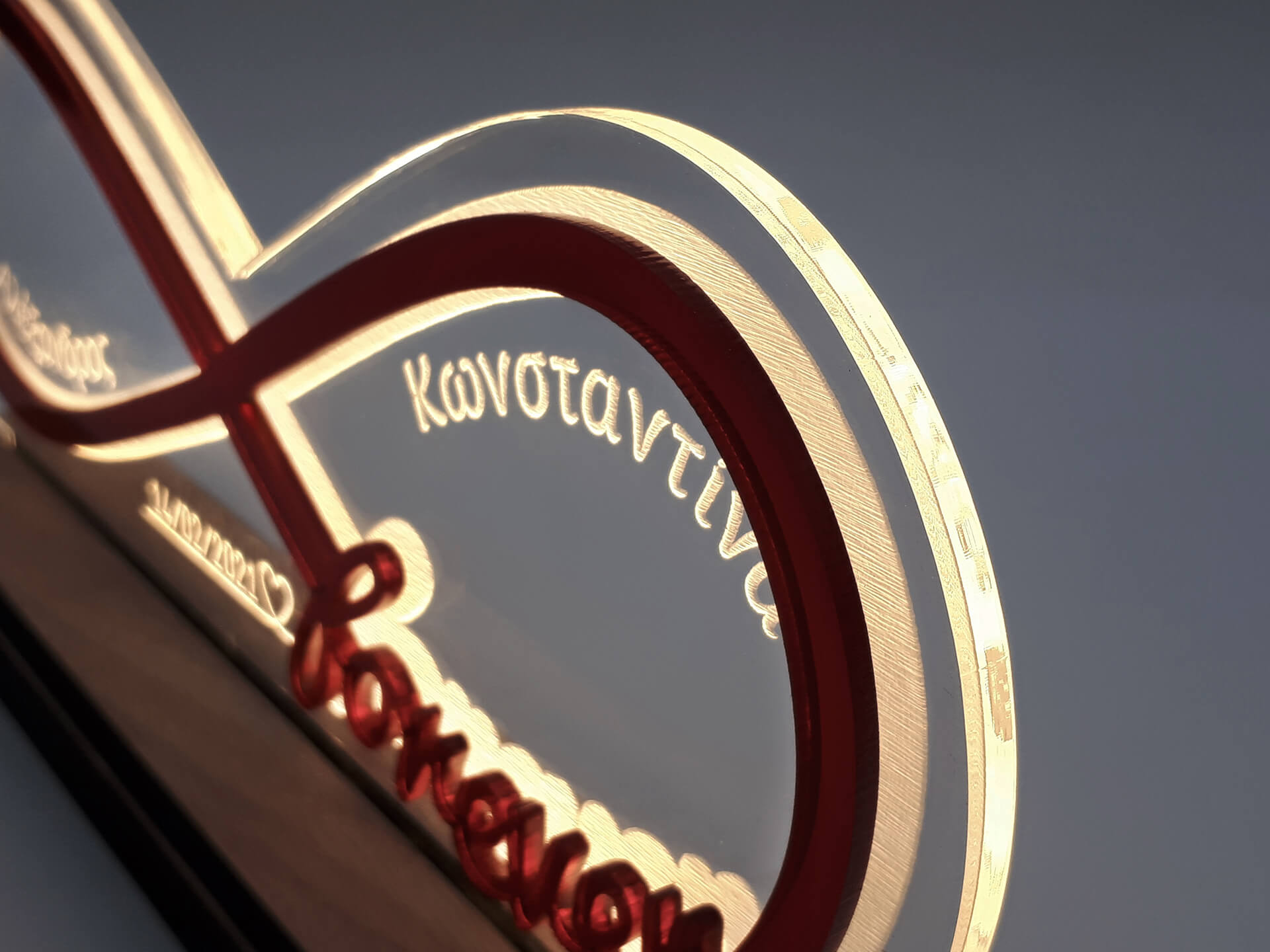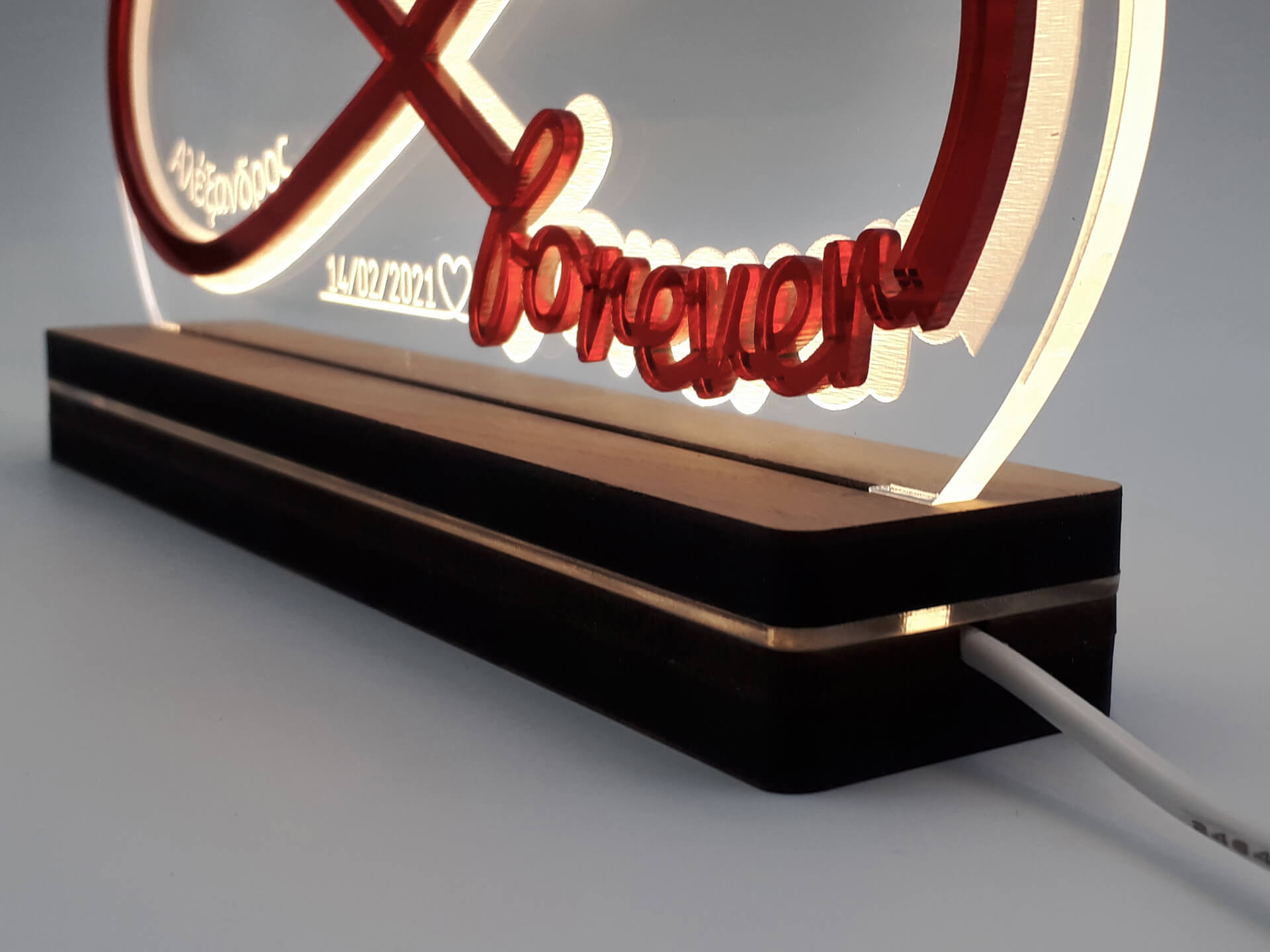 • Υλικά: Led λευκού χρώματος, Ακρυλικό διάφανο πάχους 6mm, Plexiglass καθρέπτης κόκκινο πάχους 3mm, Χειροποίητη βάση από ξύλο και ακρυλικό