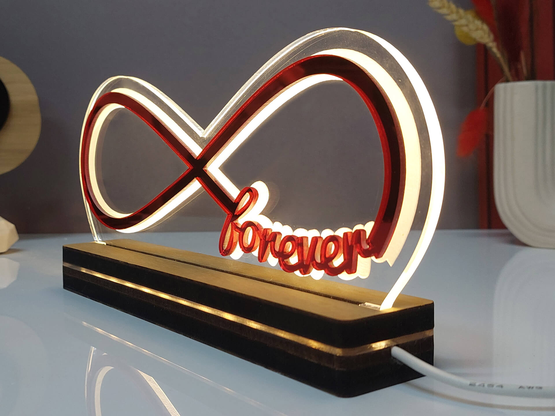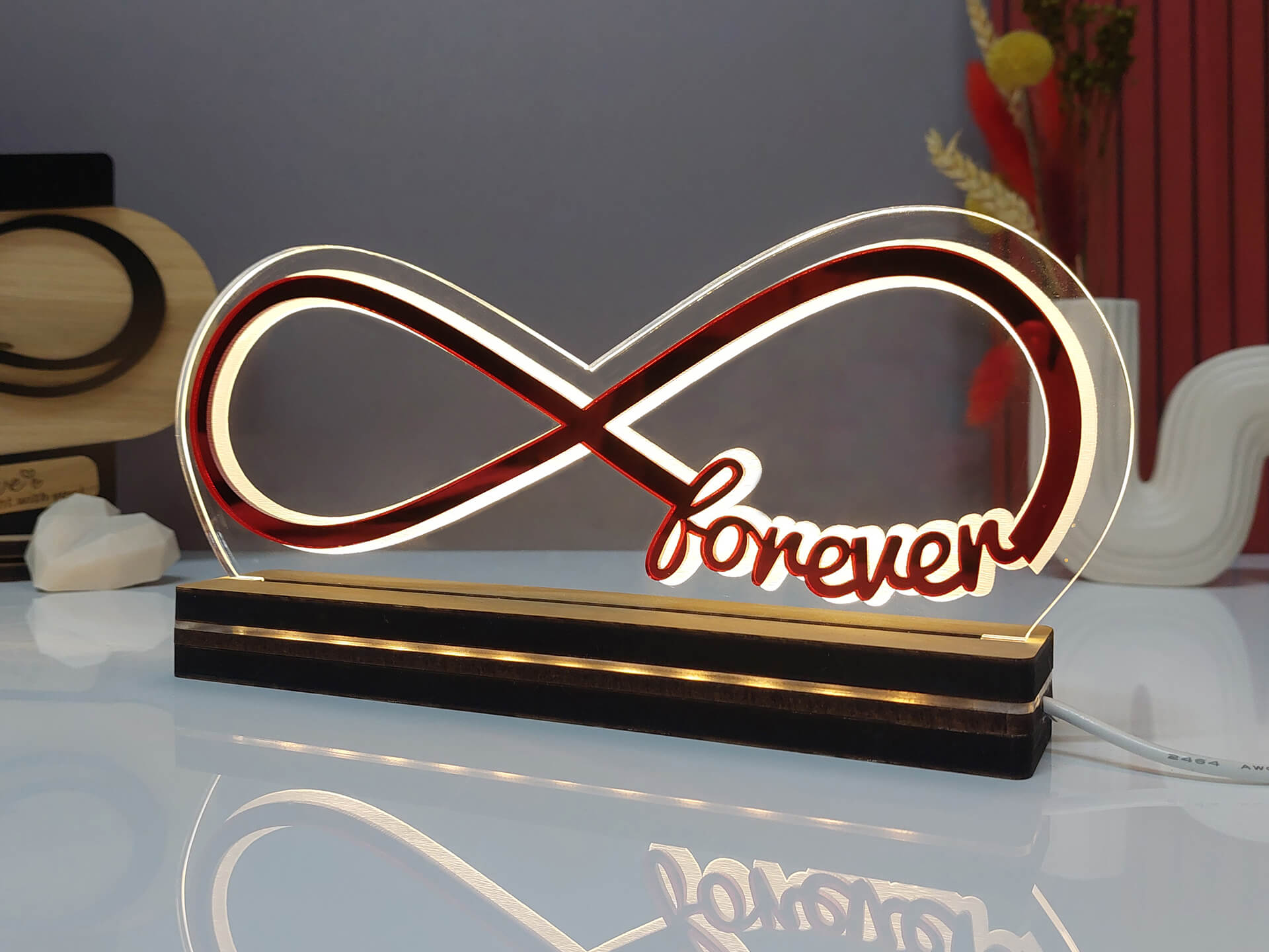 • Υλικά: Led λευκού χρώματος, Ακρυλικό διάφανο πάχους 6mm, Plexiglass καθρέπτης κόκκινο πάχους 3mm, Χειροποίητη βάση από ξύλο και ακρυλικό