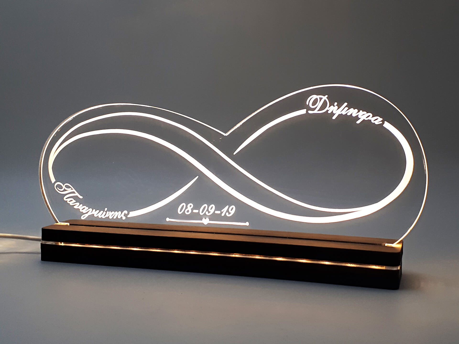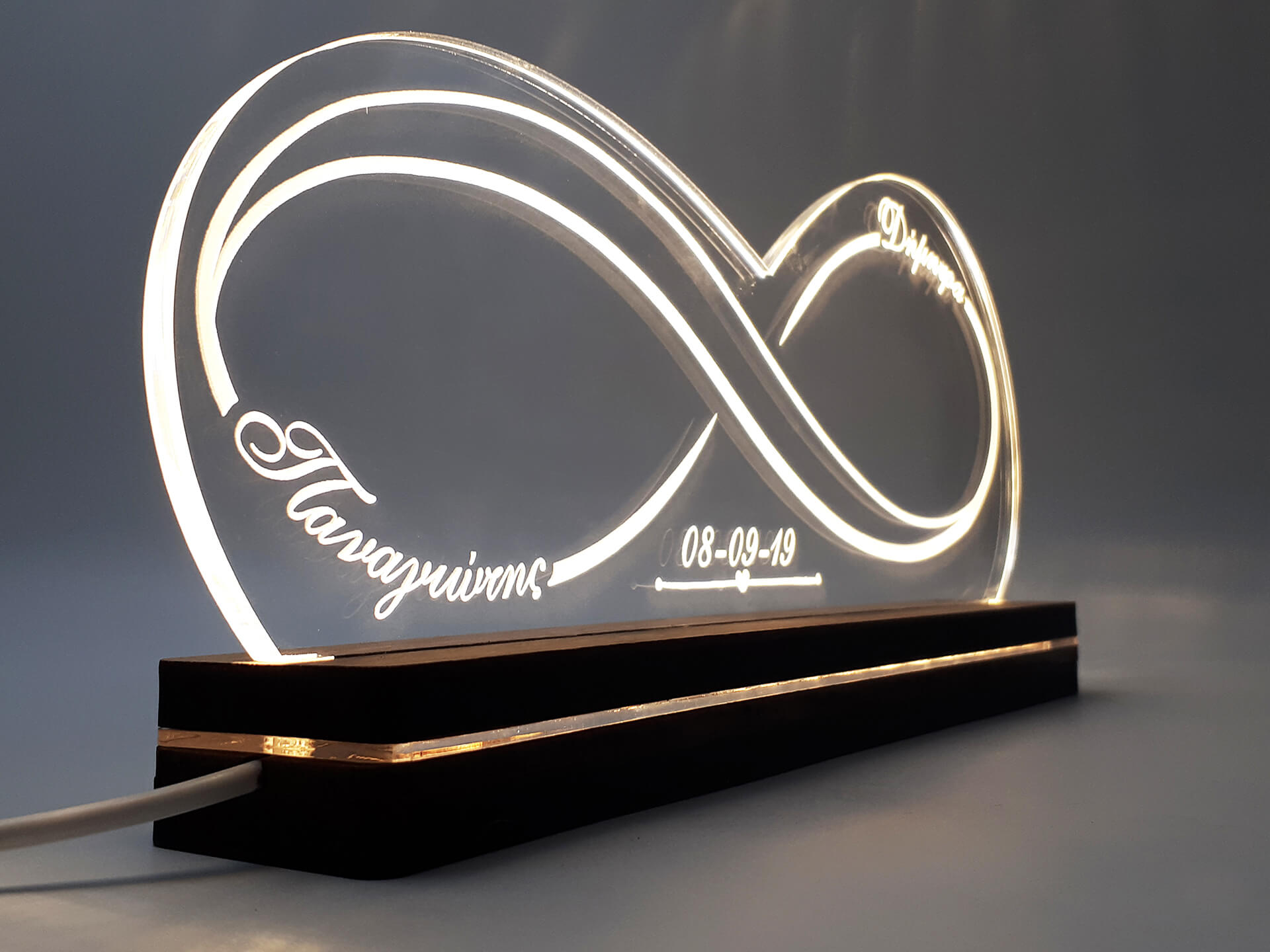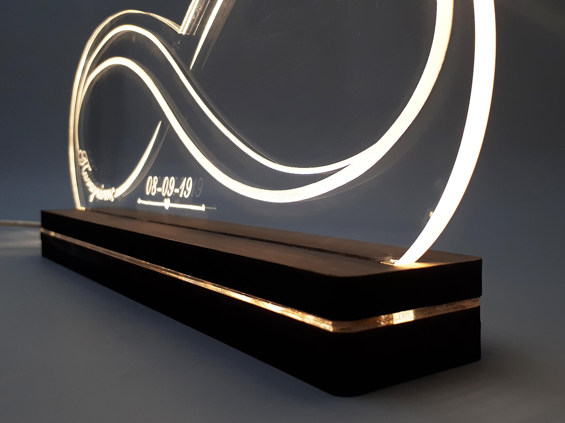 • Υλικά: Led λευκού χρώματος, Ακρυλικό διάφανο πάχους 6mm, Χειροποίητη βάση από ξύλο και ακρυλικό