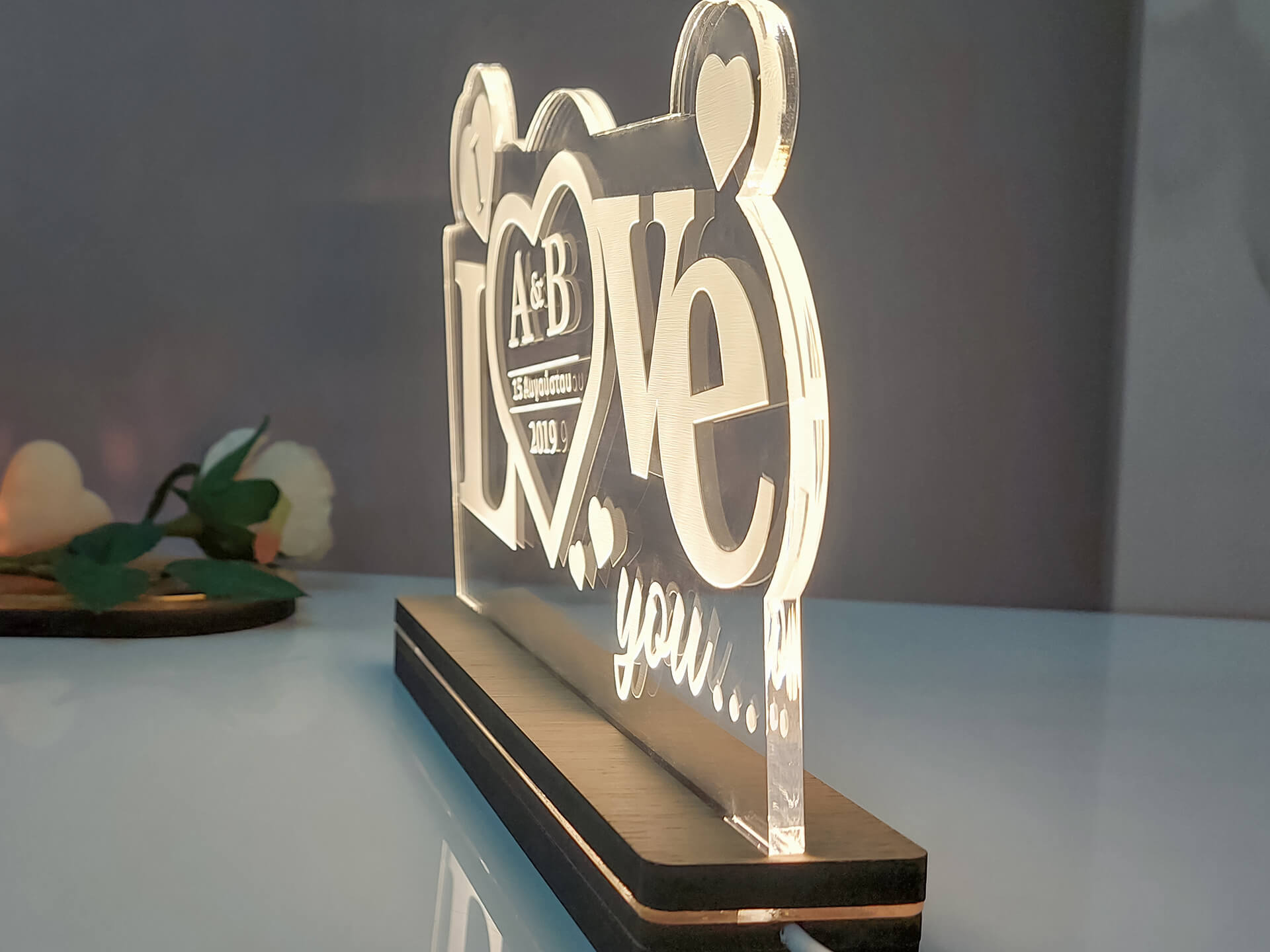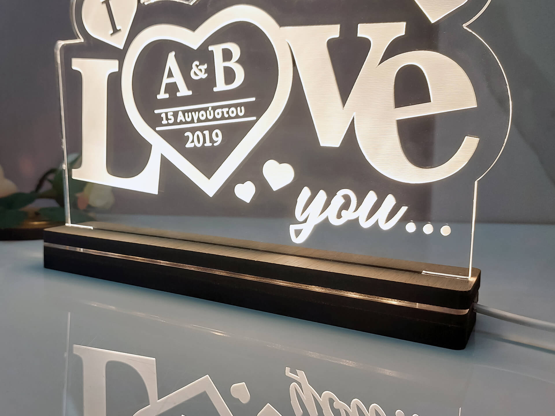 • Υλικά: Led λευκού χρώματος, Ακρυλικό διάφανο πάχους 6mm, Χειροποίητη βάση από ξύλο και ακρυλικό