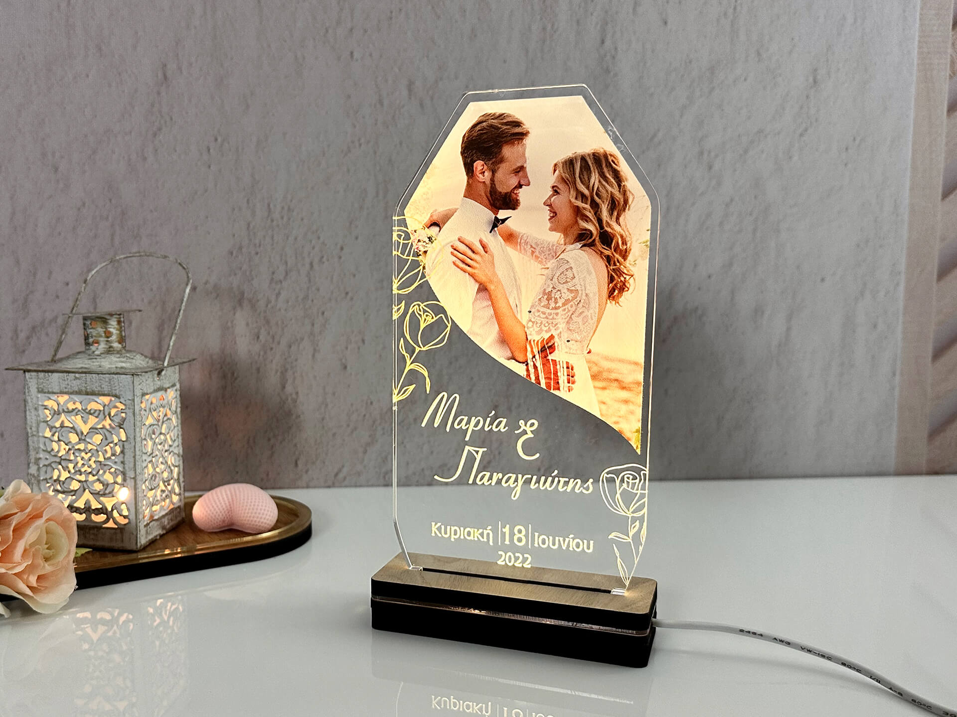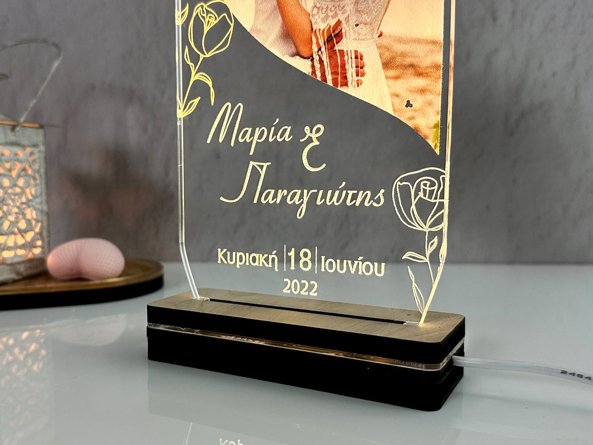 • Υλικά: Led λευκού χρώματος, Ακρυλικό διάφανο πάχους 6mm, Χειροποίητη βάση από ξύλο και ακρυλικό