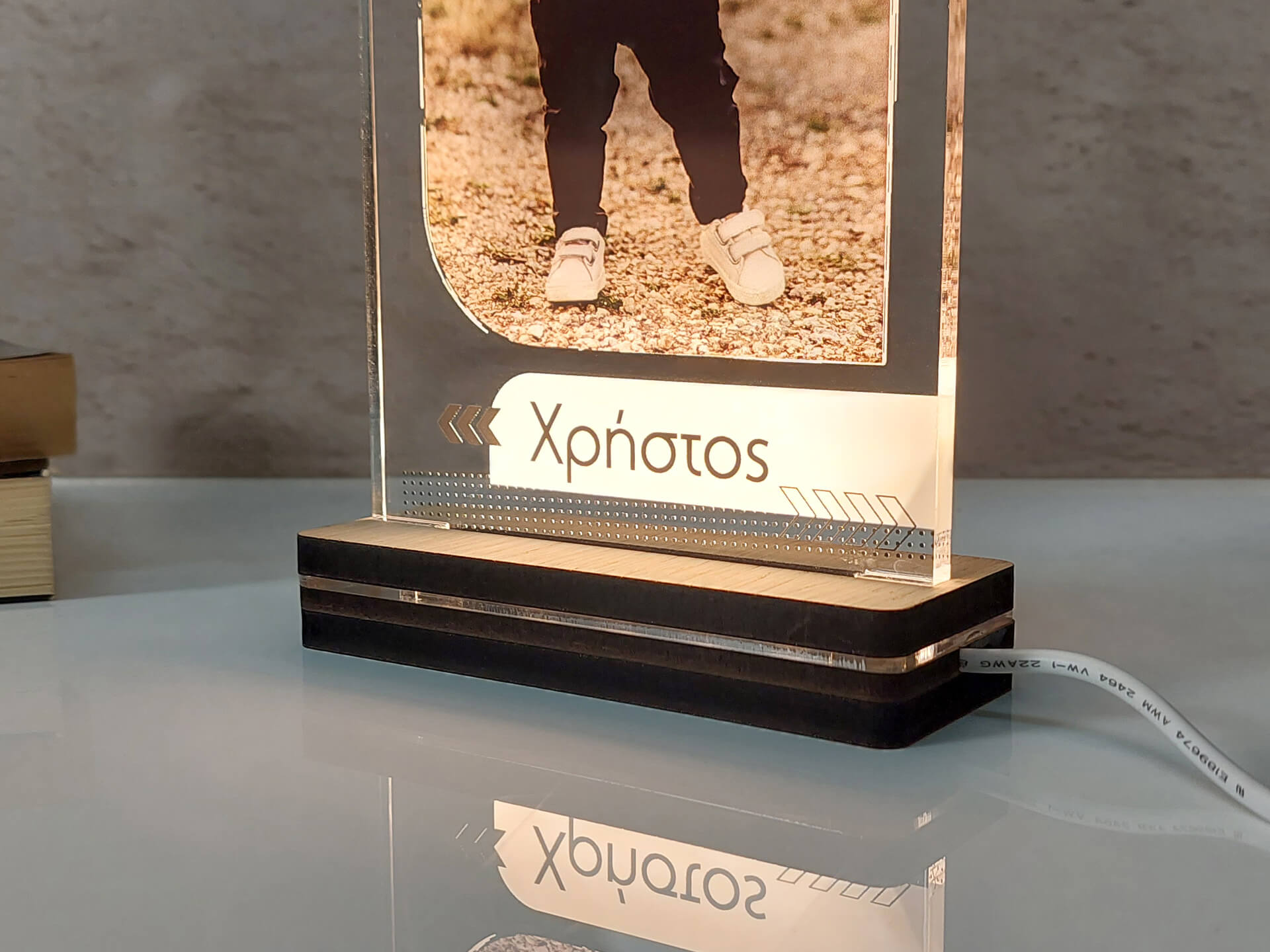 • Υλικά: Led λευκού χρώματος, Ακρυλικό διάφανο πάχους 6mm, Χειροποίητη βάση από ξύλο και ακρυλικό