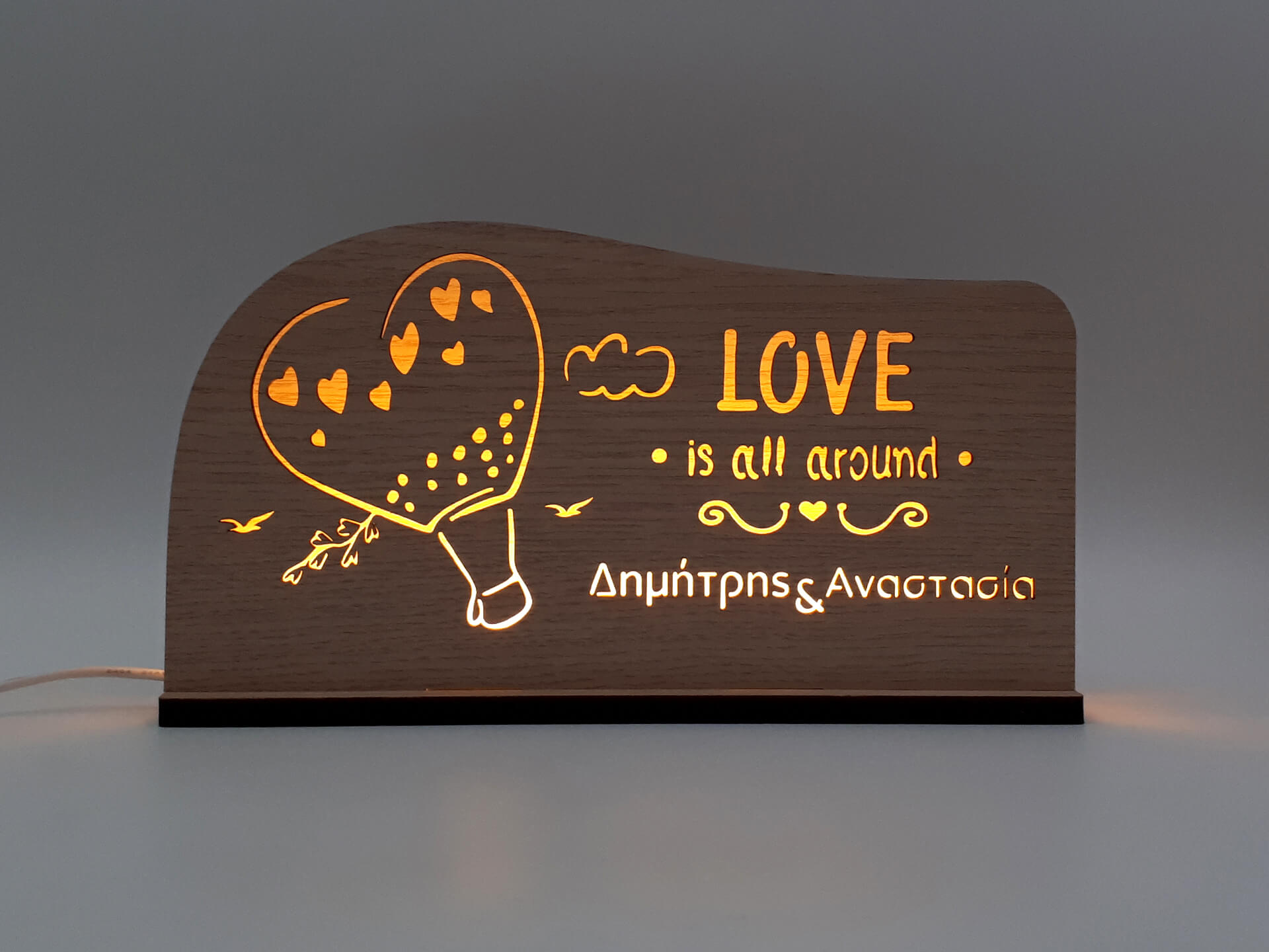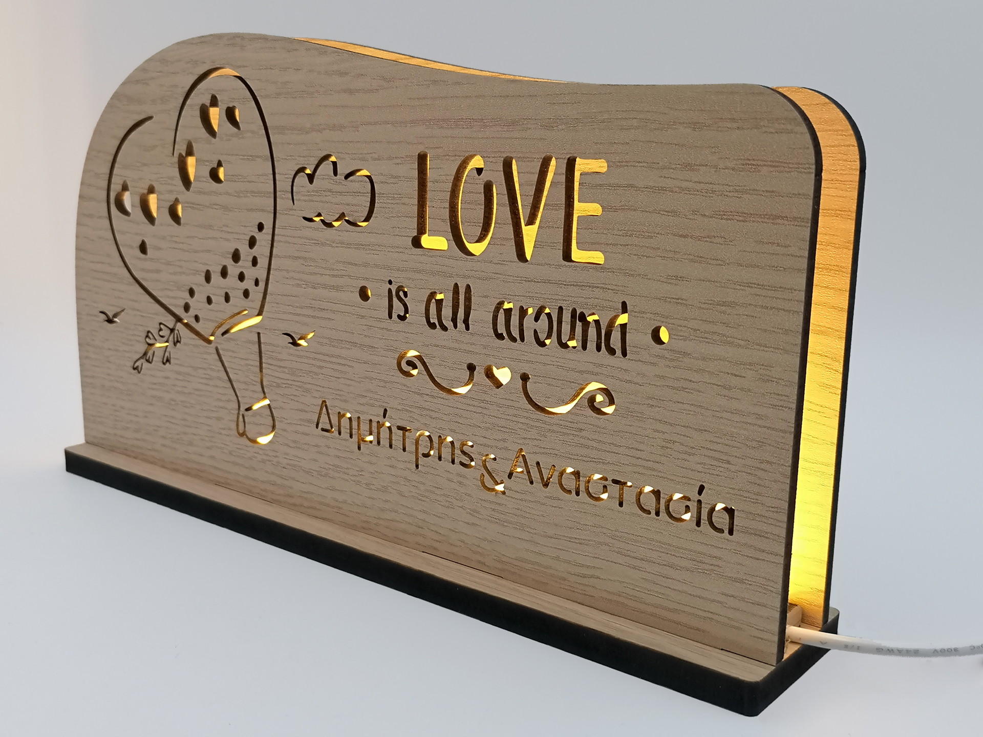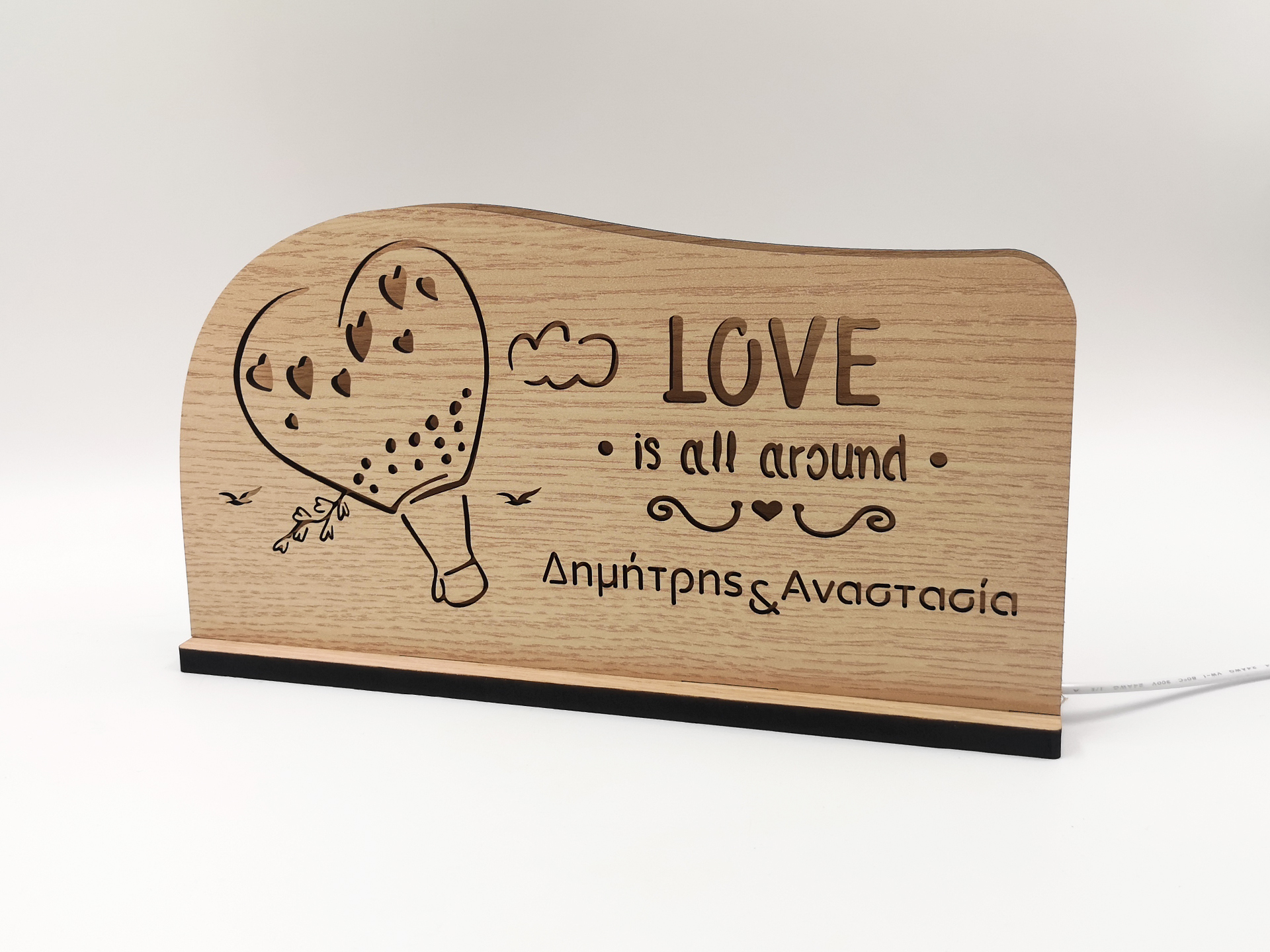• Υλικά: Led λευκού χρώματος, Ξύλο πάχους 4mm, Χειροποίητη βάση από ξύλο.