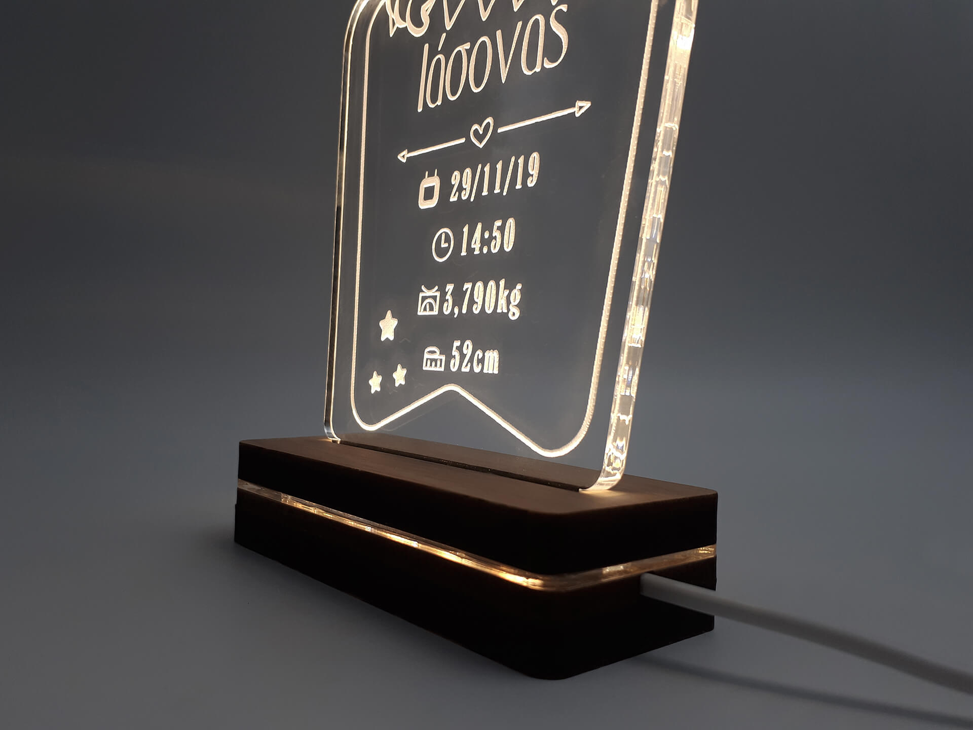 • Υλικά: Led λευκού χρώματος, Ακρυλικό διάφανο πάχους 6mm, Χειροποίητη βάση από ξύλο και ακρυλικό