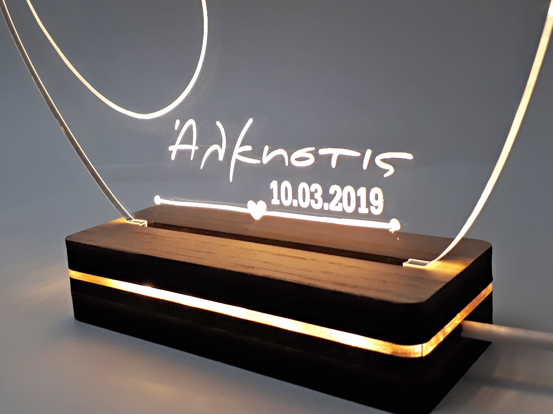 • Υλικά: Led λευκού χρώματος, Ακρυλικό διάφανο πάχους 6mm, Χειροποίητη βάση από ξύλο και ακρυλικό