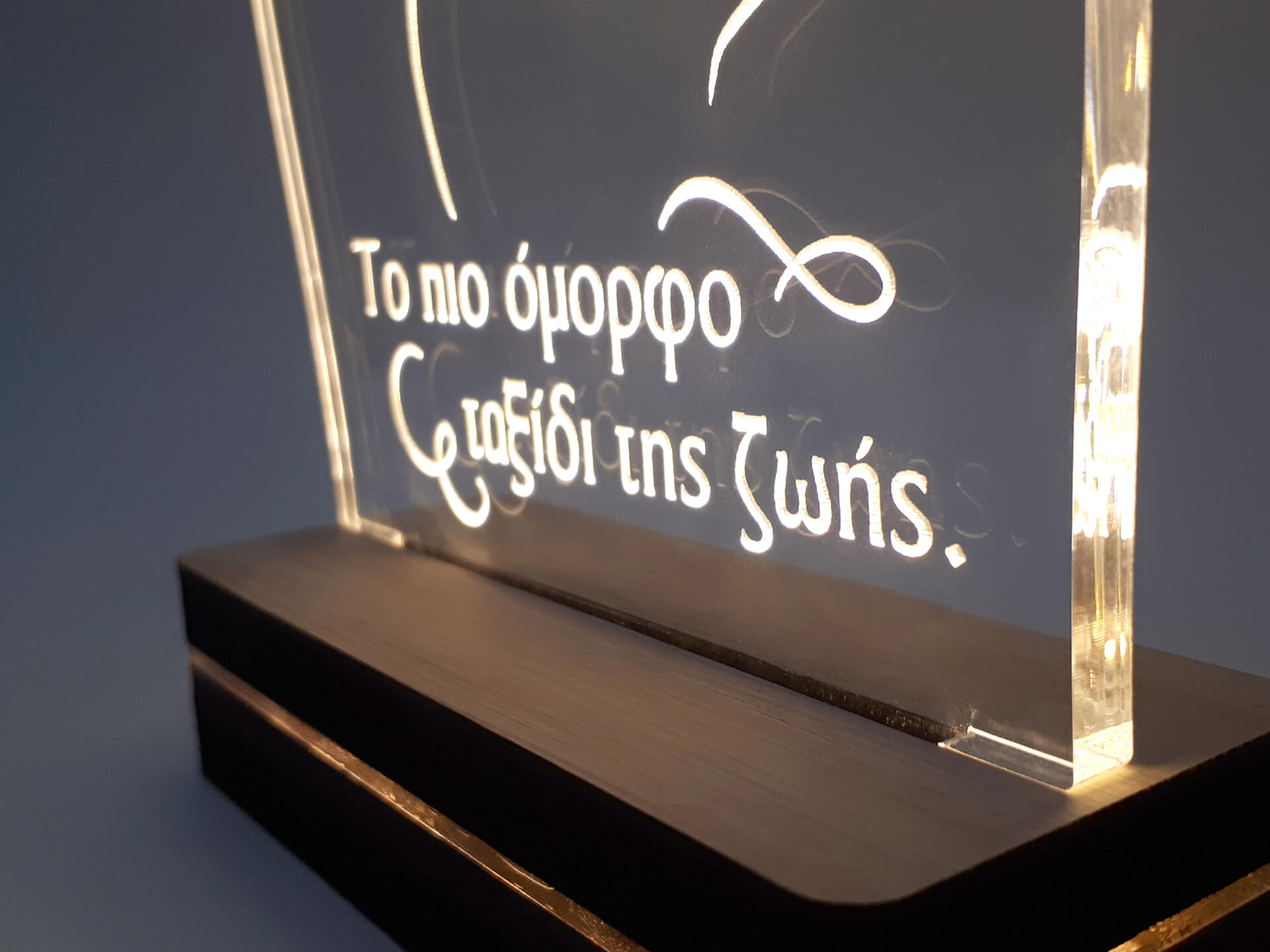 • Υλικά: Led λευκού χρώματος, Ακρυλικό διάφανο πάχους 6mm, Χειροποίητη βάση από ξύλο και ακρυλικό