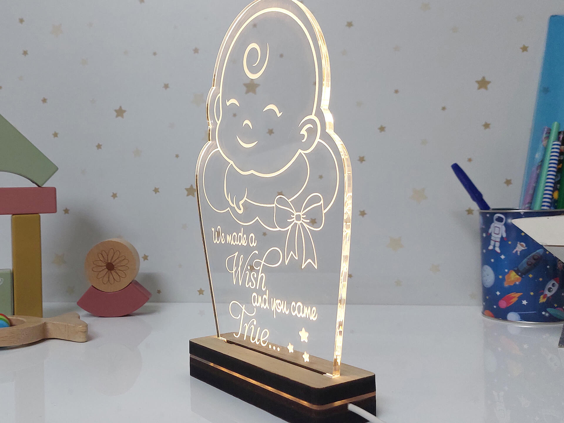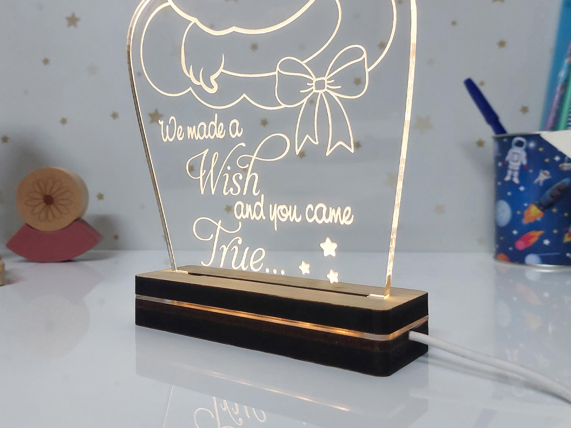 • Υλικά: Led λευκού χρώματος, Ακρυλικό διάφανο πάχους 6mm, Χειροποίητη βάση από ξύλο και ακρυλικό