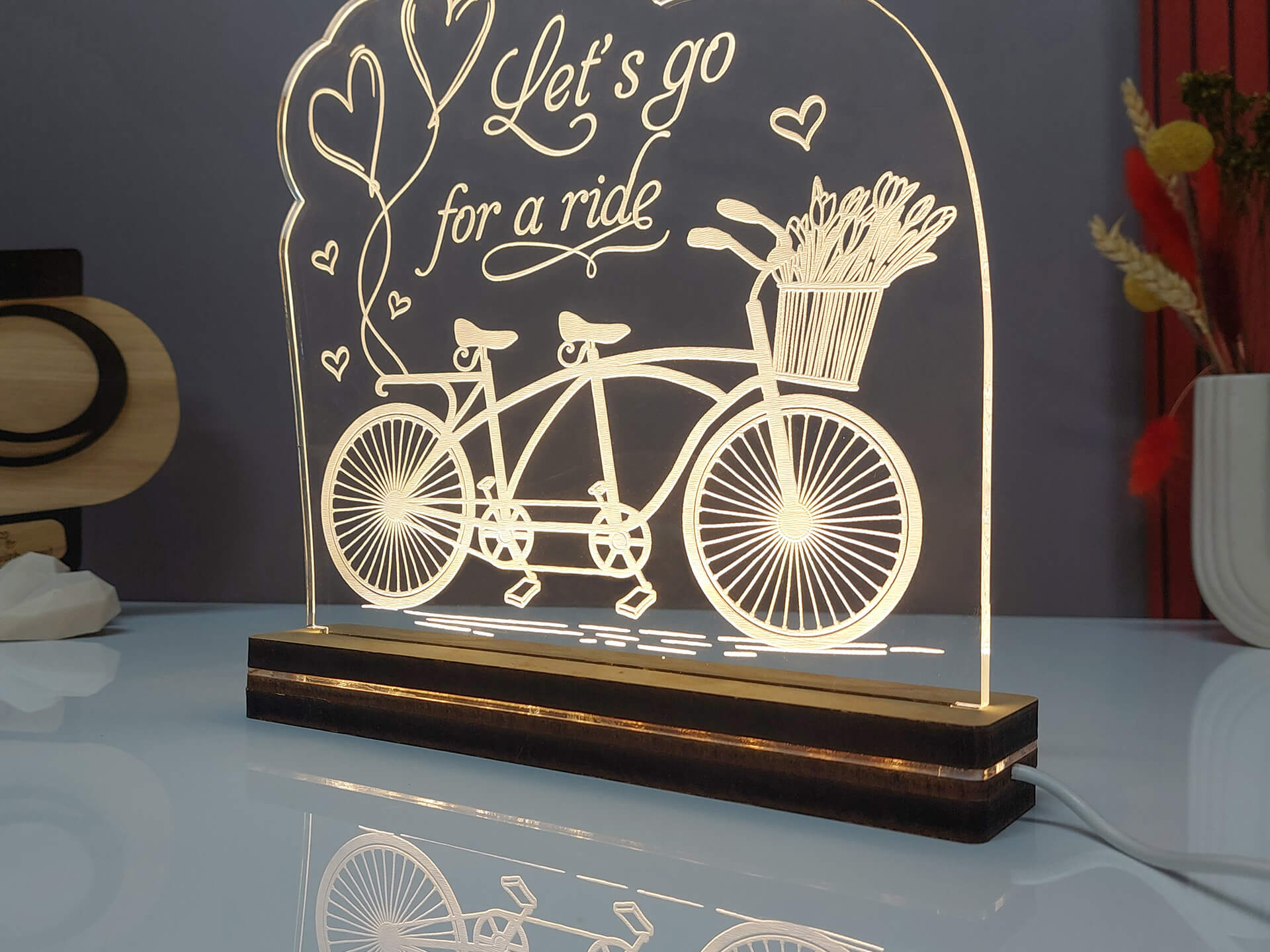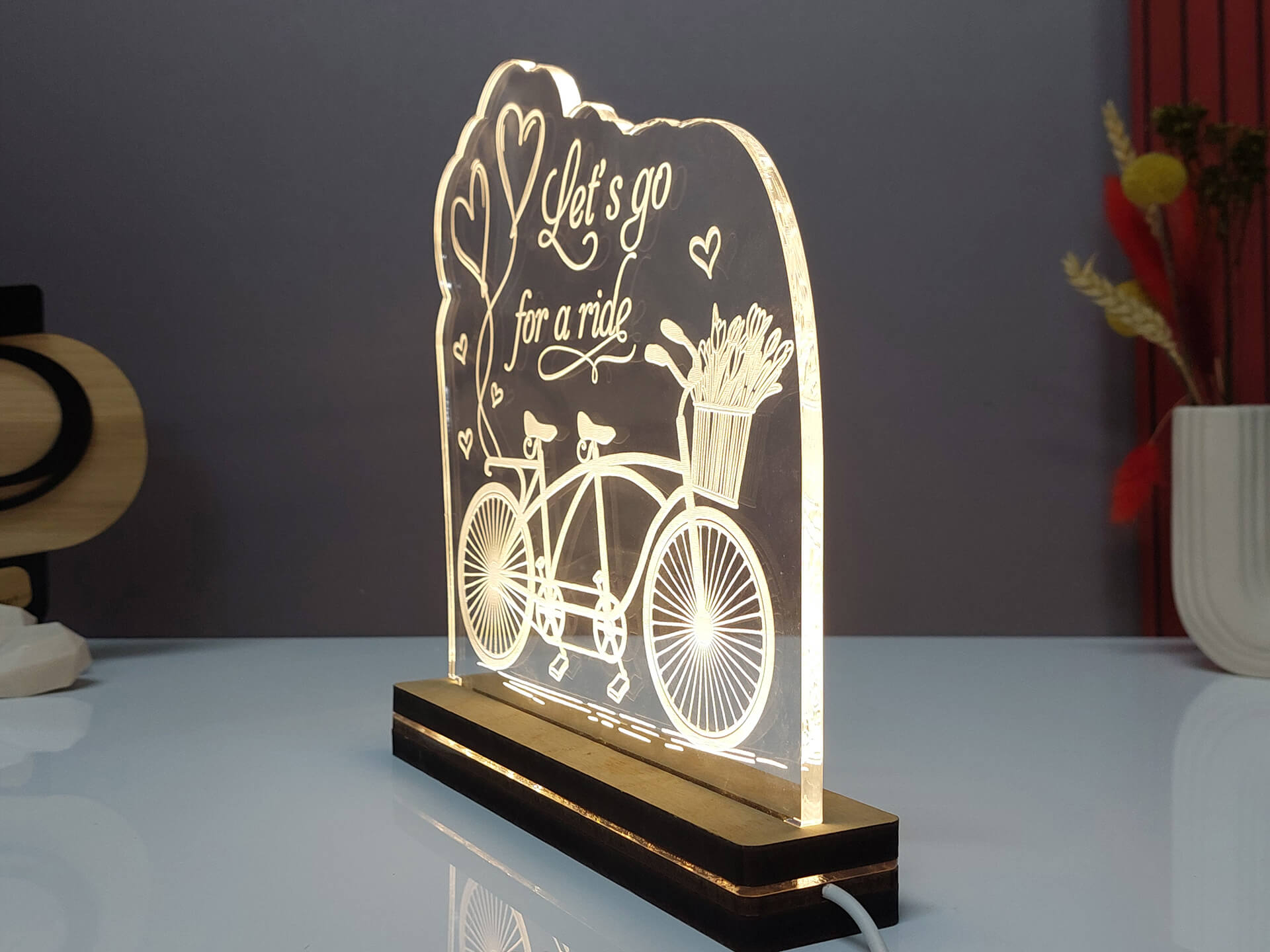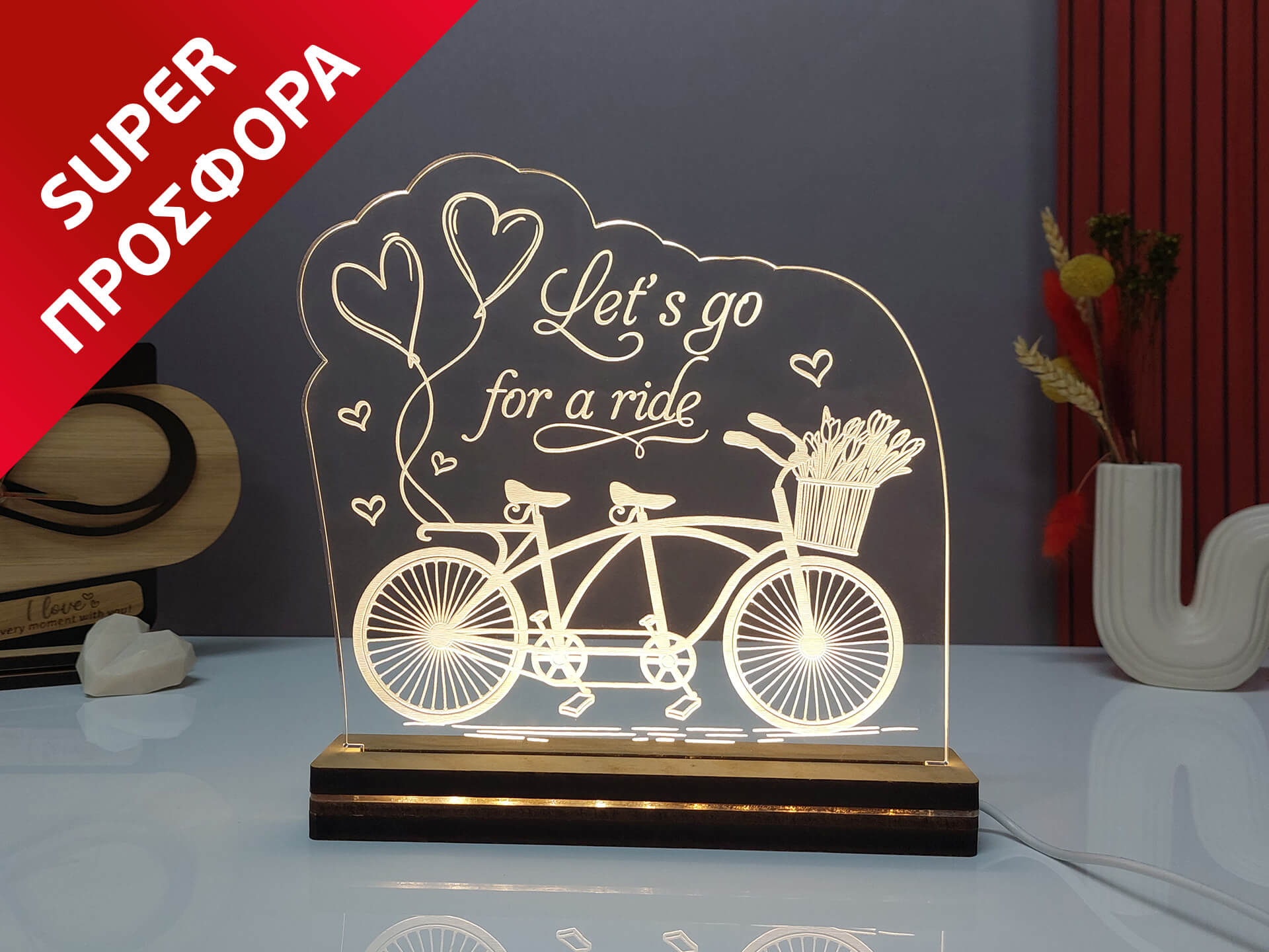 • Υλικά: Led λευκού χρώματος, Ακρυλικό διάφανο πάχους 6mm, Χειροποίητη βάση από ξύλο και ακρυλικό